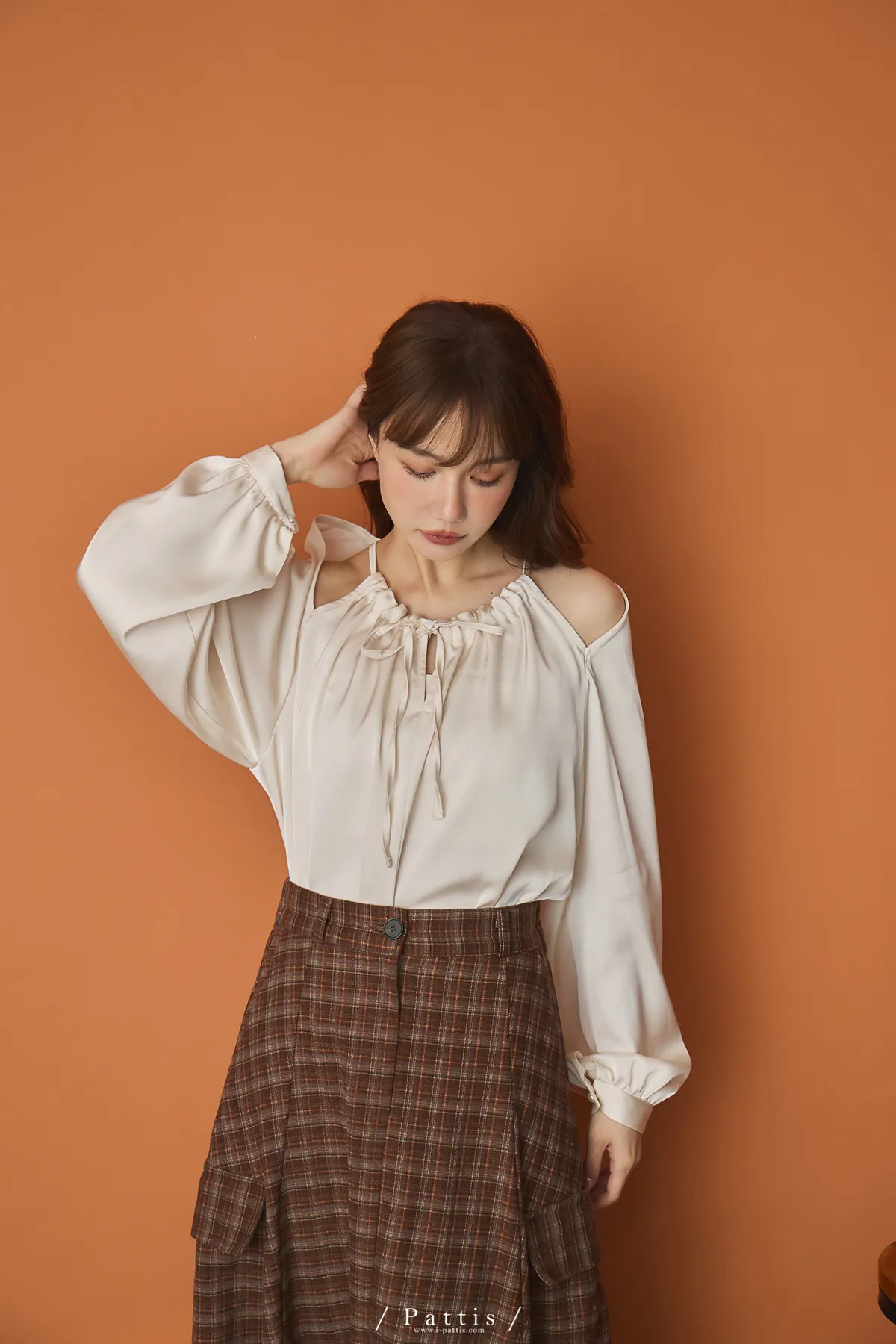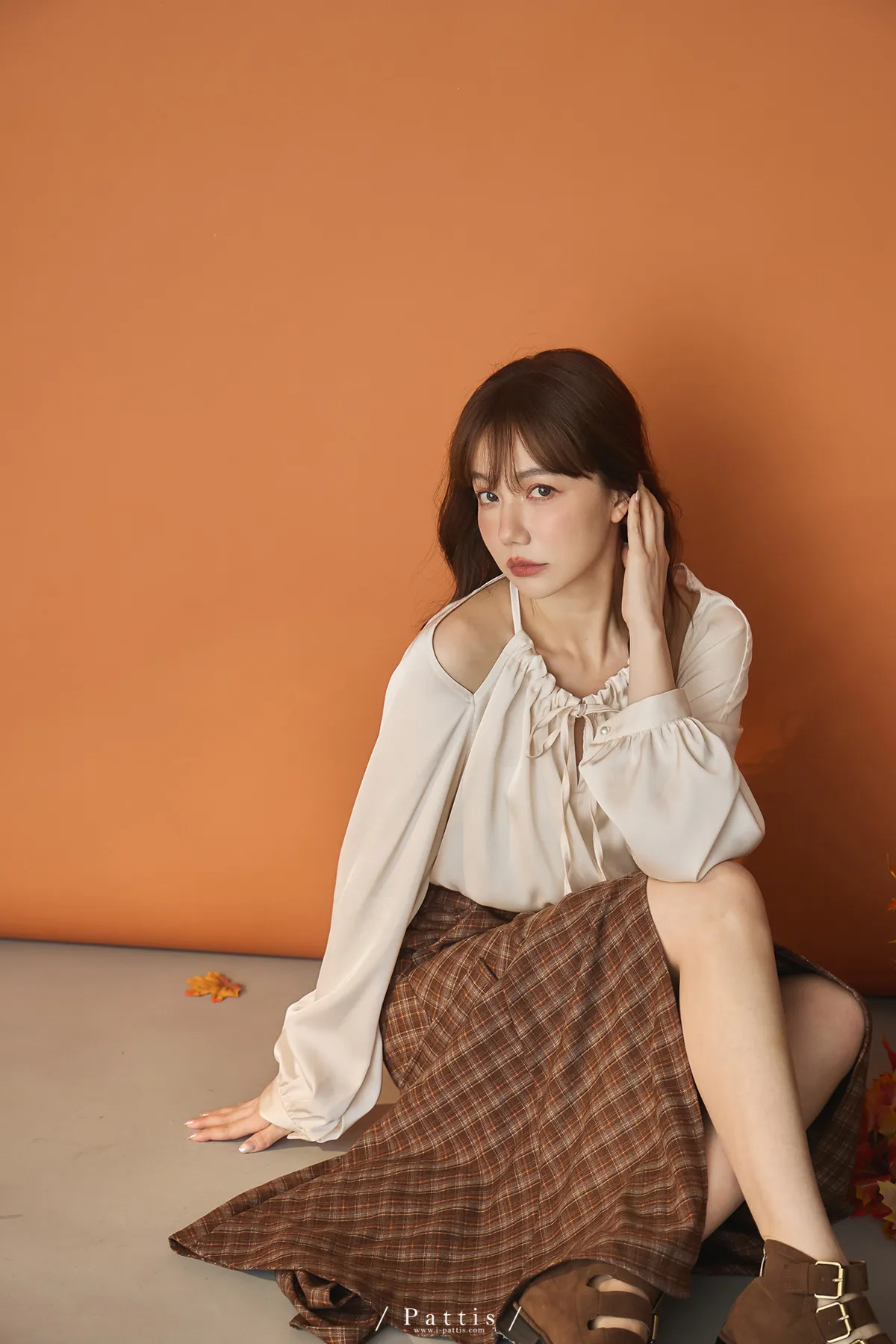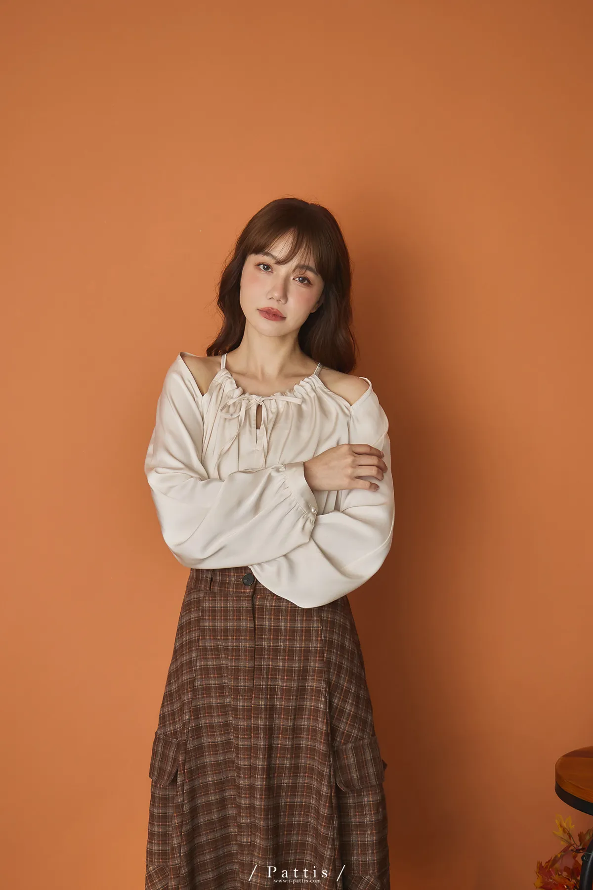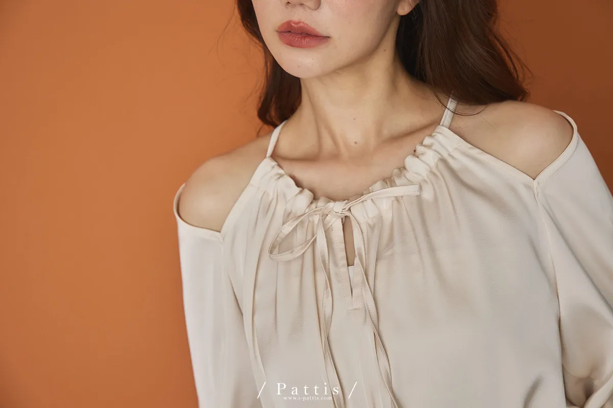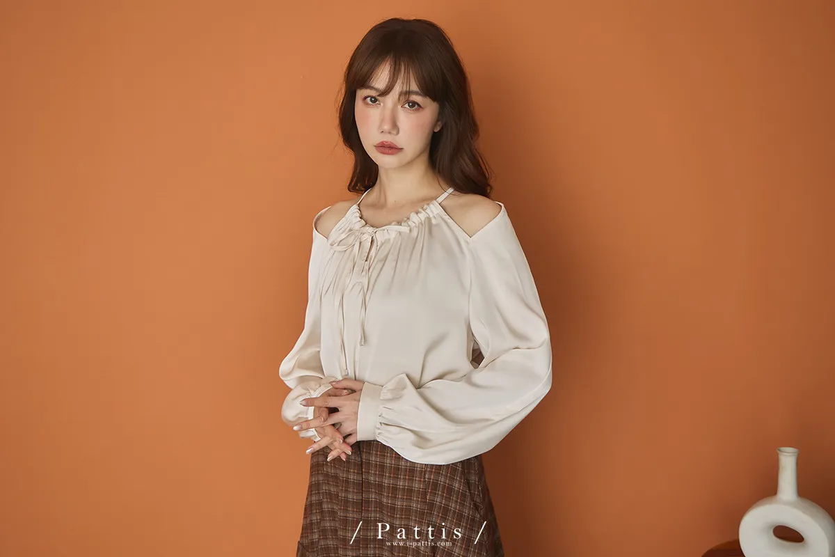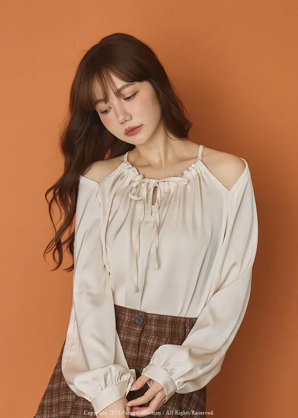 無從收斂的感性 | 附鍊條抽繩2way挖肩光澤上衣(香檳杏)