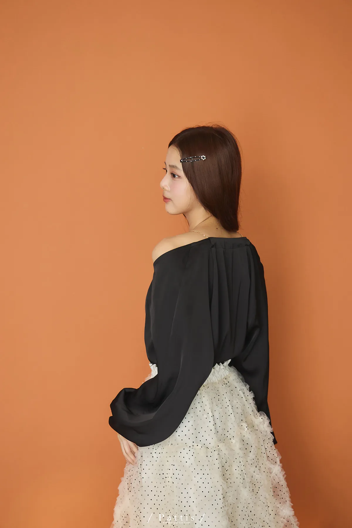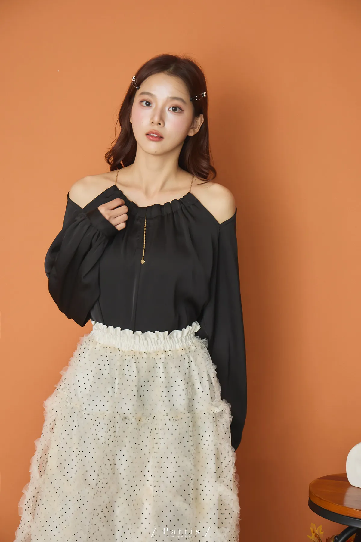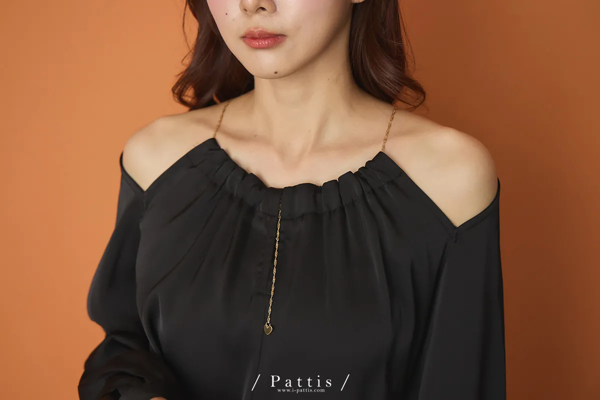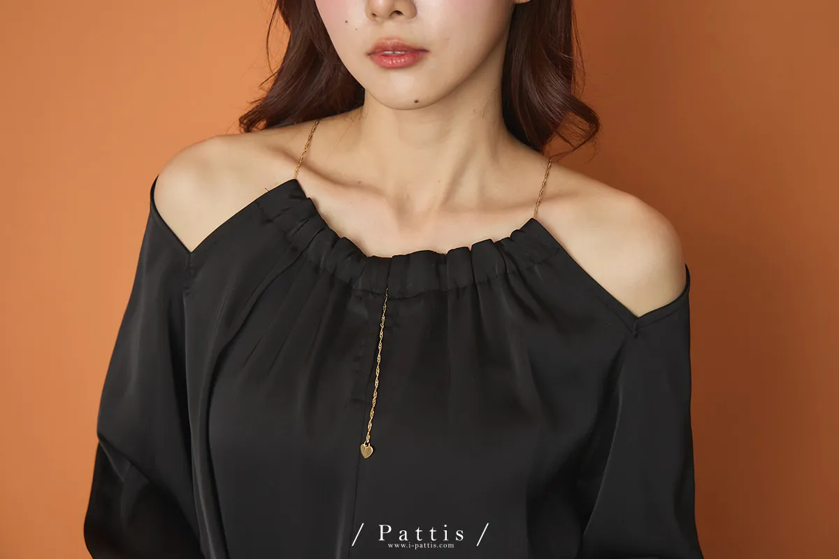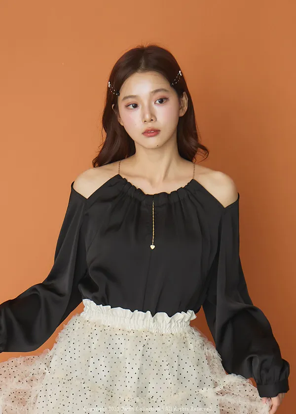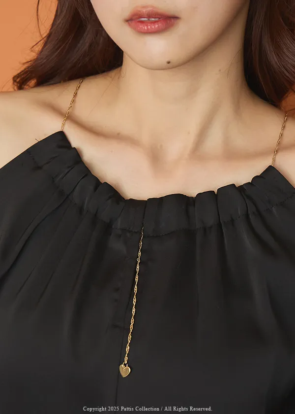 無從收斂的感性 | 附鍊條抽繩2way挖肩光澤上衣(黑)