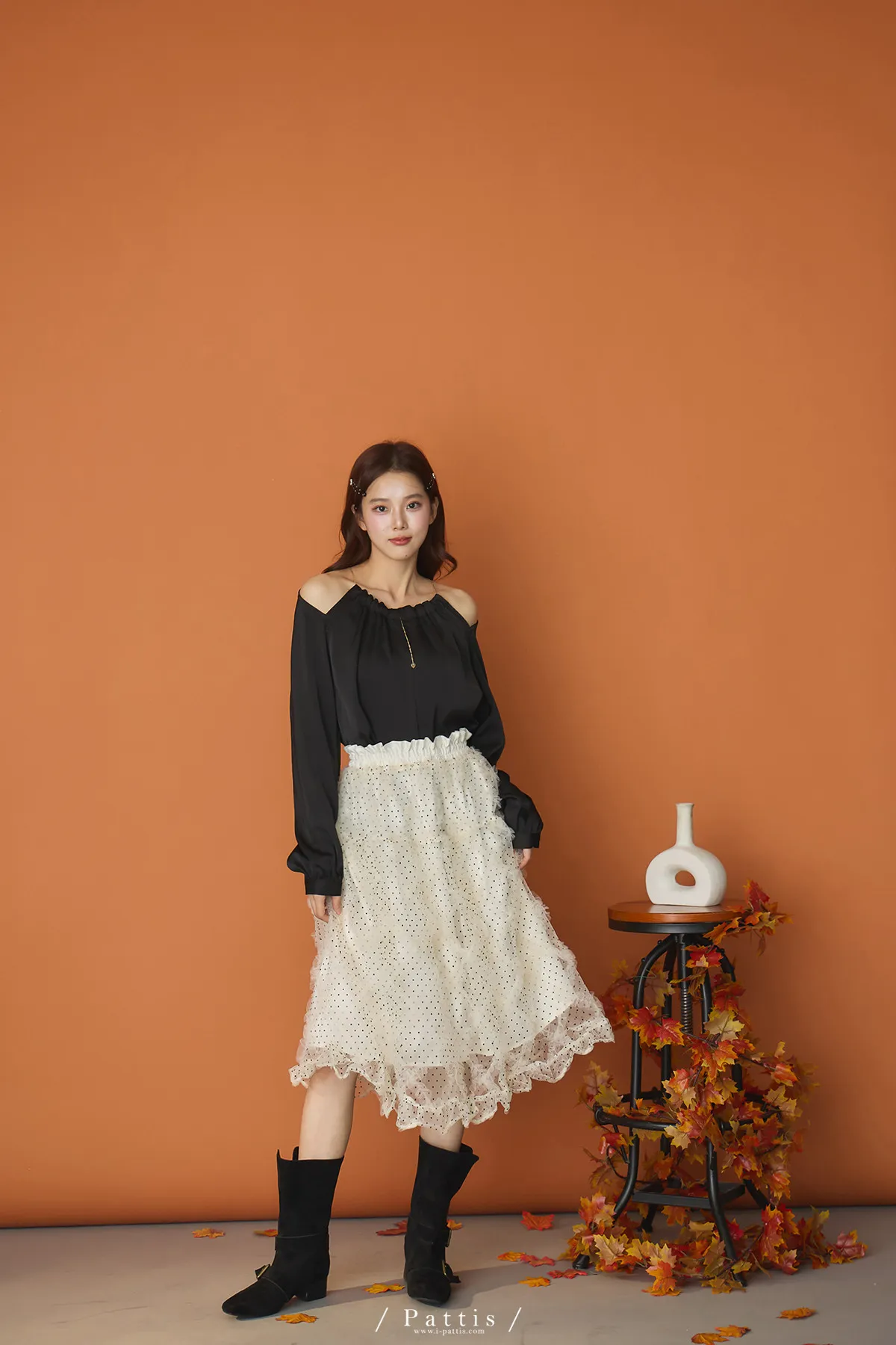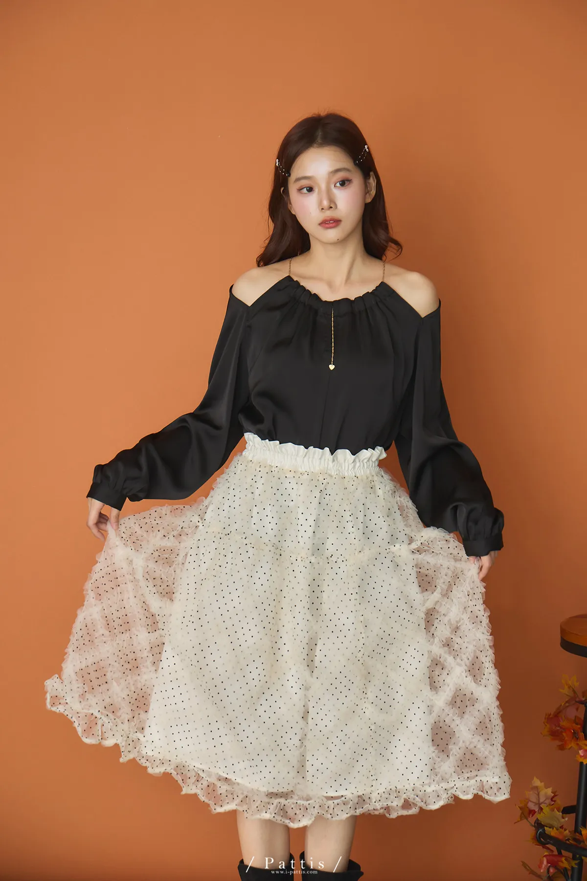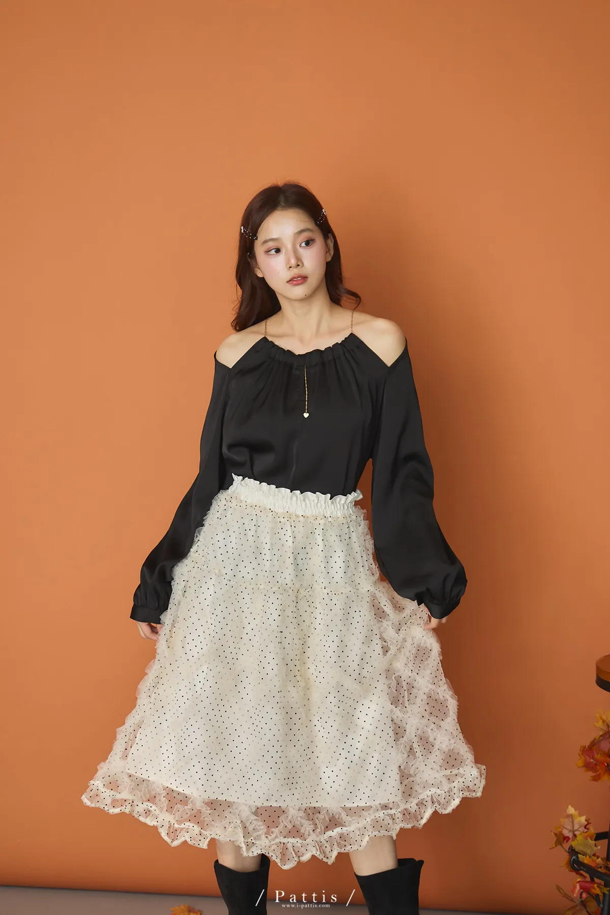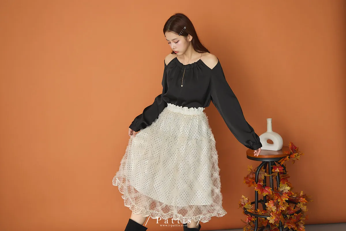 無從收斂的感性 | 附鍊條抽繩2way挖肩光澤上衣(黑)