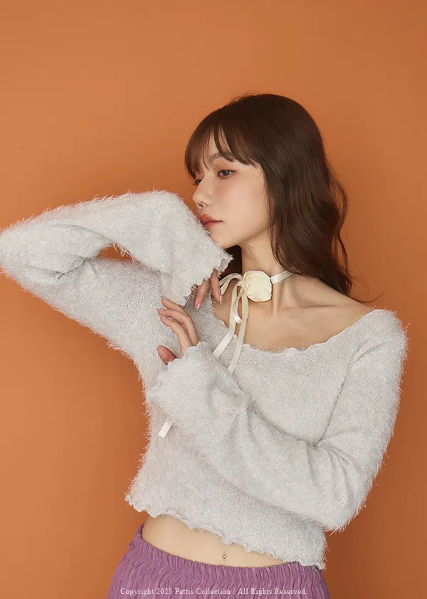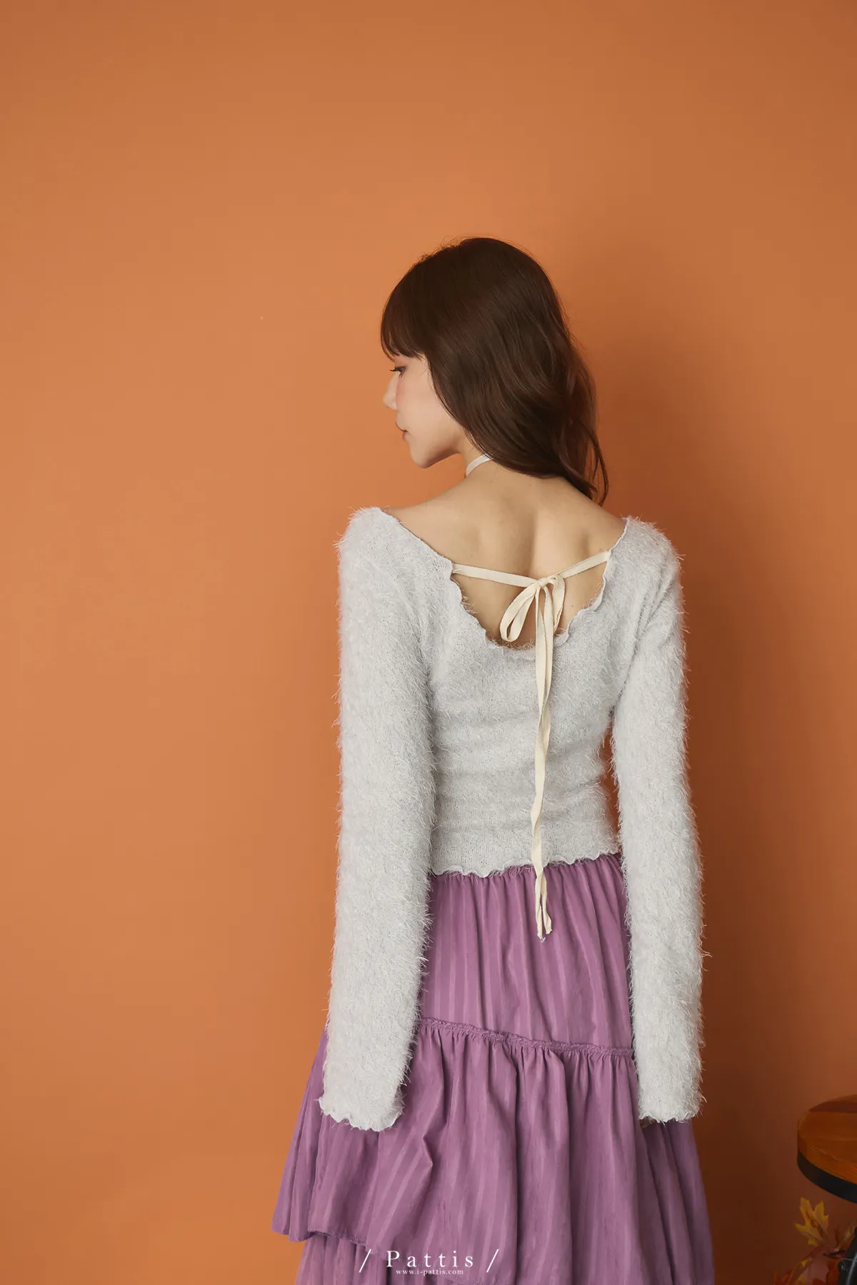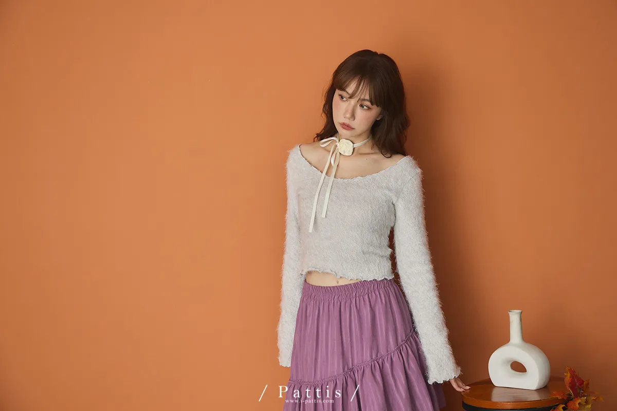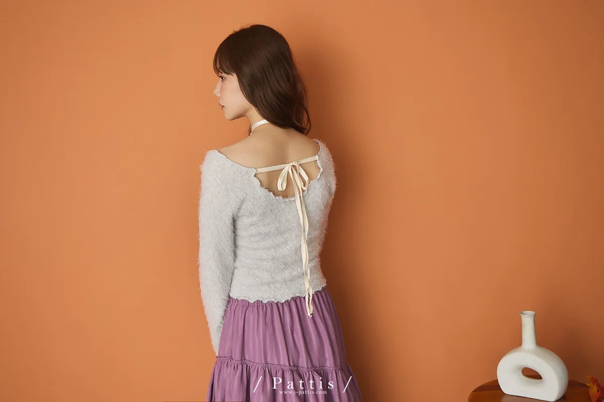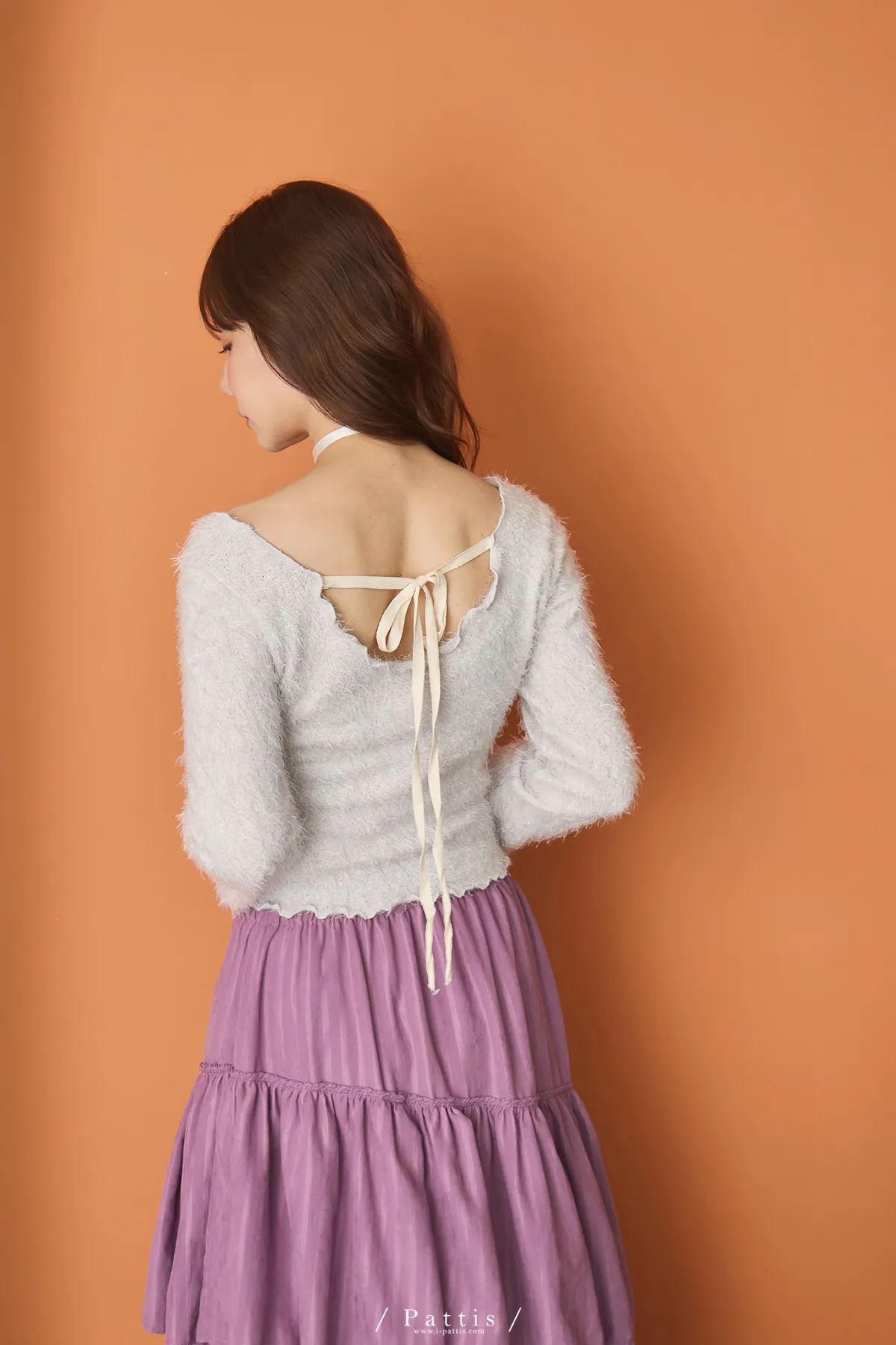 溫柔著煮每一杯茶 | 柔軟毛絨捲邊綁帶短版上衣(淺灰紫)