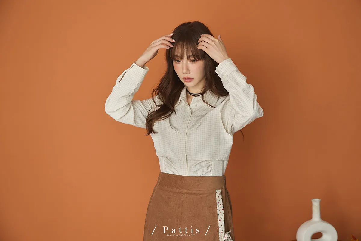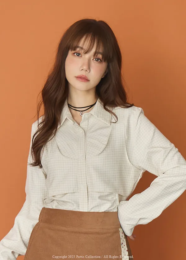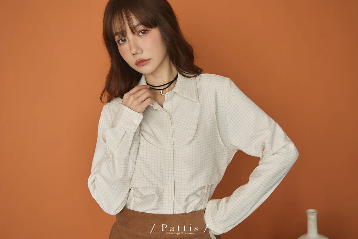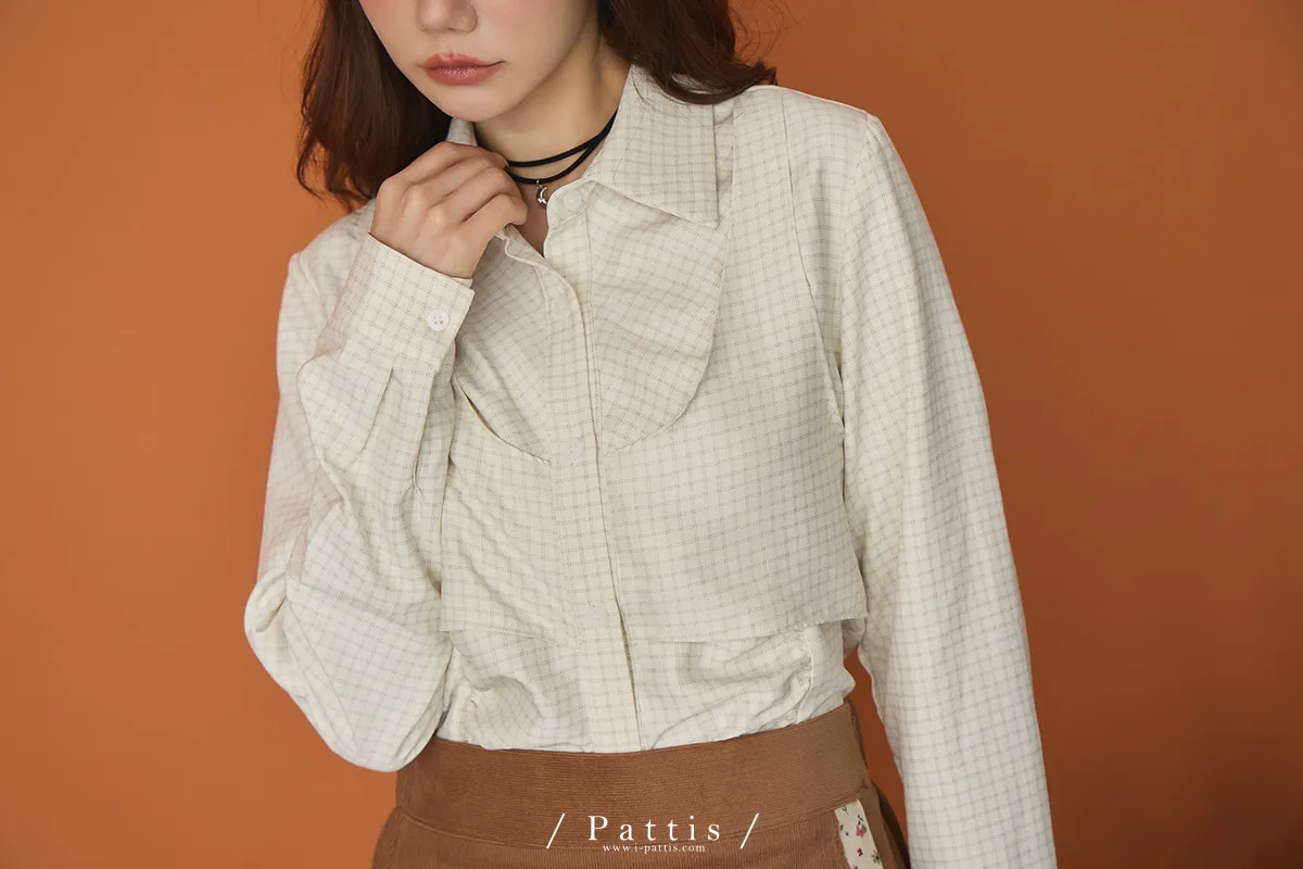 無草稿演說 | 細格紋假兩件背心長袖襯衫(米杏)
