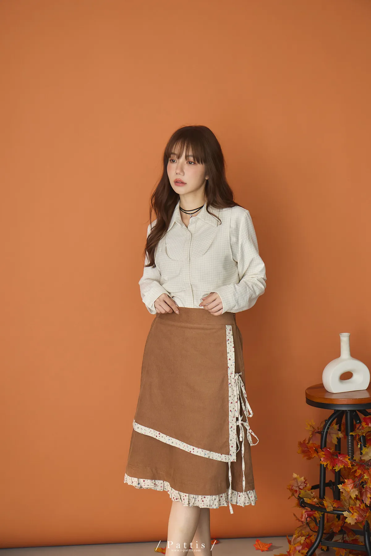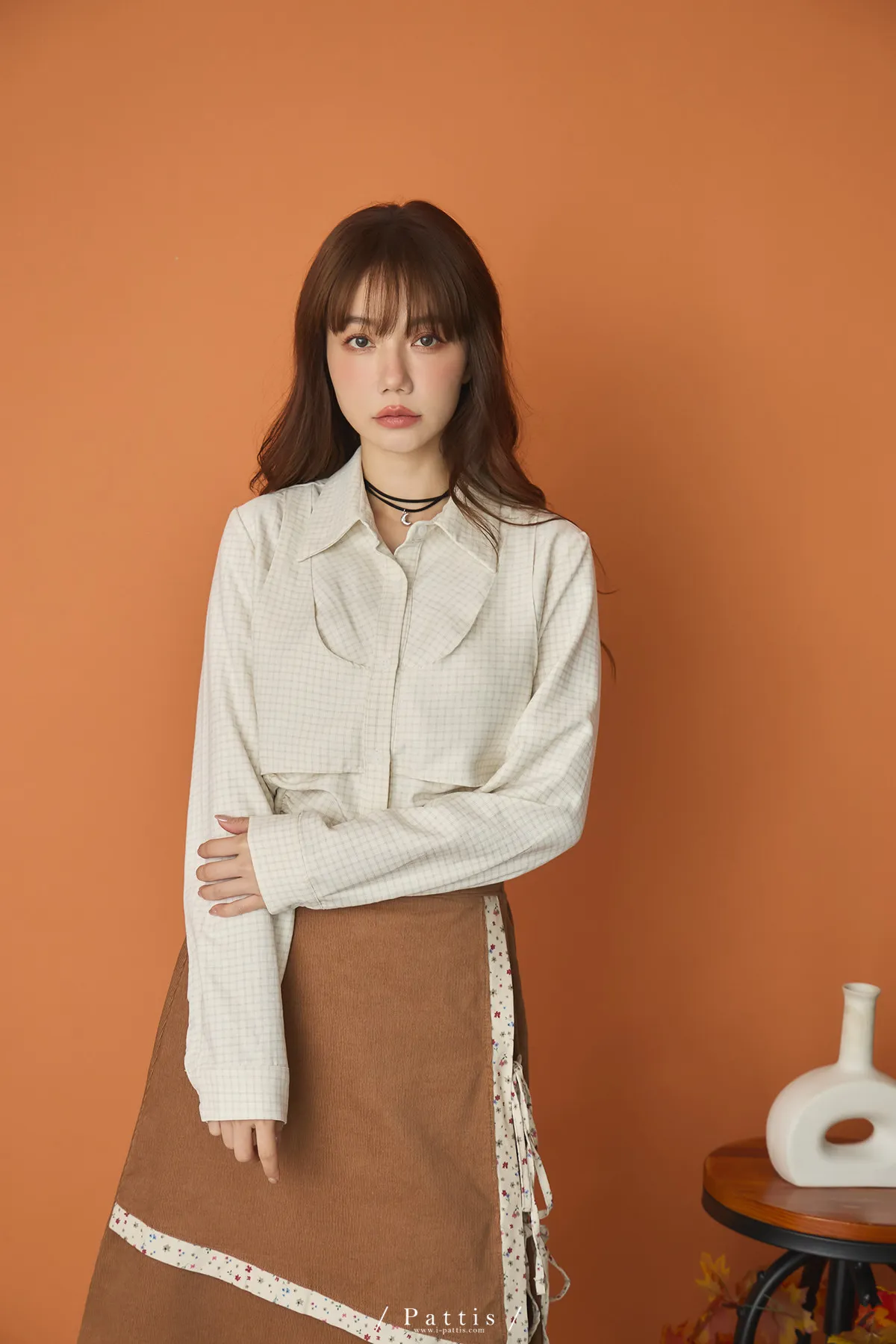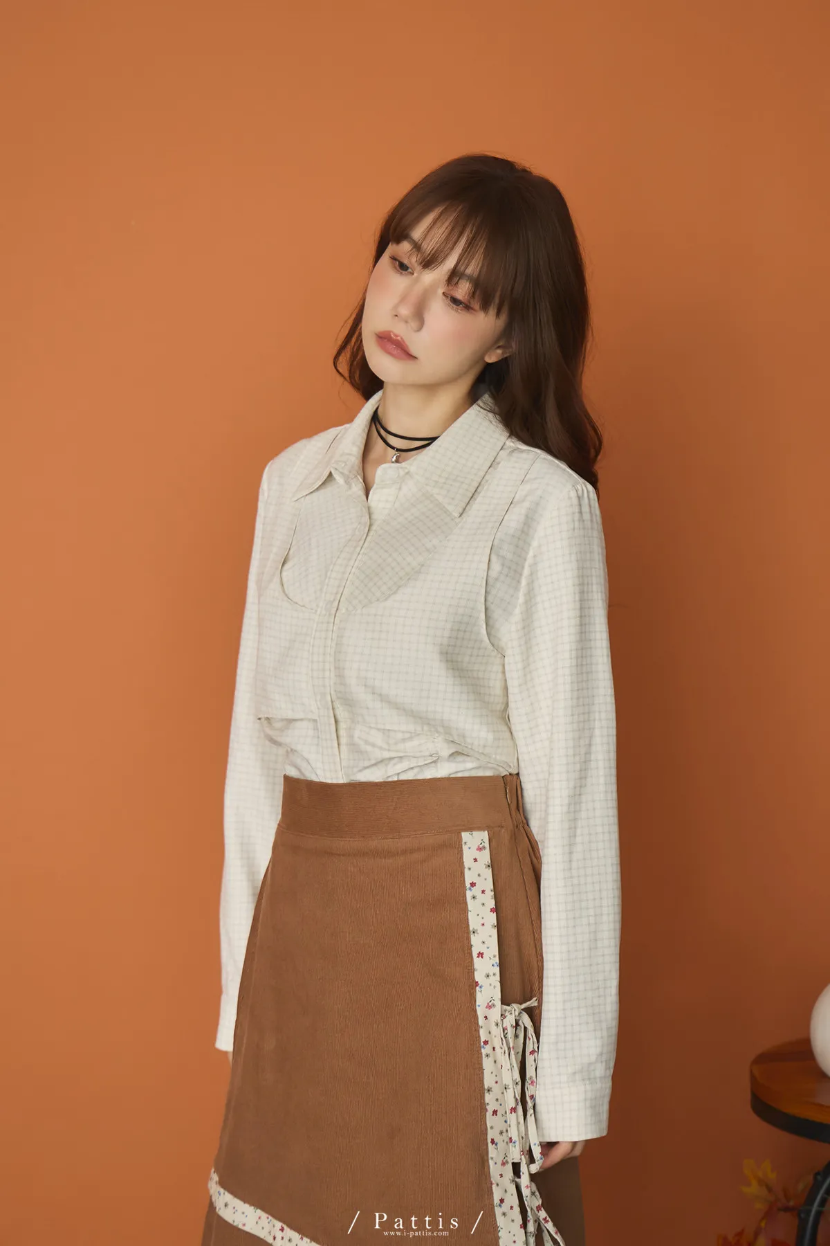 無草稿演說 | 細格紋假兩件背心長袖襯衫(米杏)