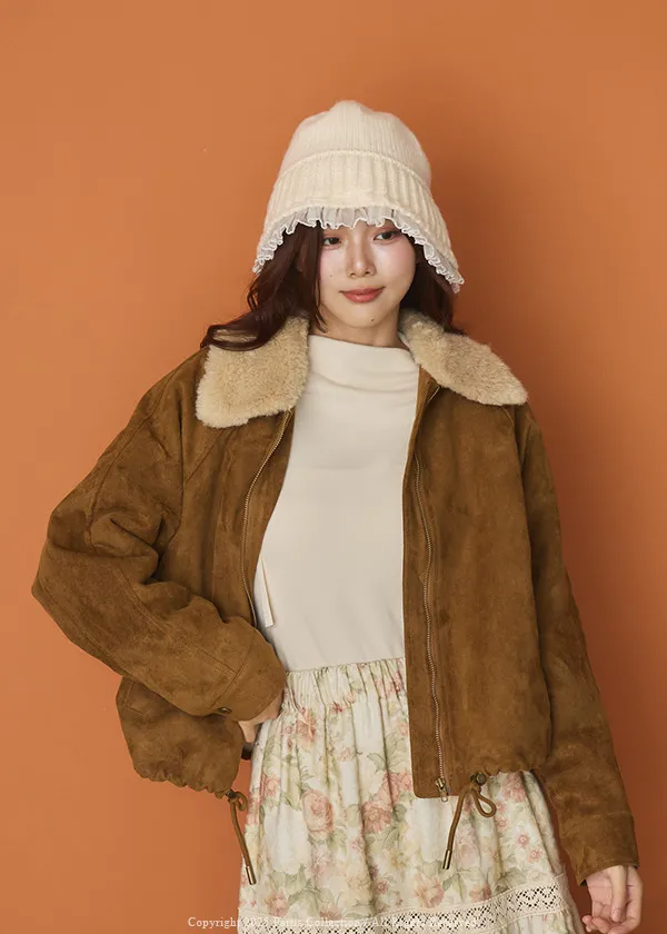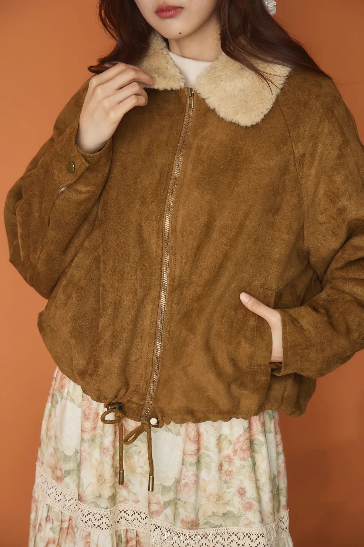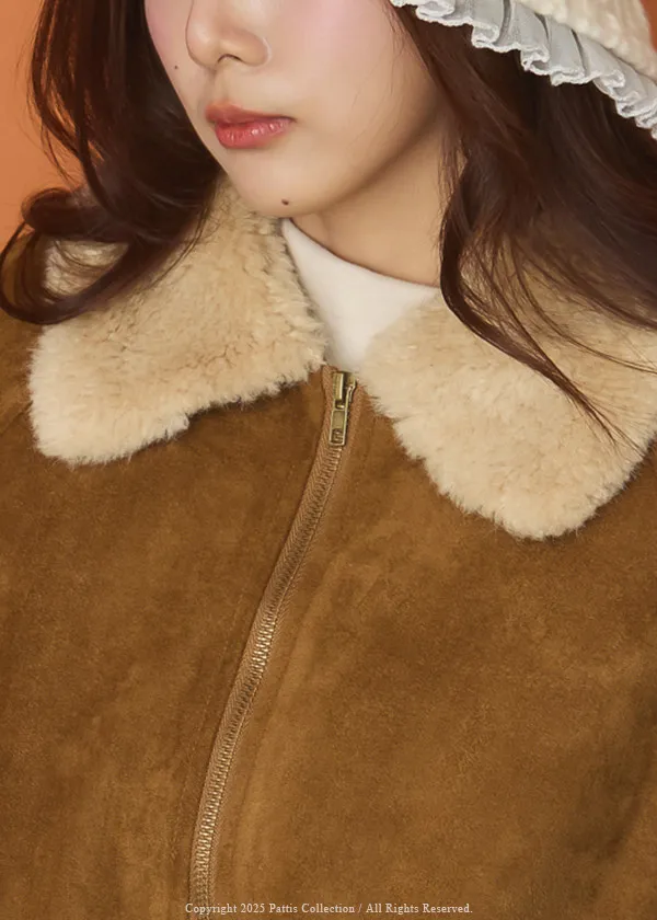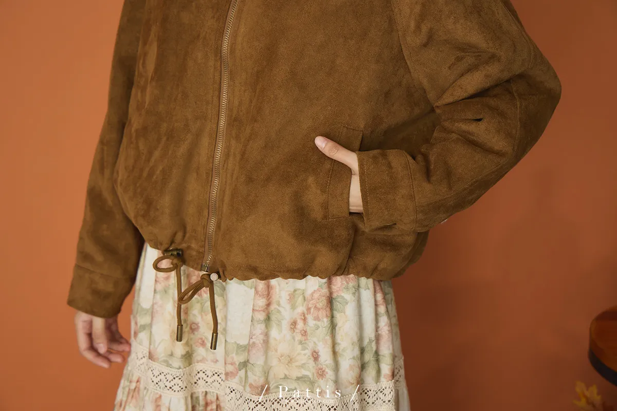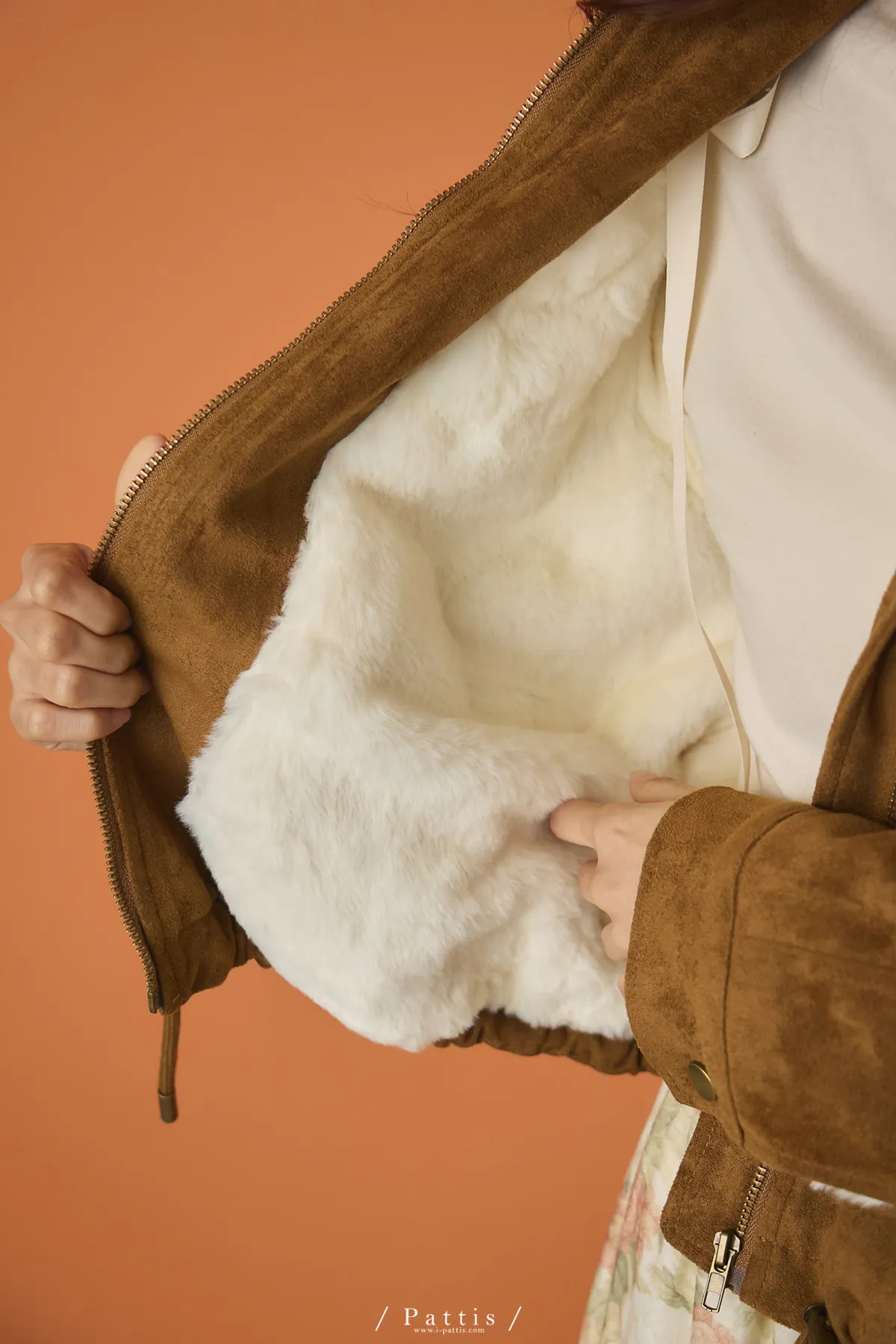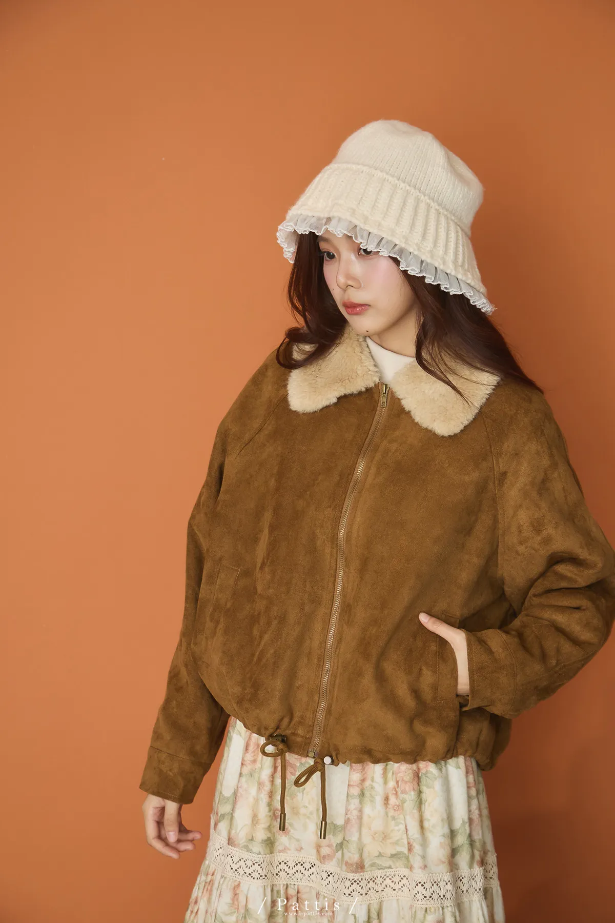 聽故事冬眠的泰迪 | 軟毛翻領麂皮絨拉鍊下抽繩外套(卡其)