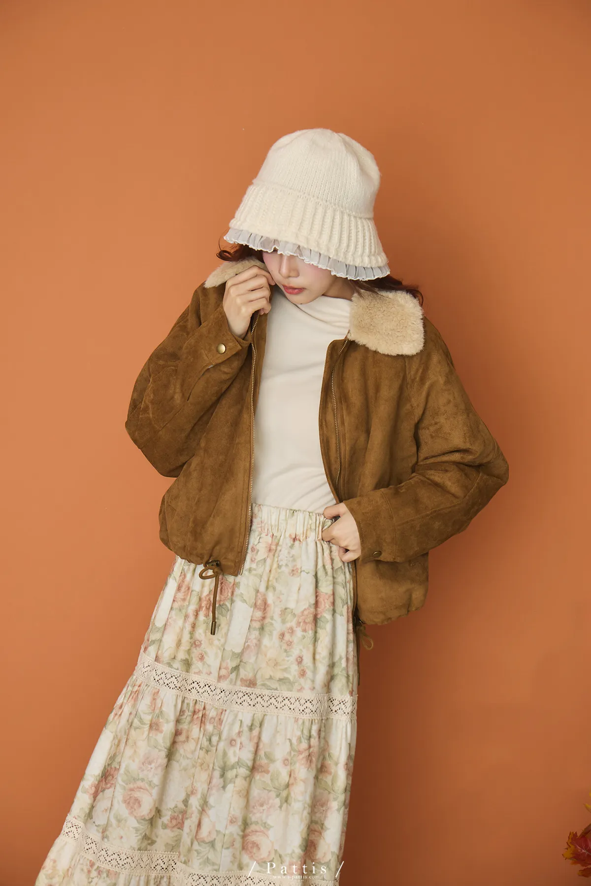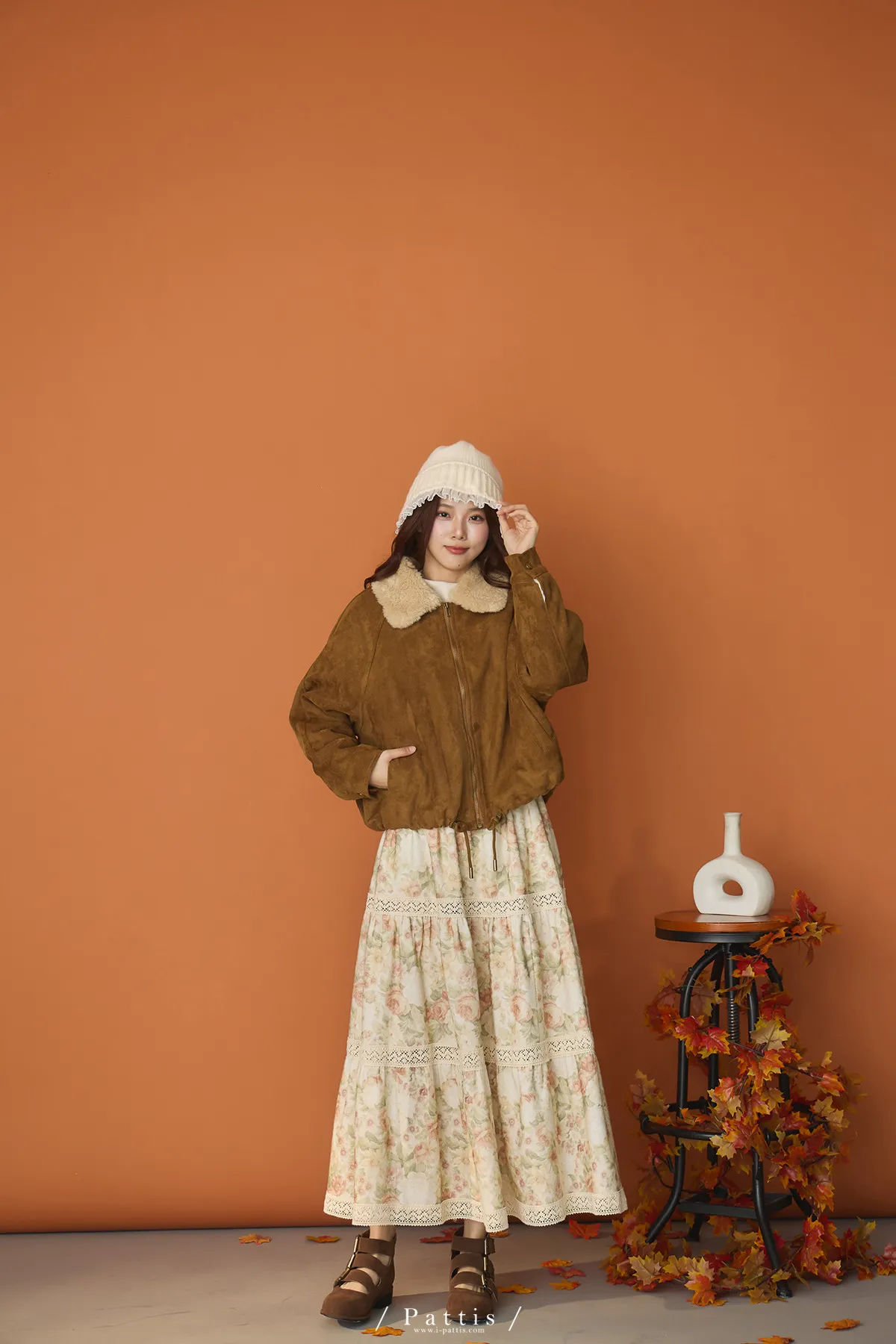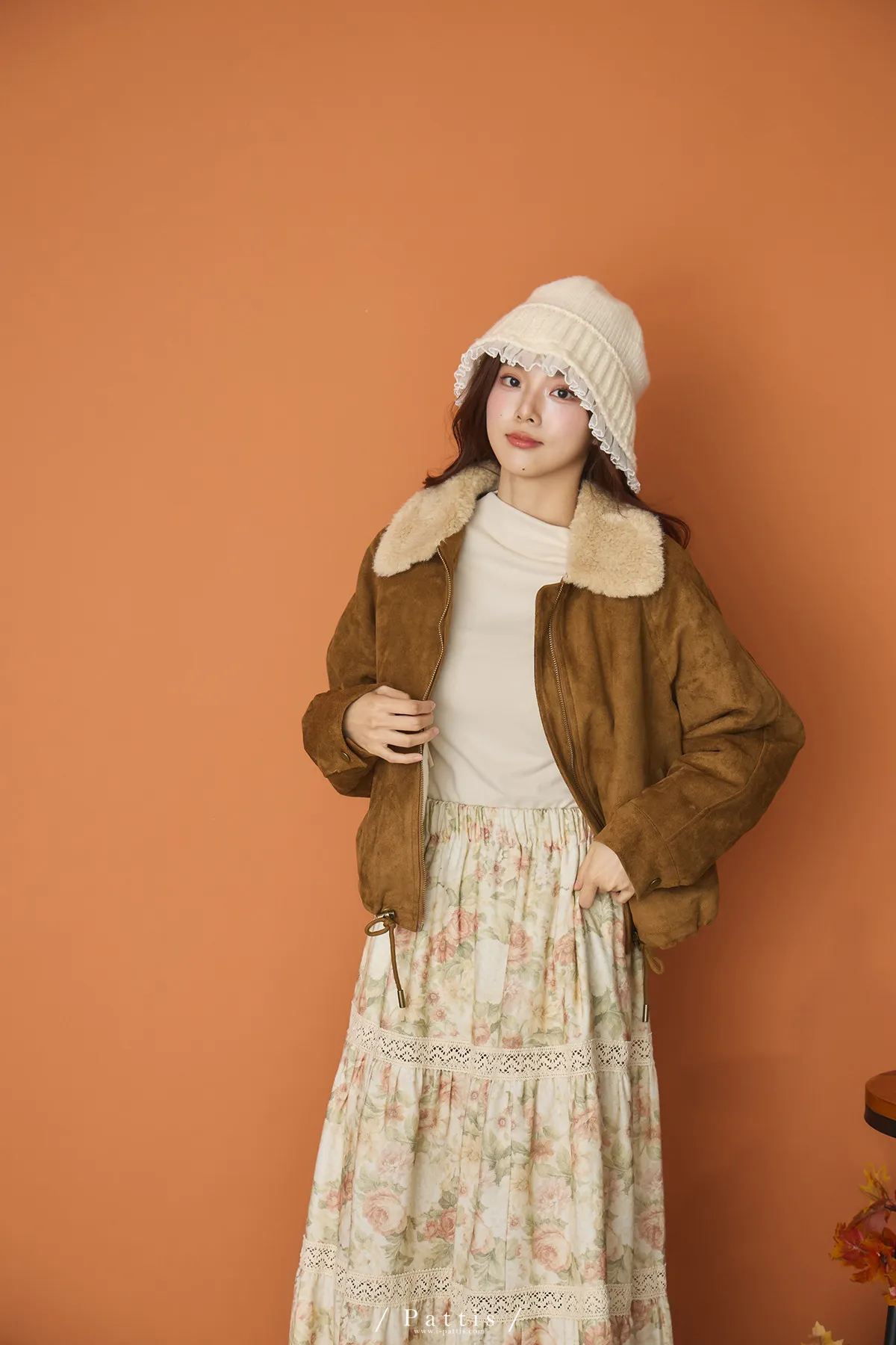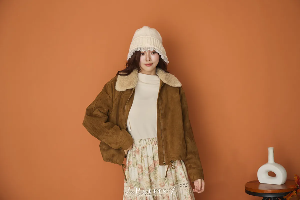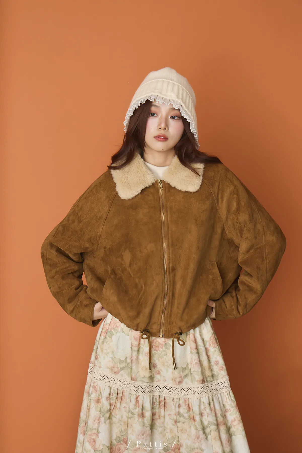 聽故事冬眠的泰迪 | 軟毛翻領麂皮絨拉鍊下抽繩外套(卡其)