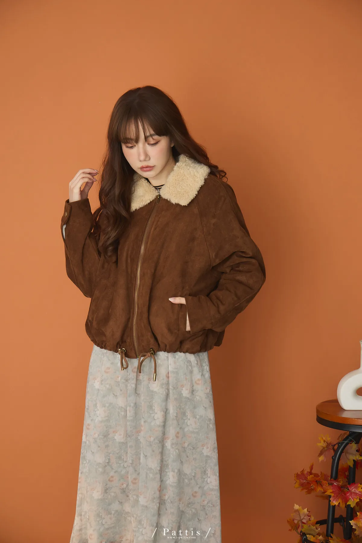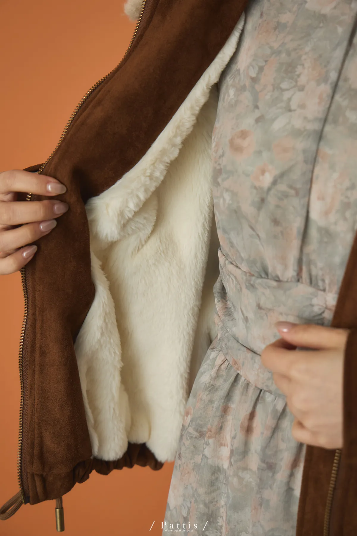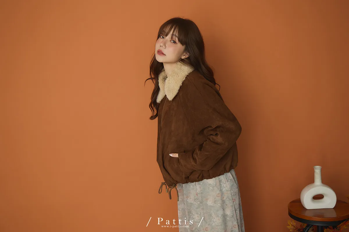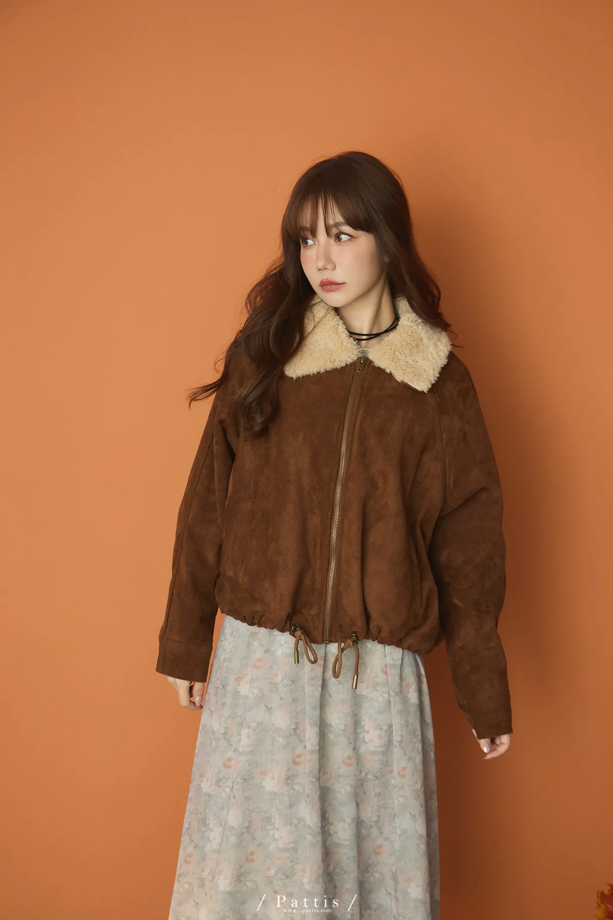 聽故事冬眠的泰迪 | 軟毛翻領麂皮絨拉鍊下抽繩外套(橘棕)