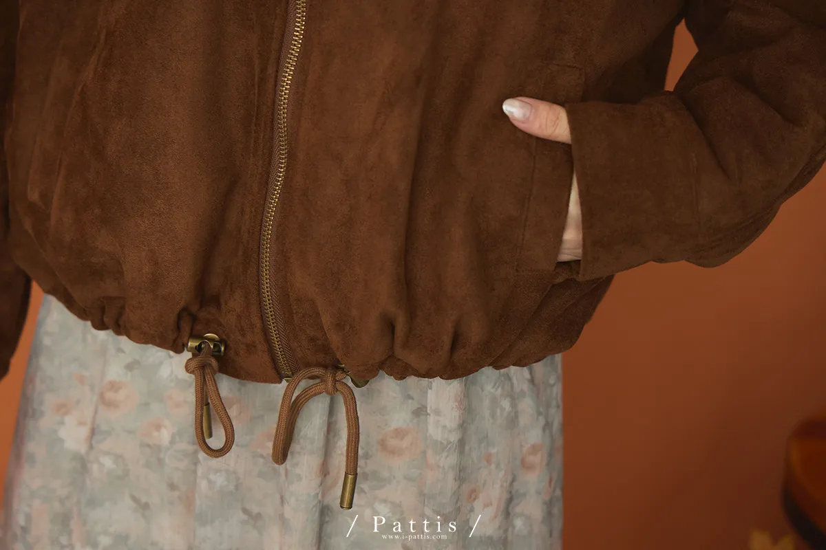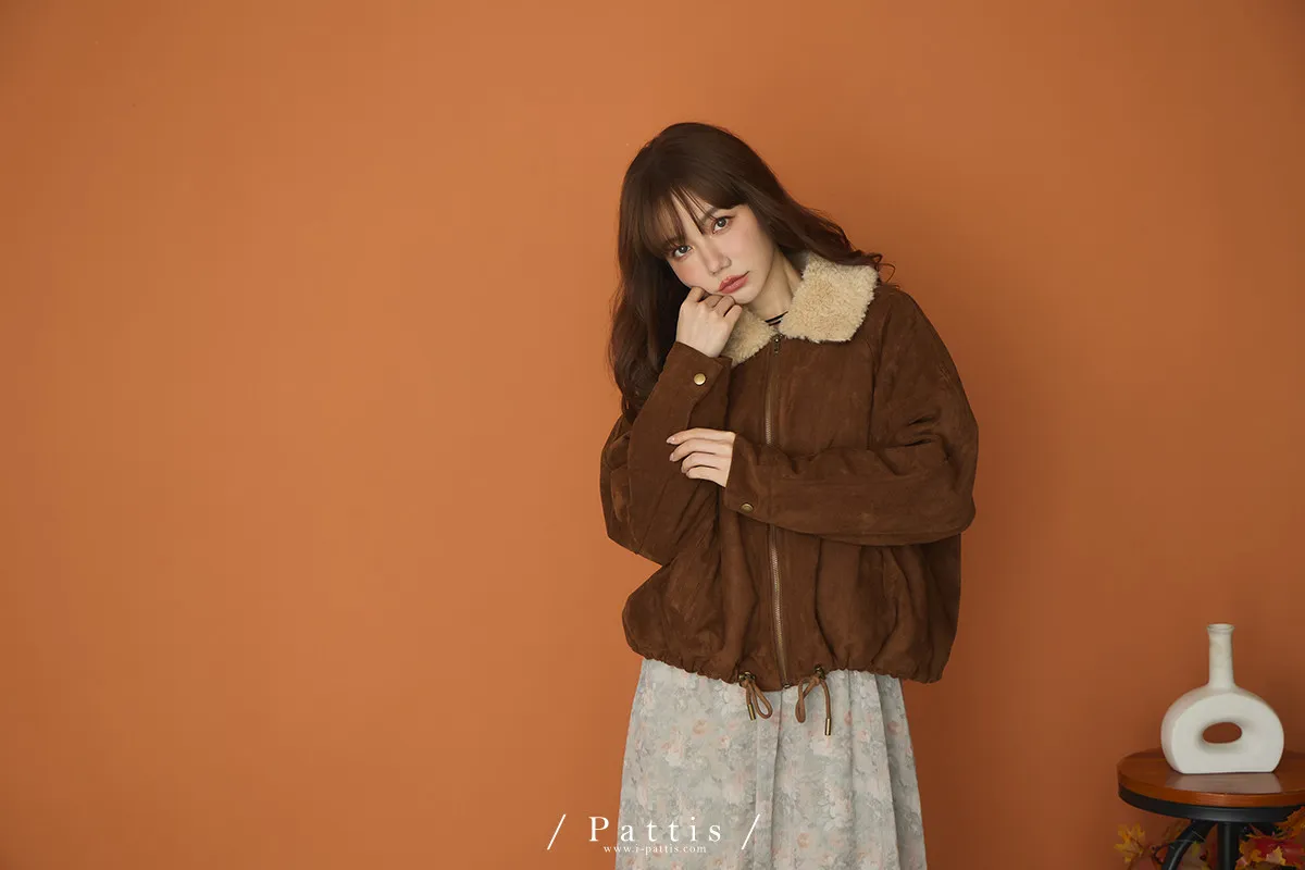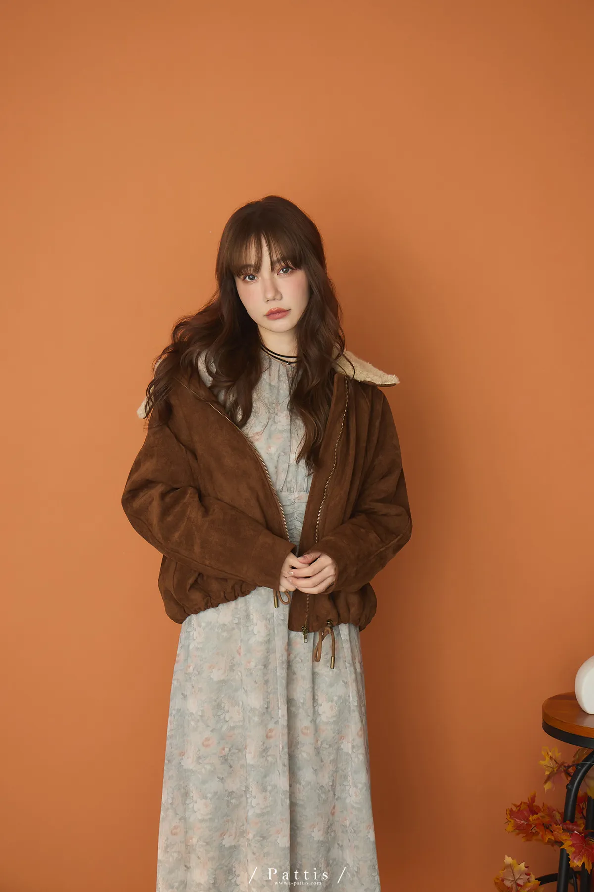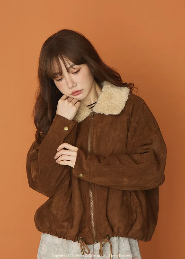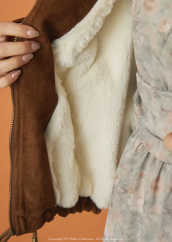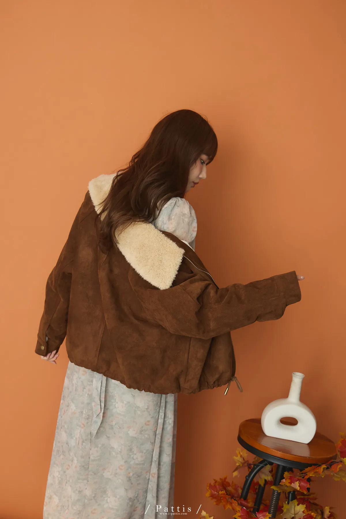 聽故事冬眠的泰迪 | 軟毛翻領麂皮絨拉鍊下抽繩外套(橘棕)