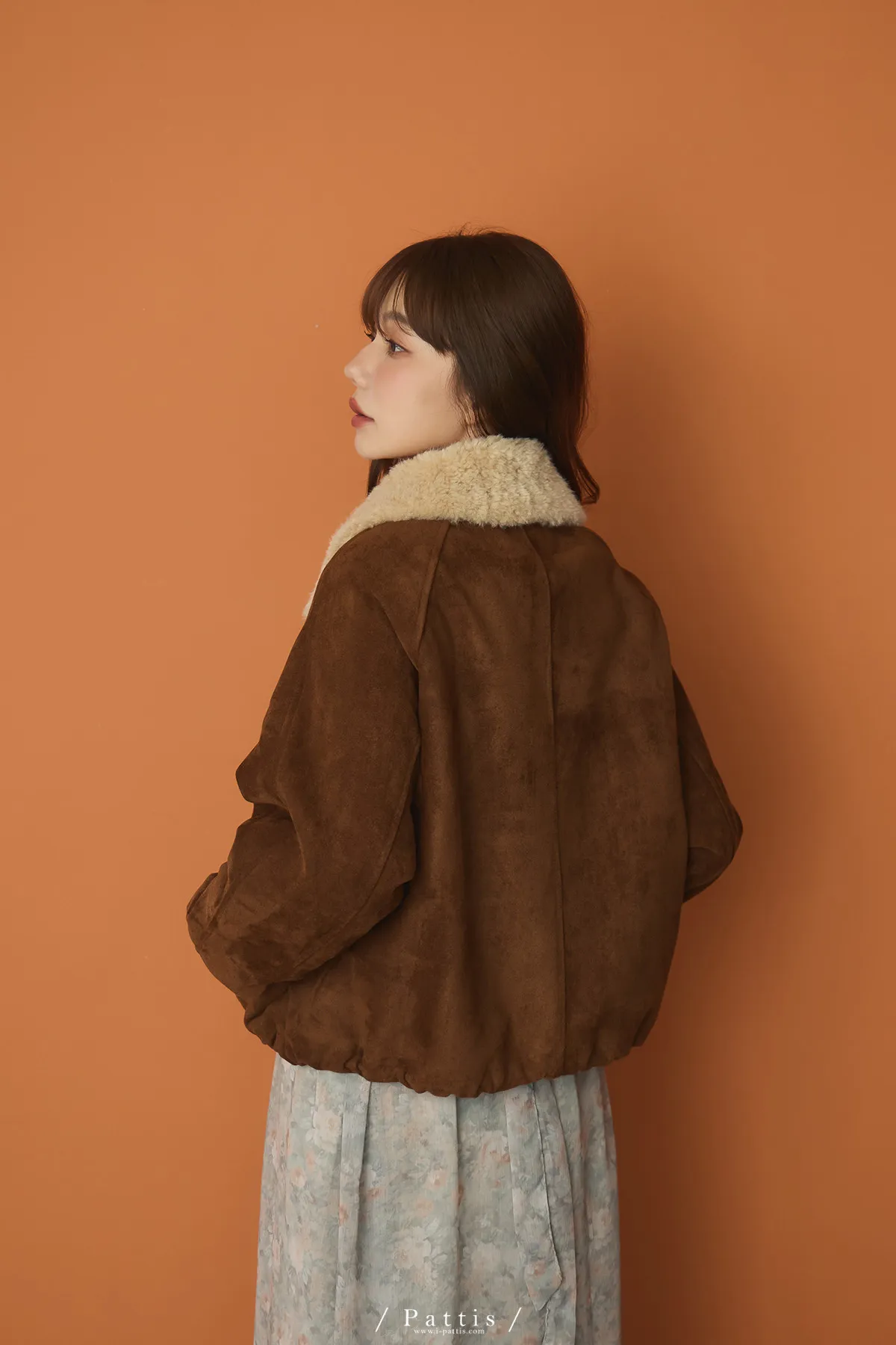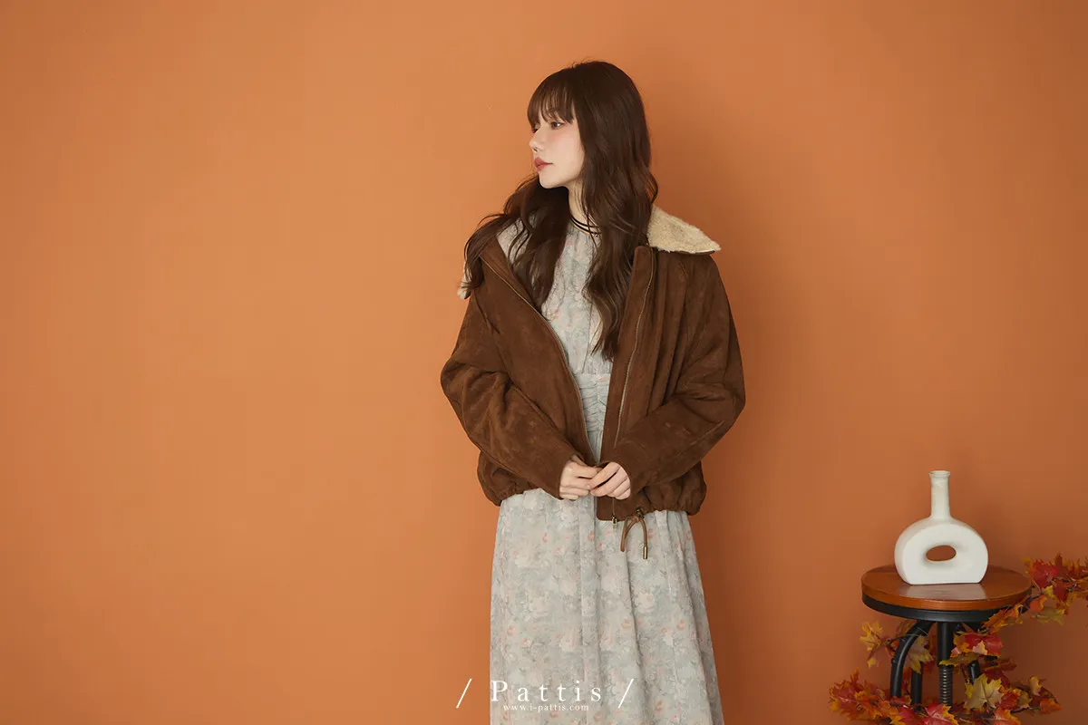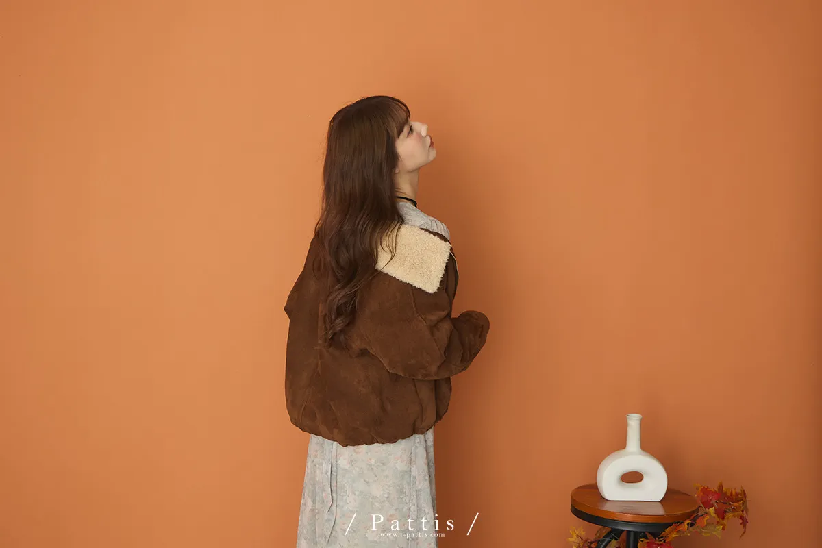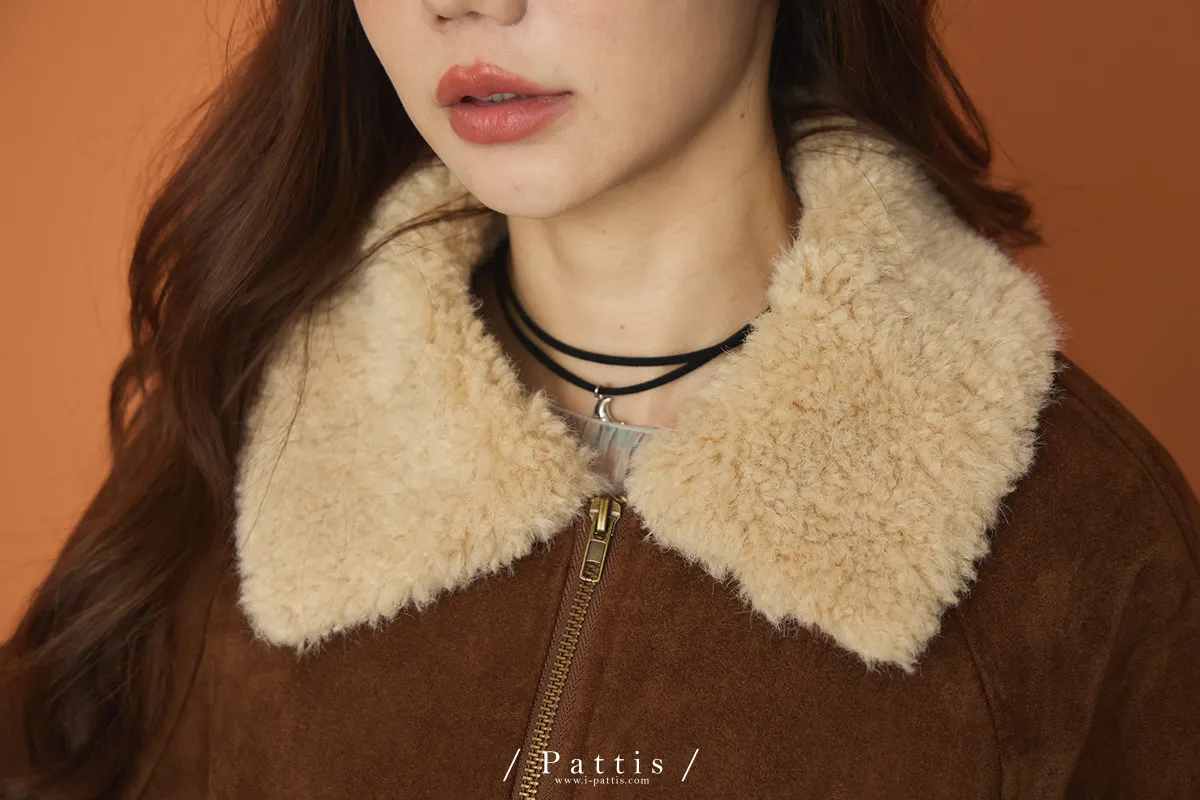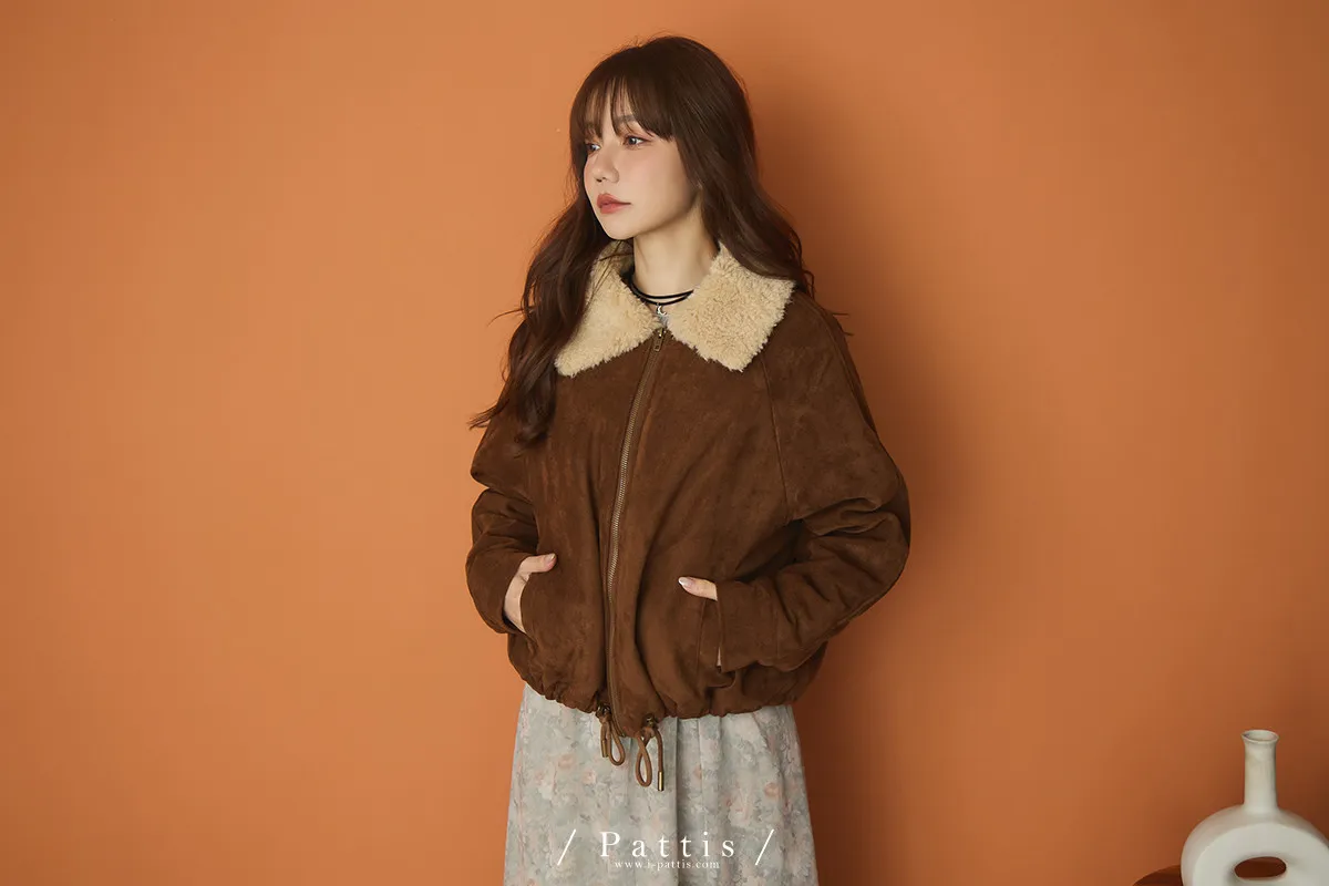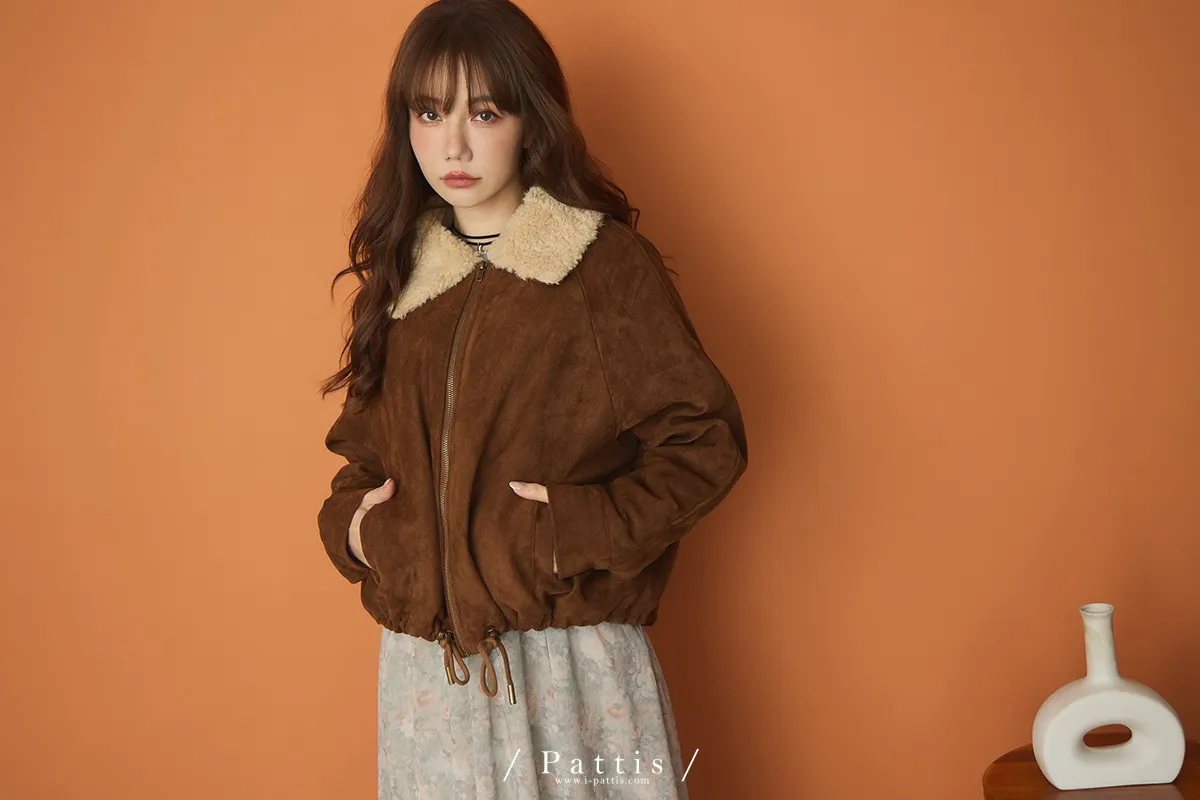 聽故事冬眠的泰迪 | 軟毛翻領麂皮絨拉鍊下抽繩外套(橘棕)