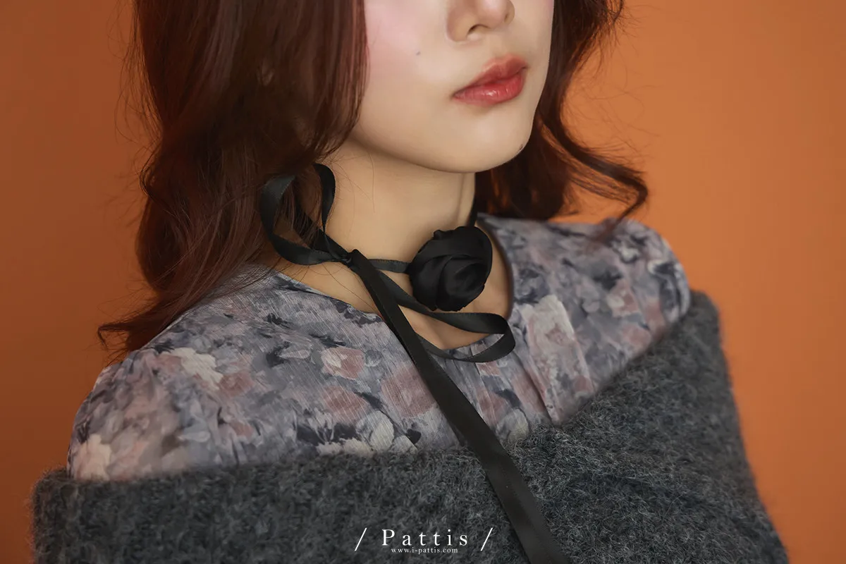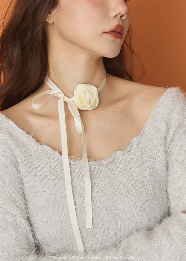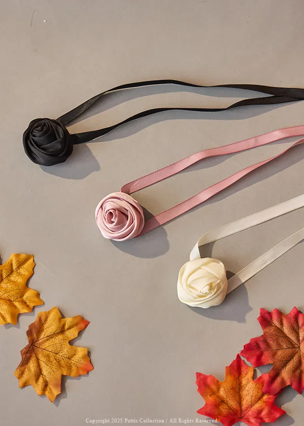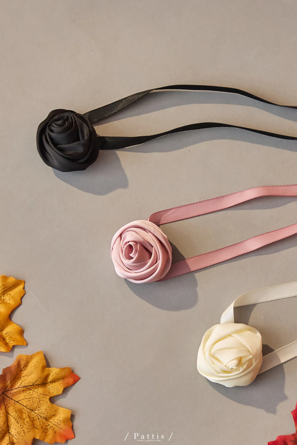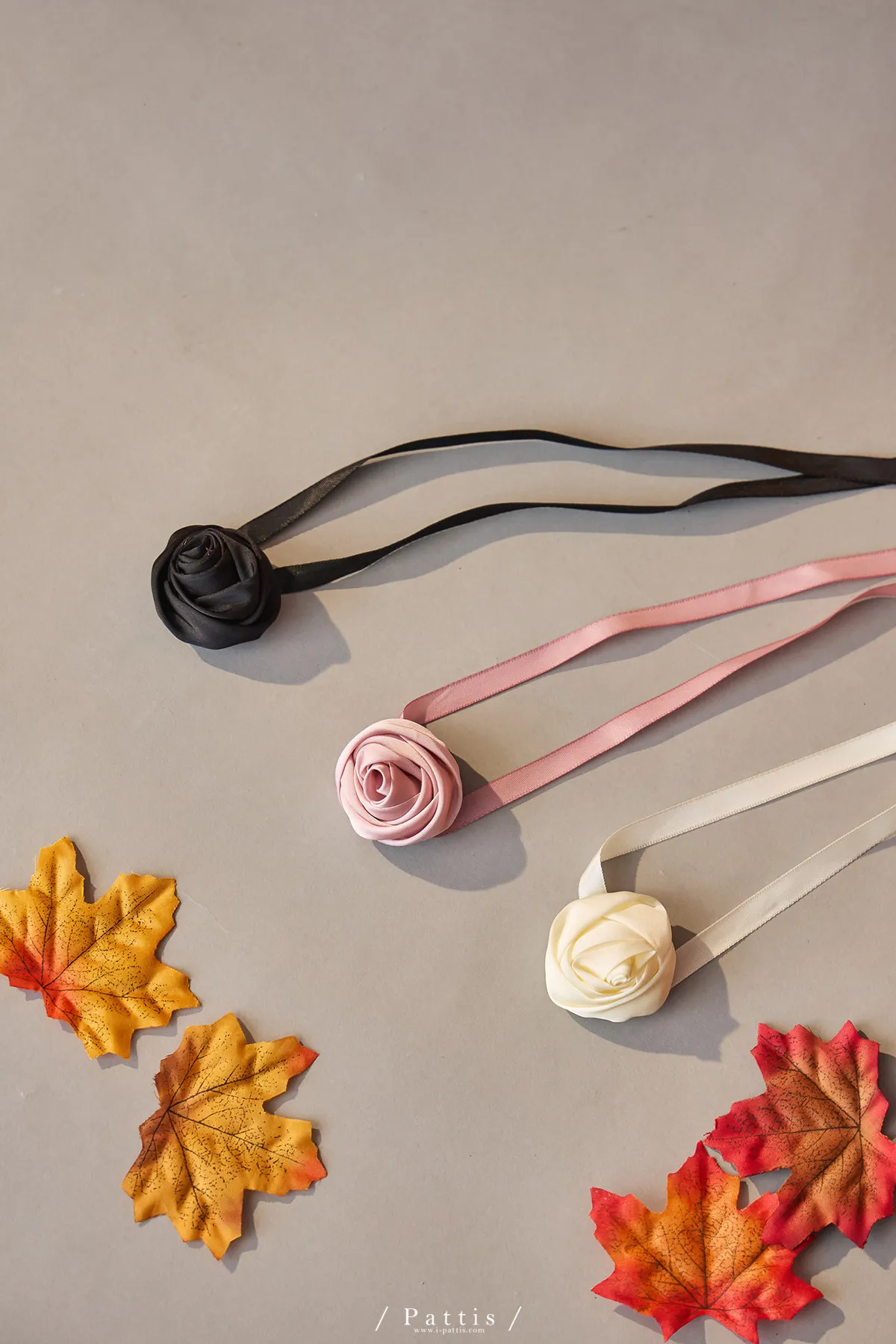手工緞光玫瑰花綁帶頸鍊(米白/粉/黑)