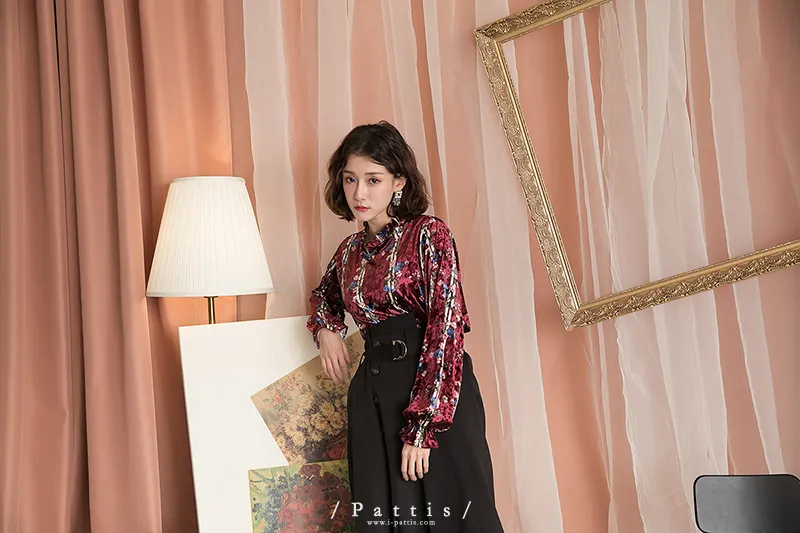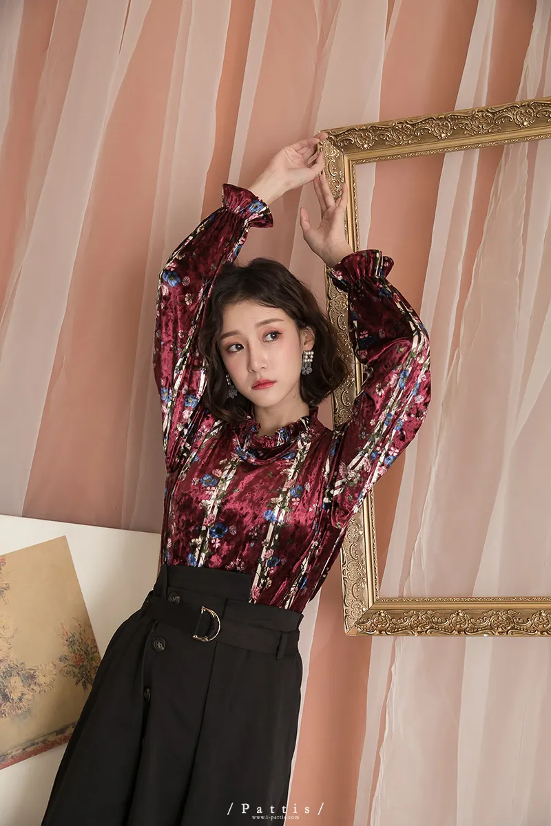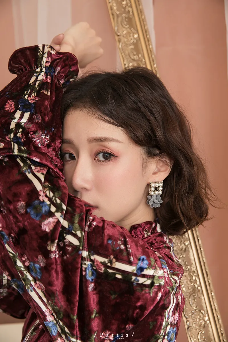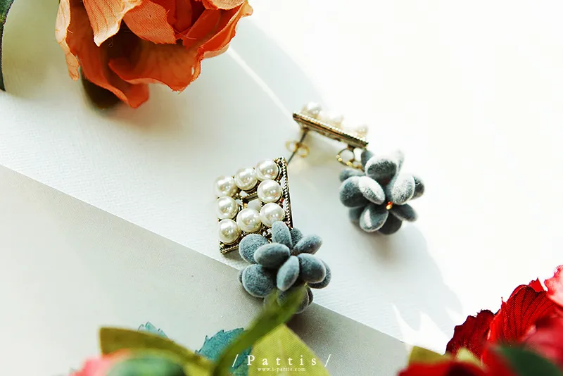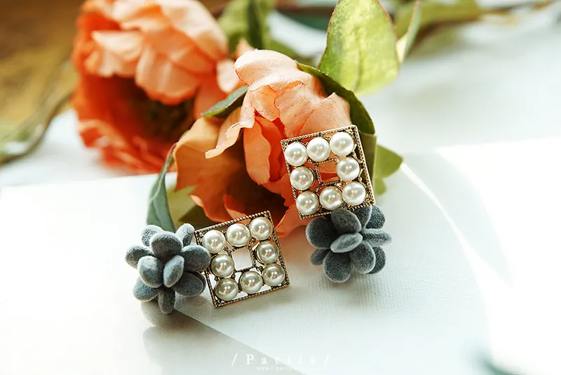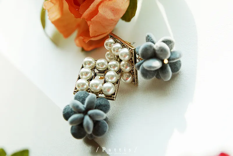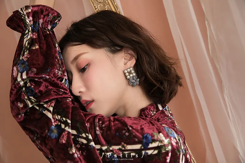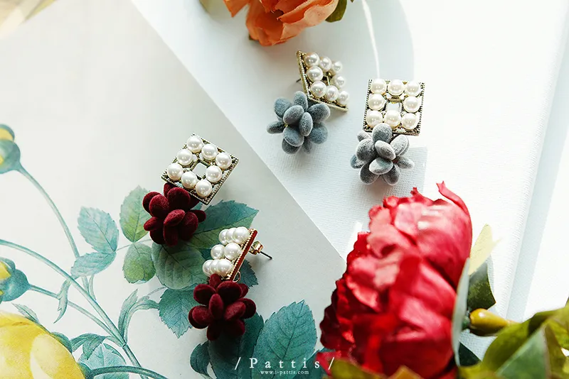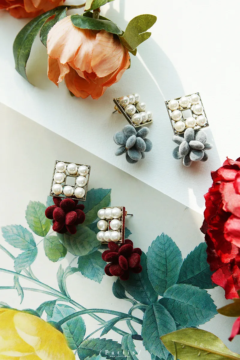 圍城 | 方格珍珠天鵝絨花朵耳環(酒紅/灰)