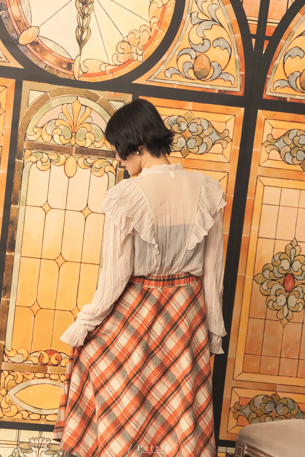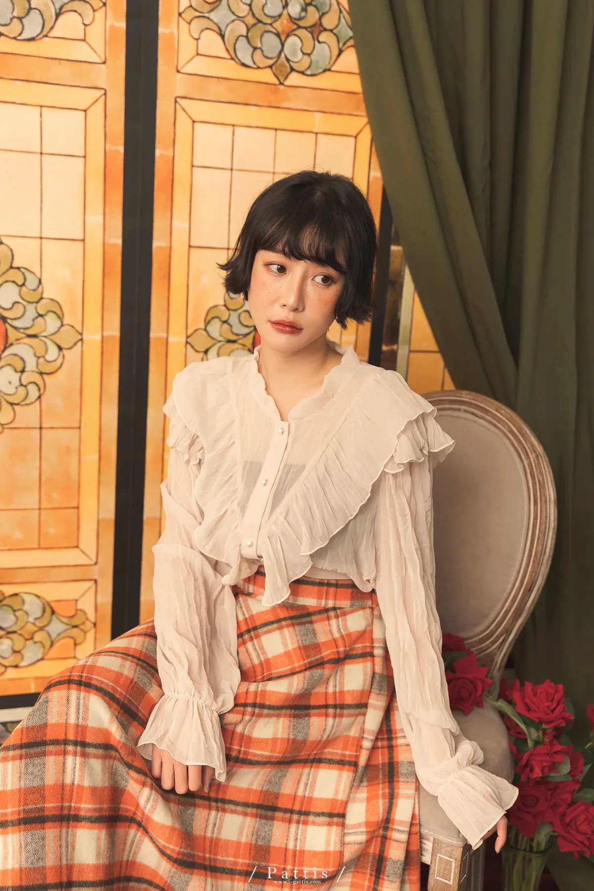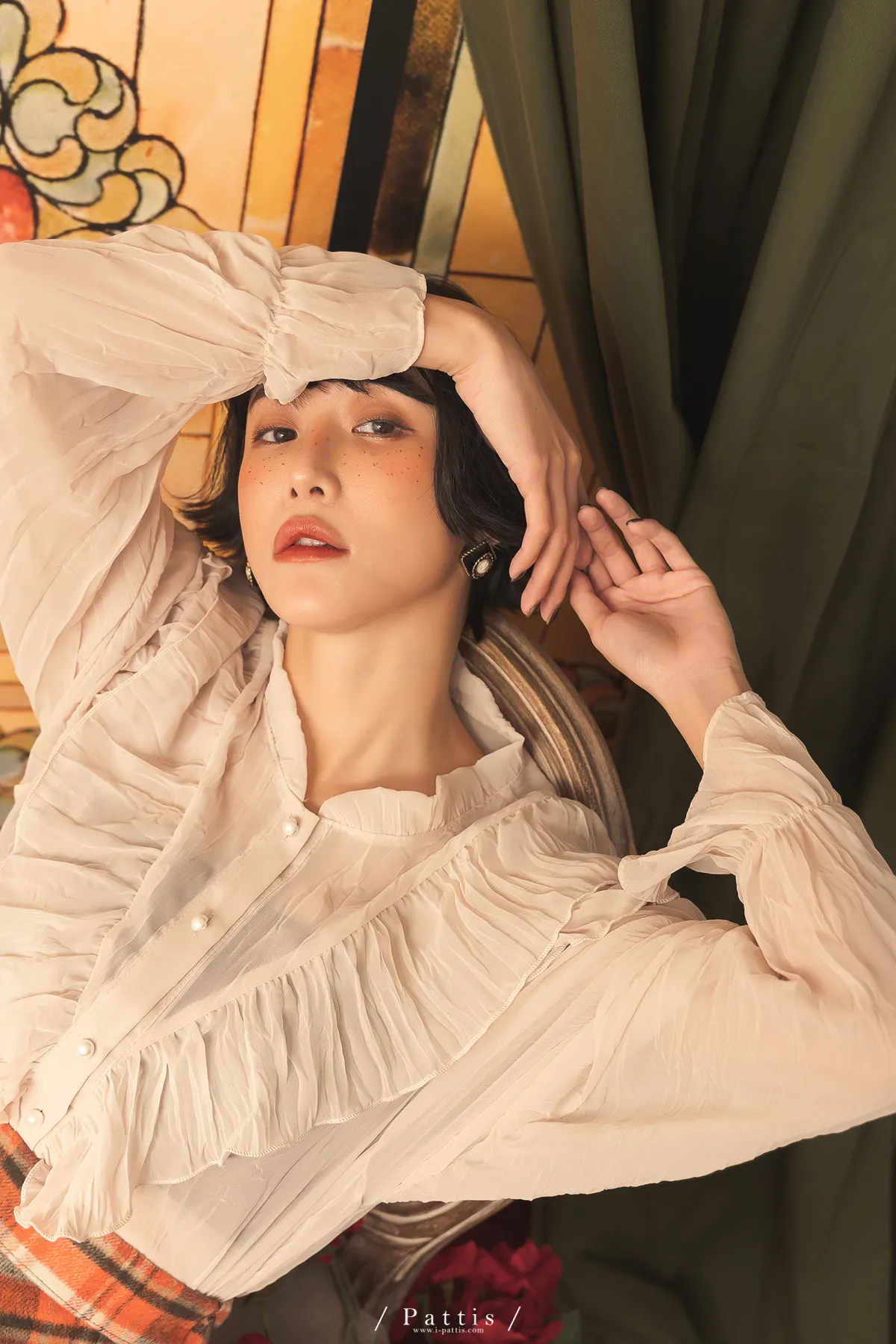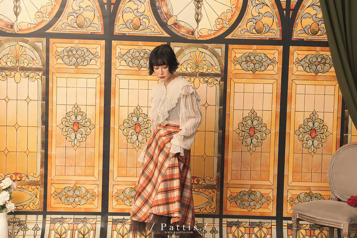 公爵吻別之時 | 皺褶絲柔荷葉V字襯衫(米杏)