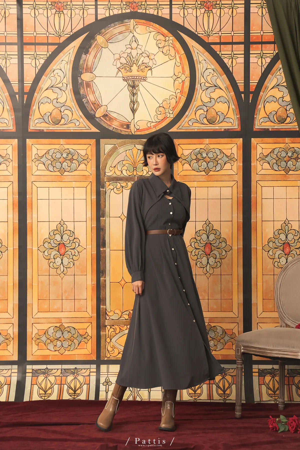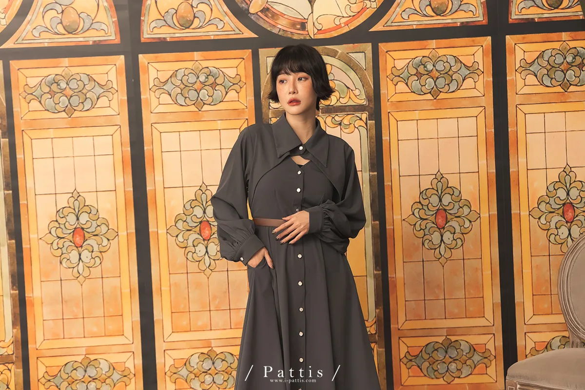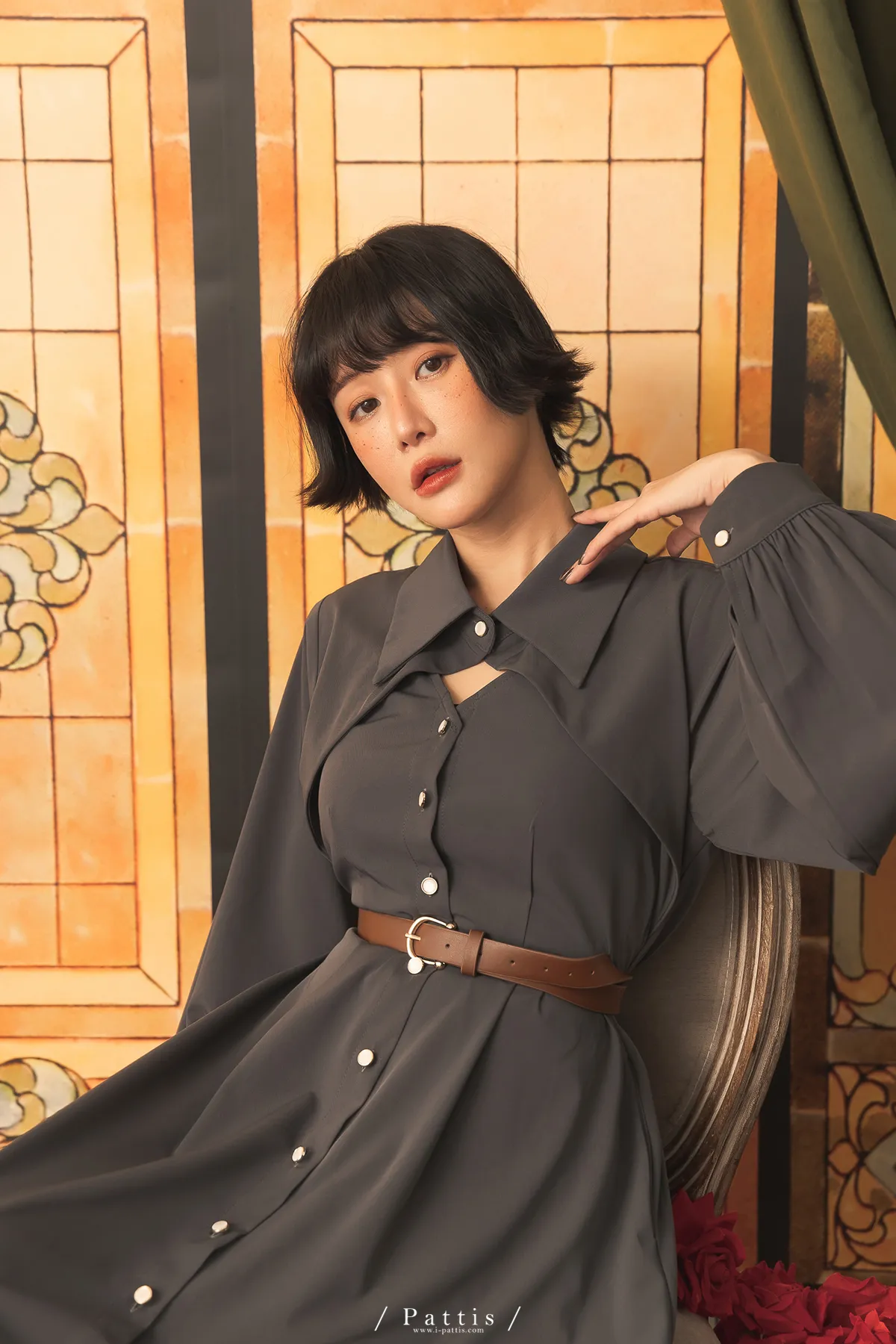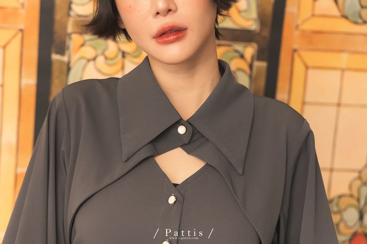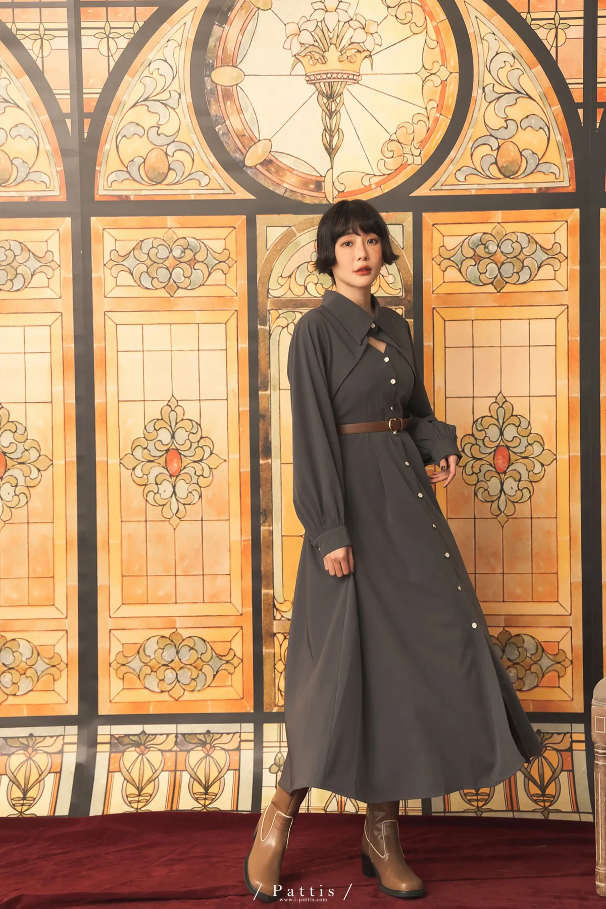 不明的三角關係 | 挖洞小V字假兩件風衣洋裝(灰藍)