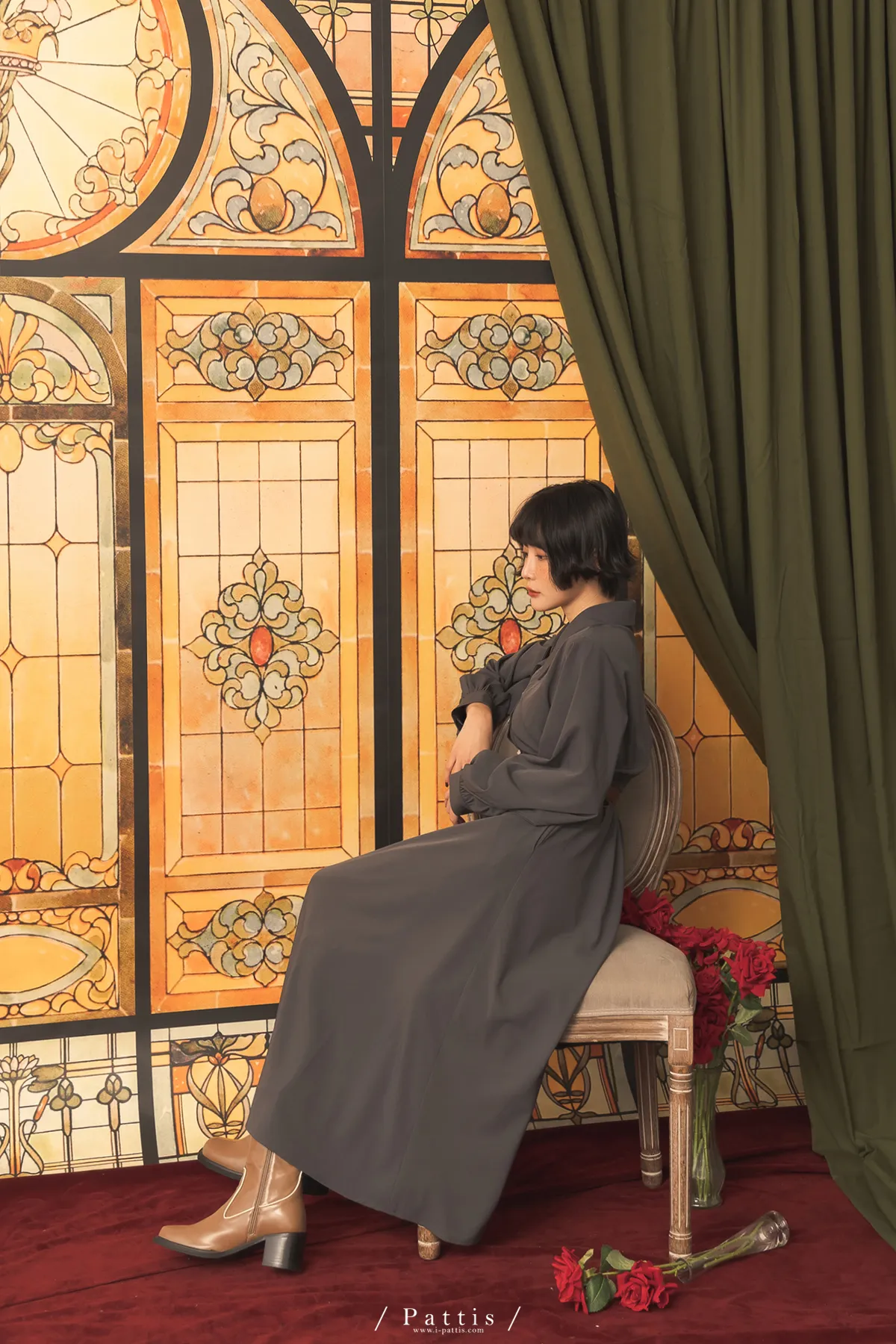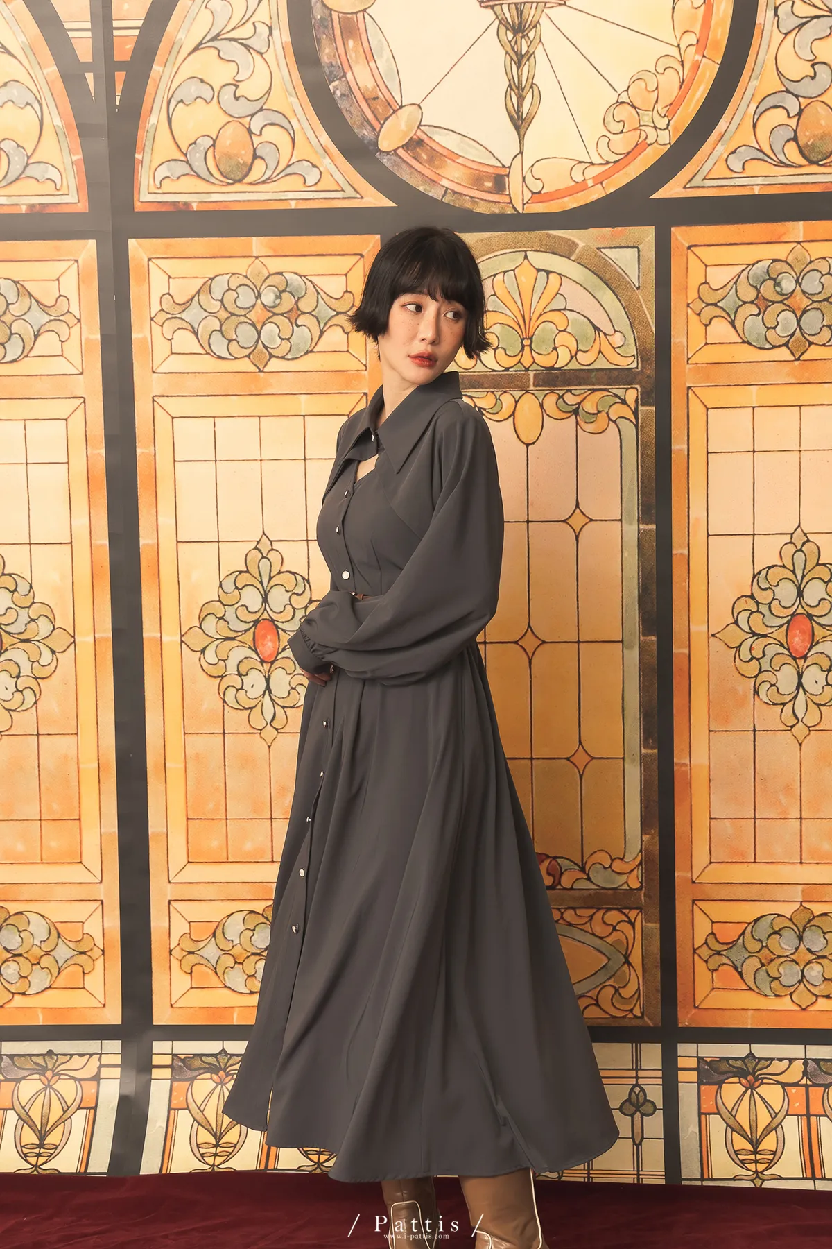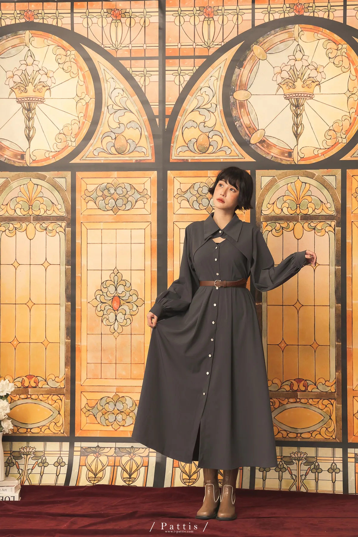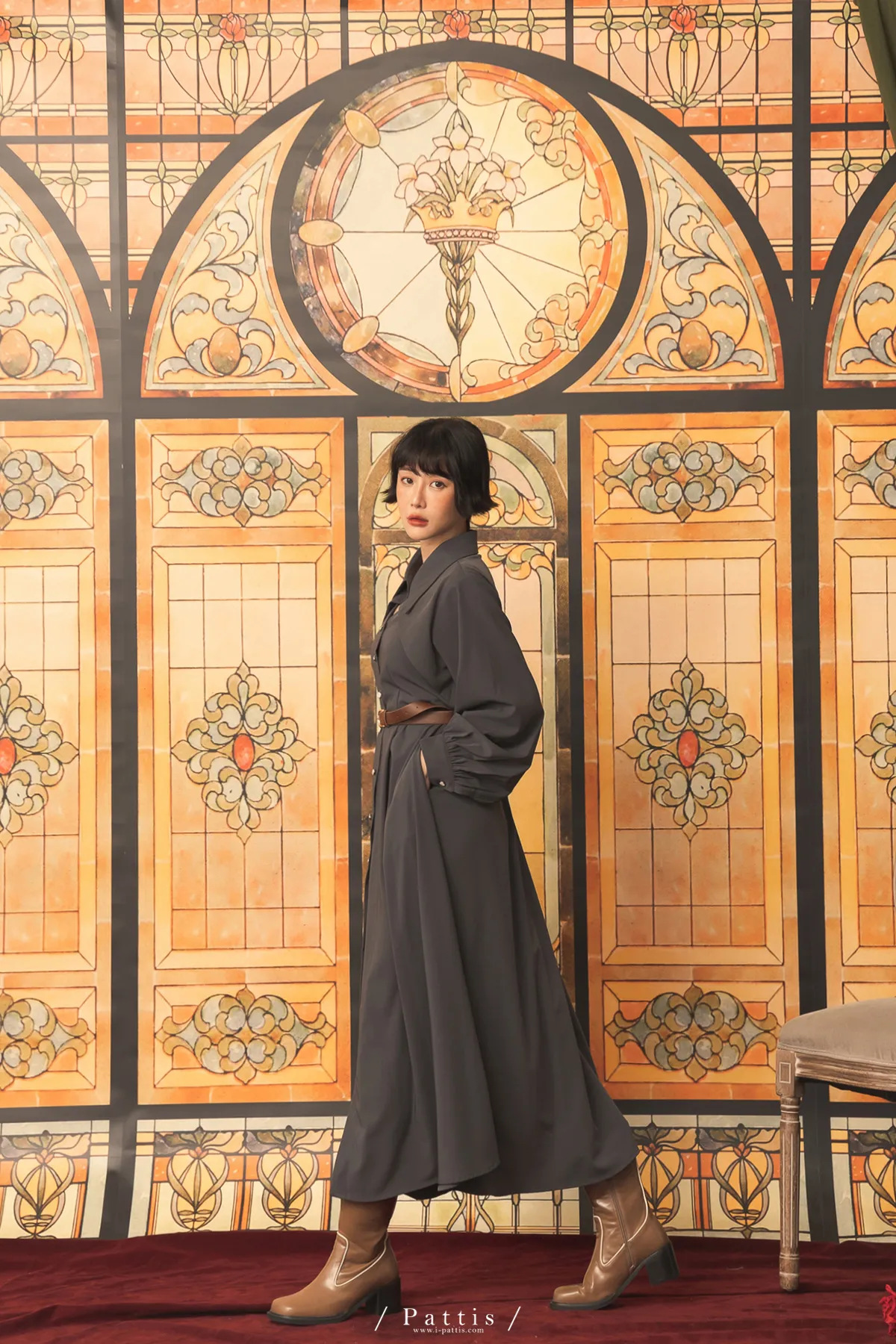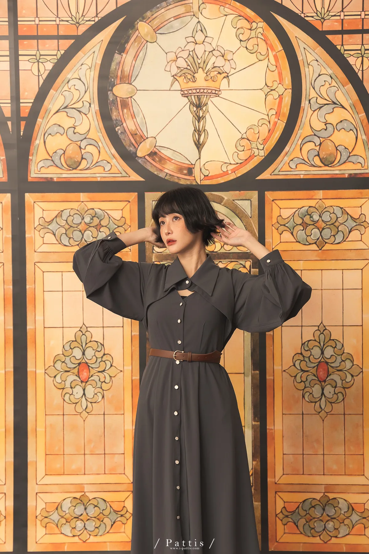 不明的三角關係 | 挖洞小V字假兩件風衣洋裝(灰藍)