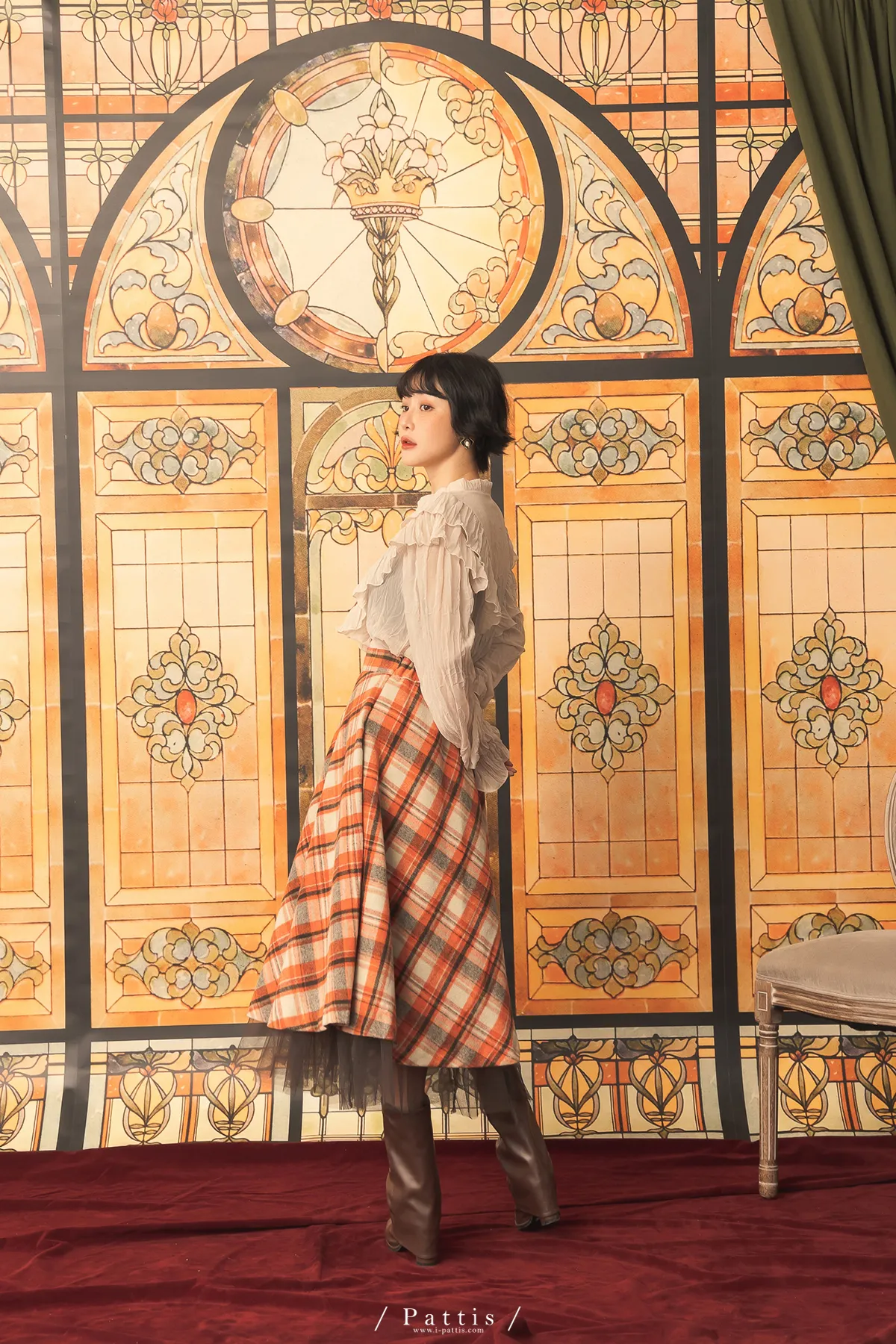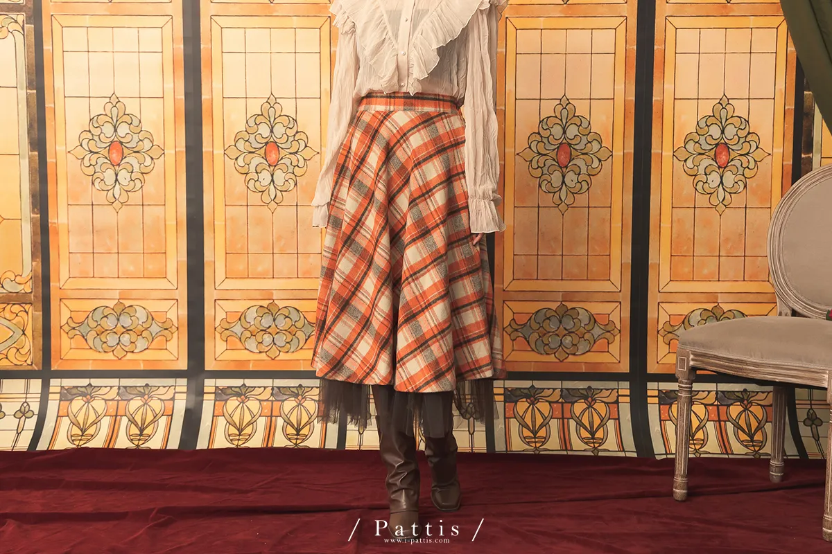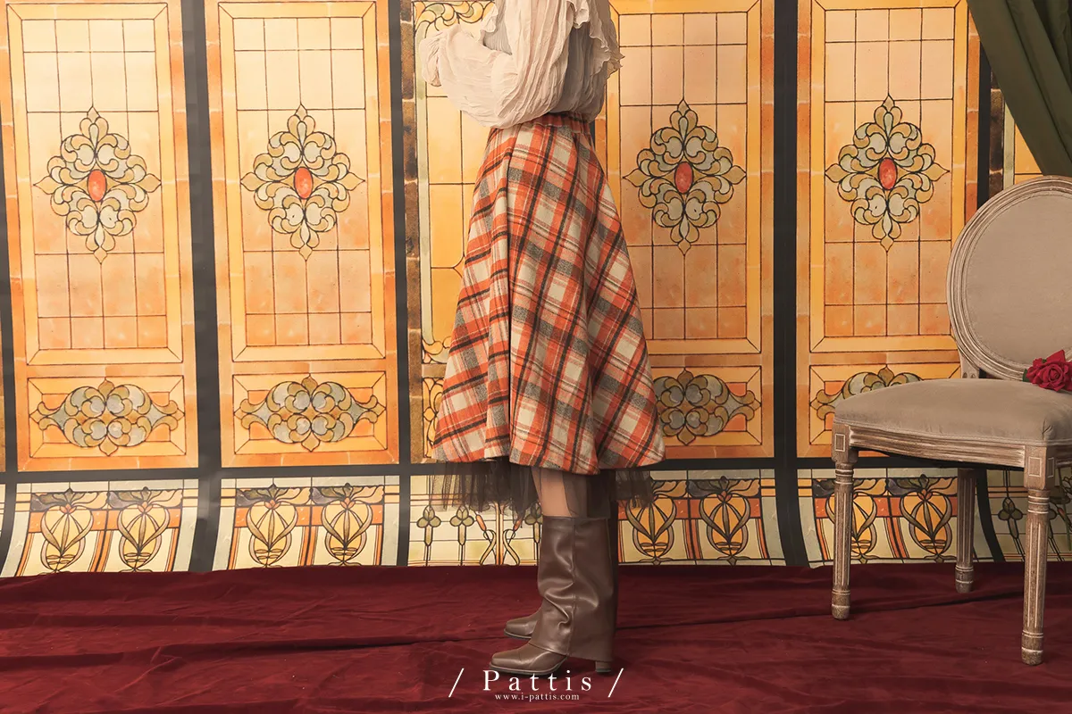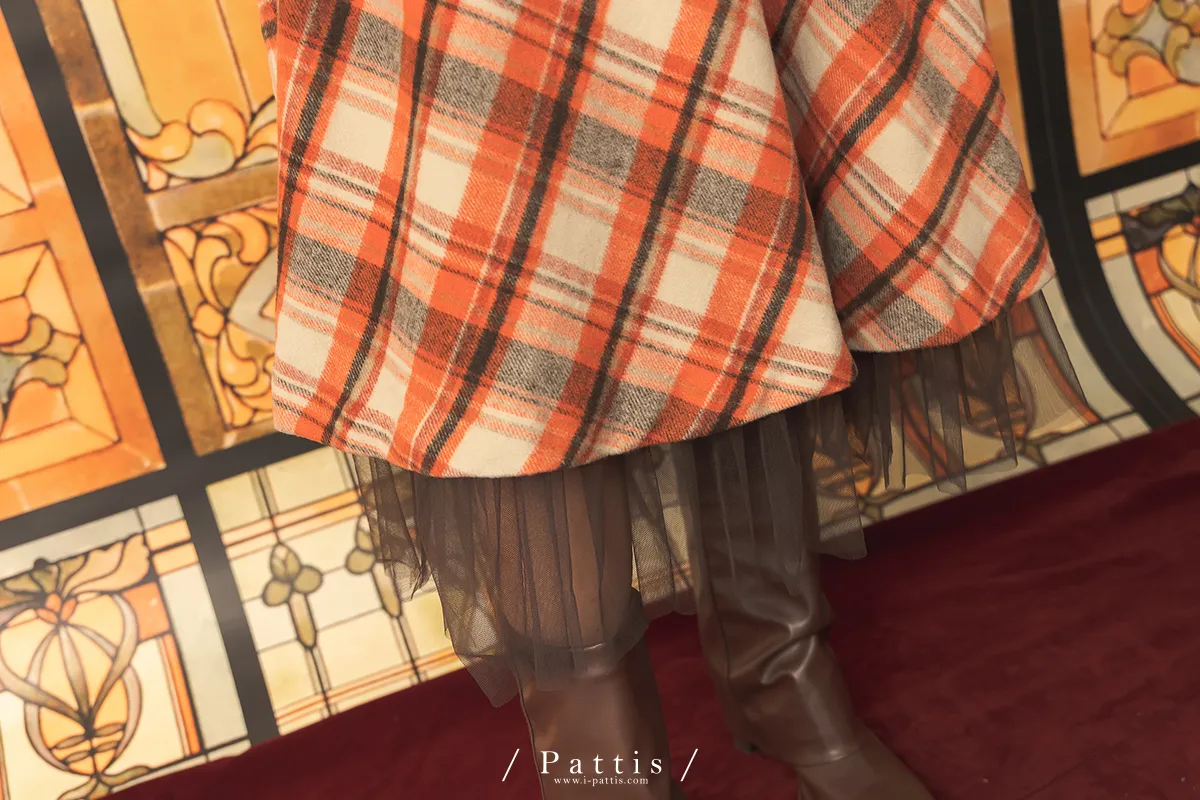 圓舞曲加冕日 | 拼接網紗毛呢格紋裙(橘咖)