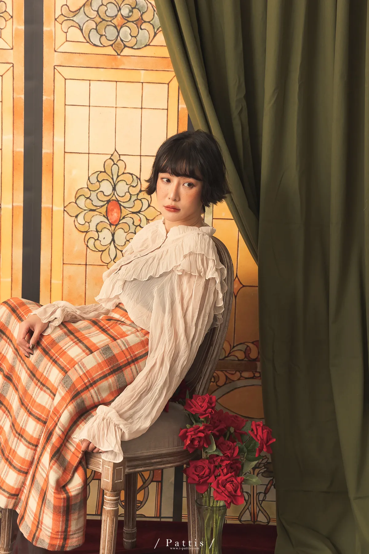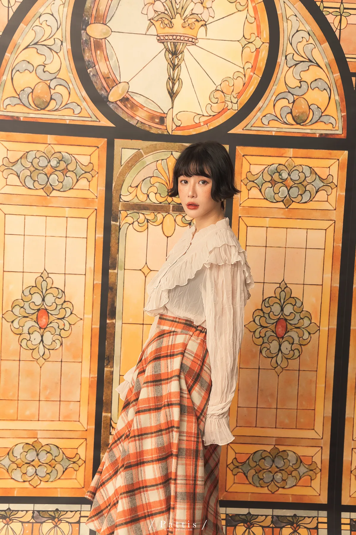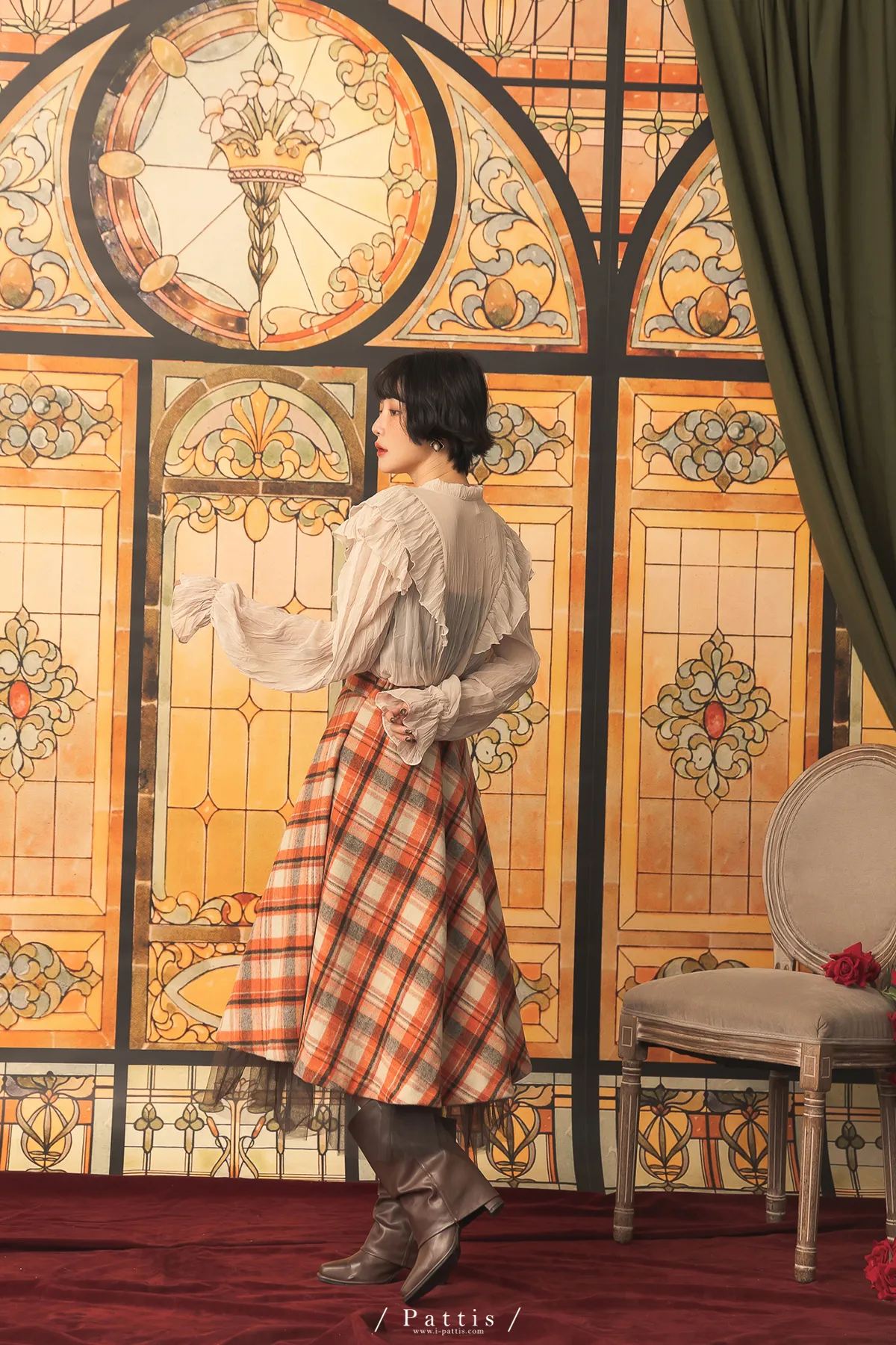 圓舞曲加冕日 | 拼接網紗毛呢格紋裙(橘咖)