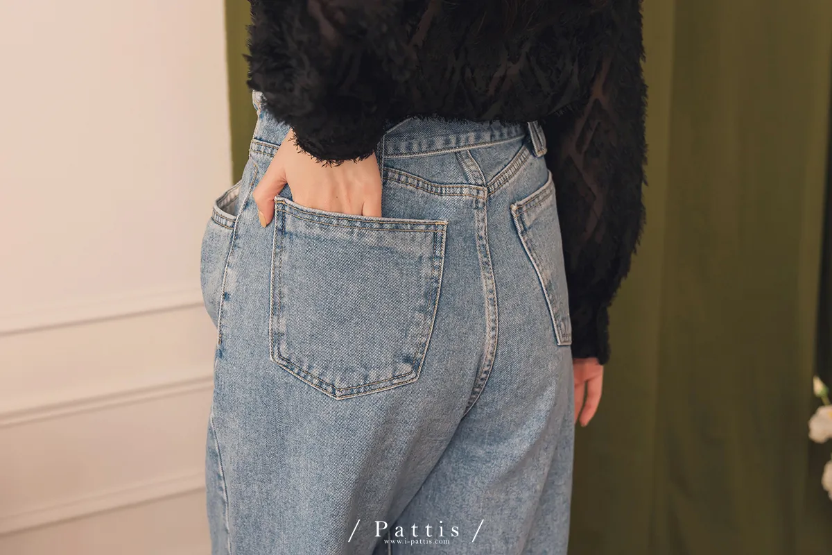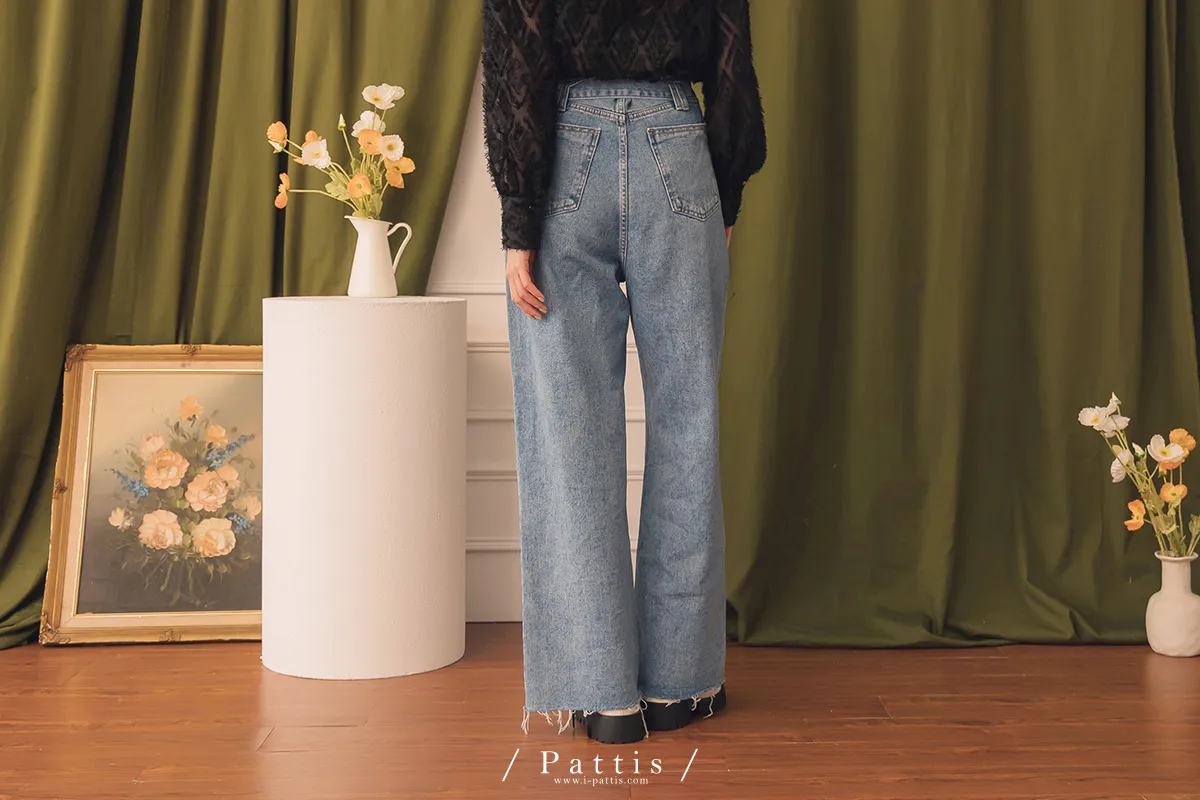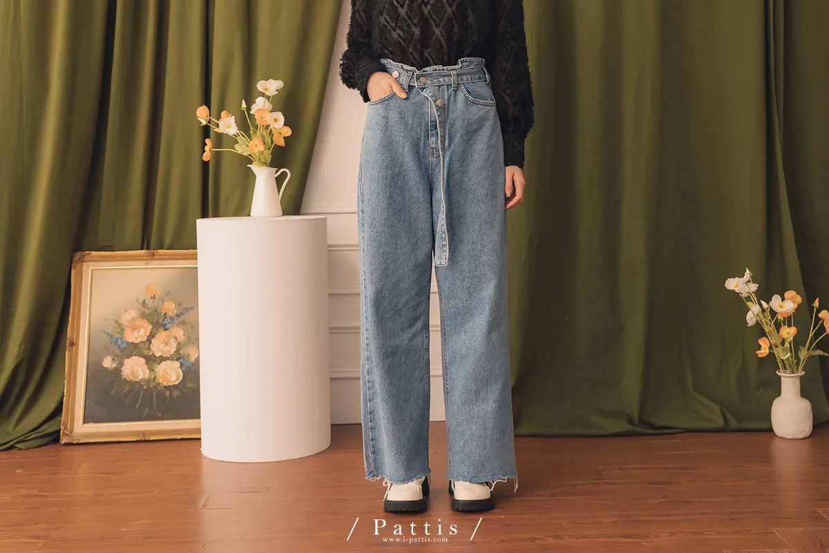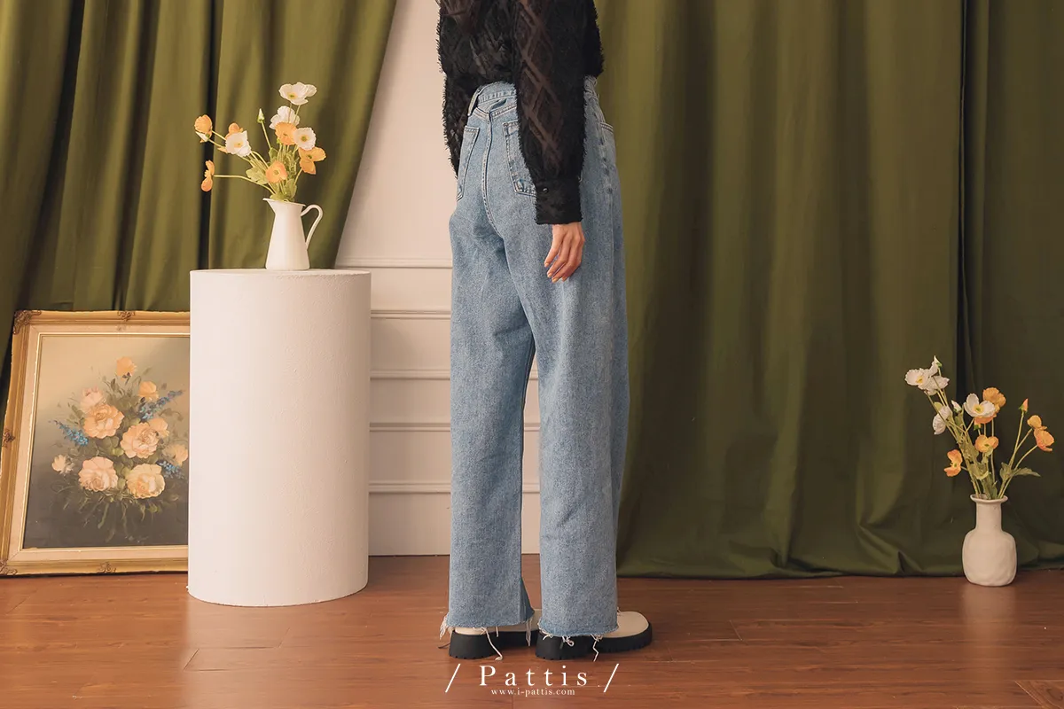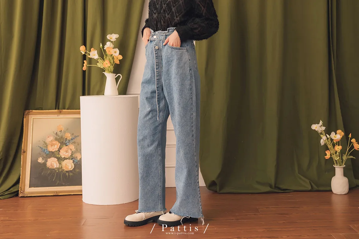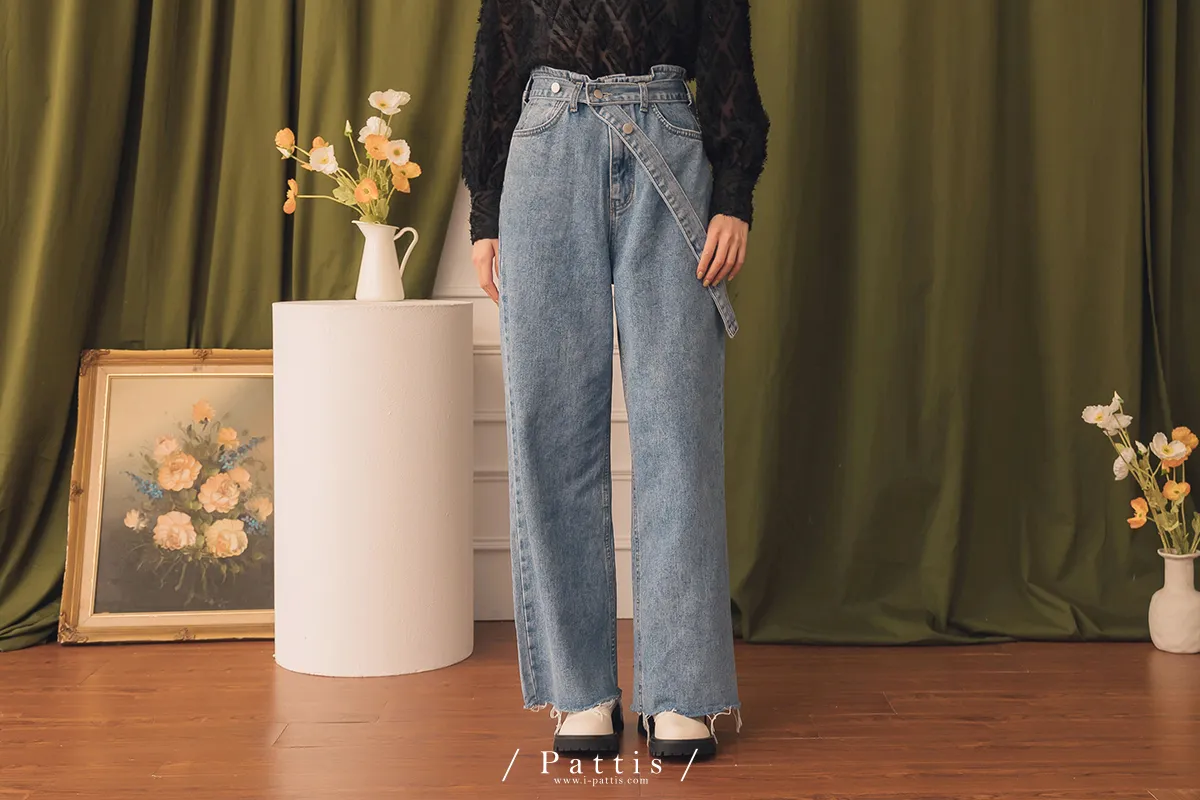 冰冬的湖色 | 釘釦繫帶不收邊單寧寬褲(單一色)