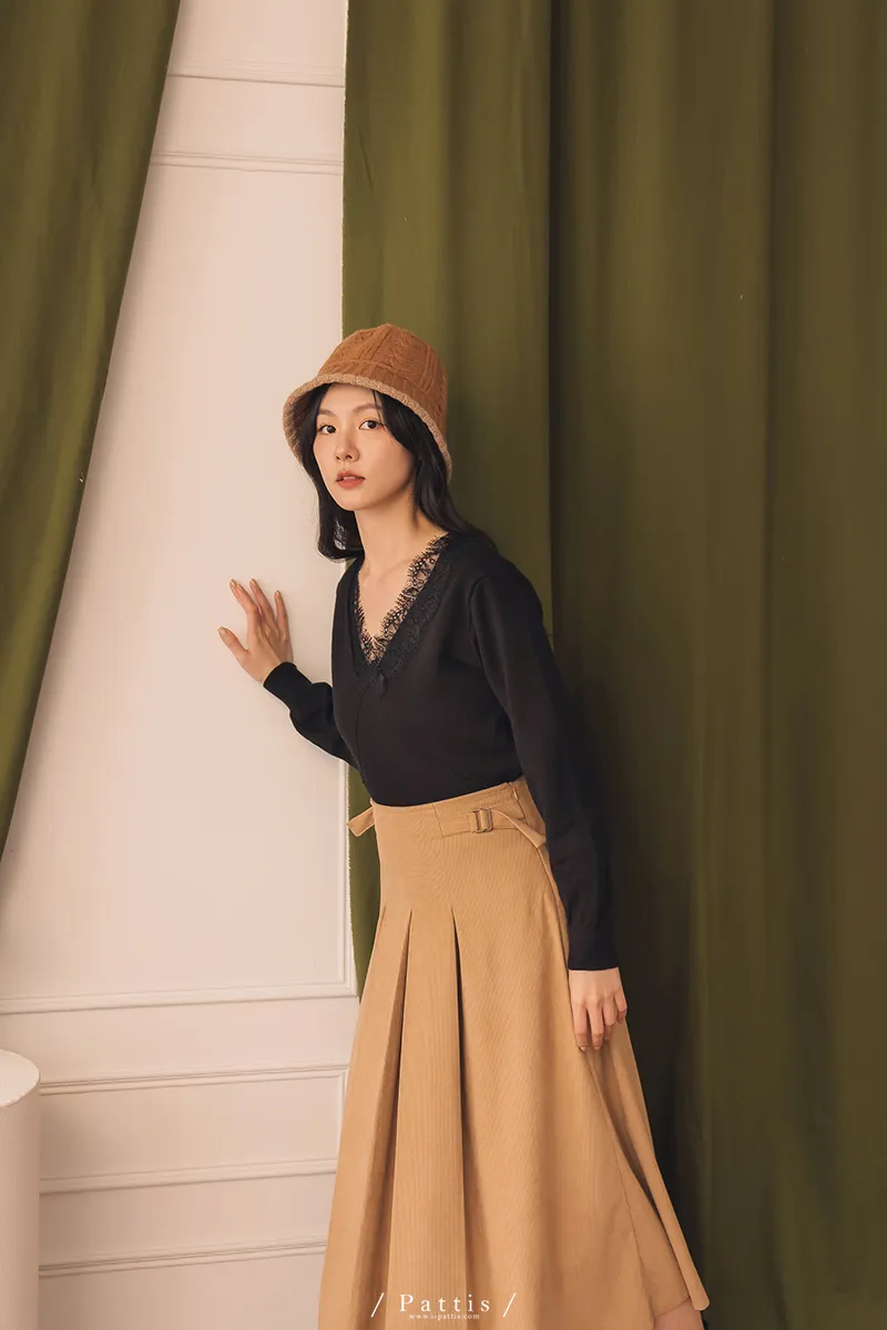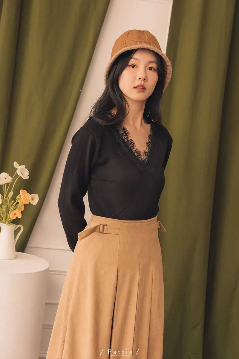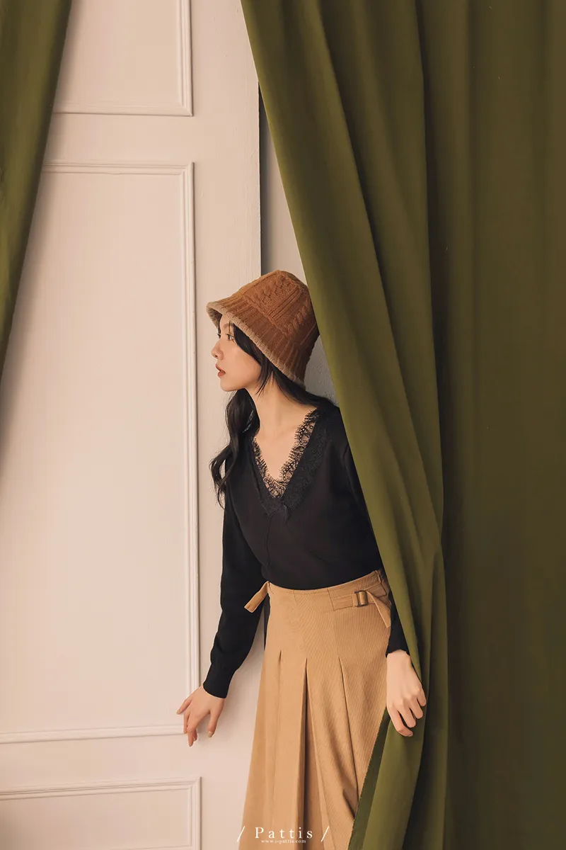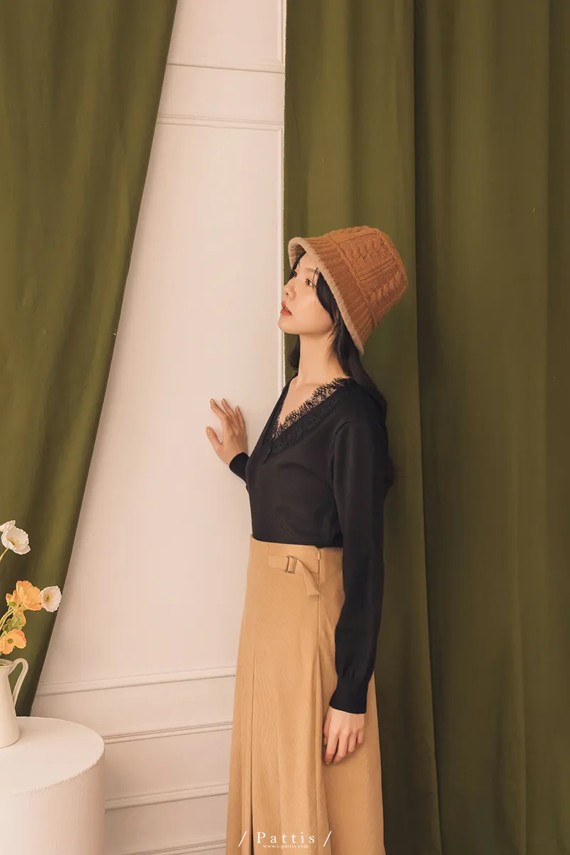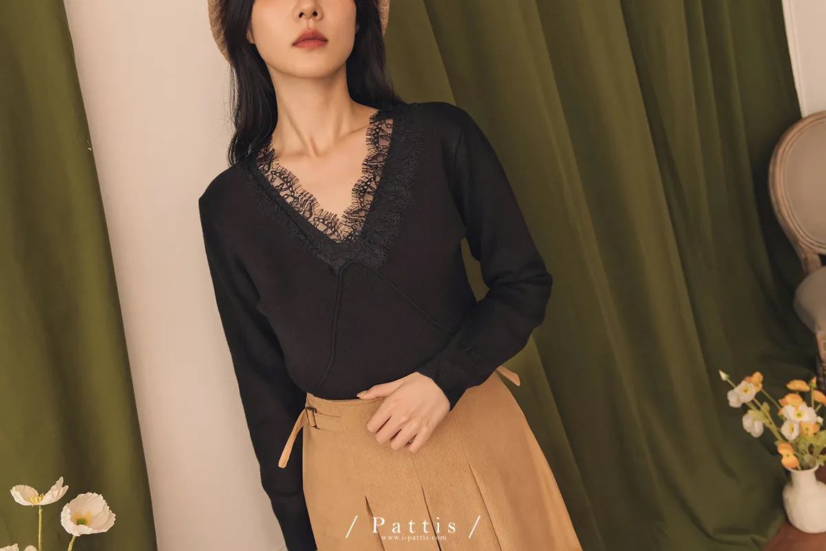 *特*綴蕾絲V領小蓬袖毛衣(黑)
