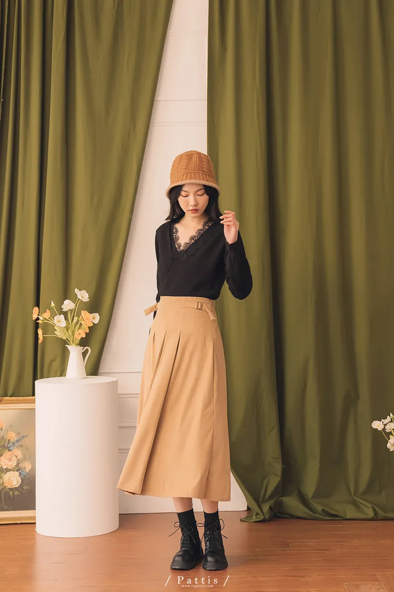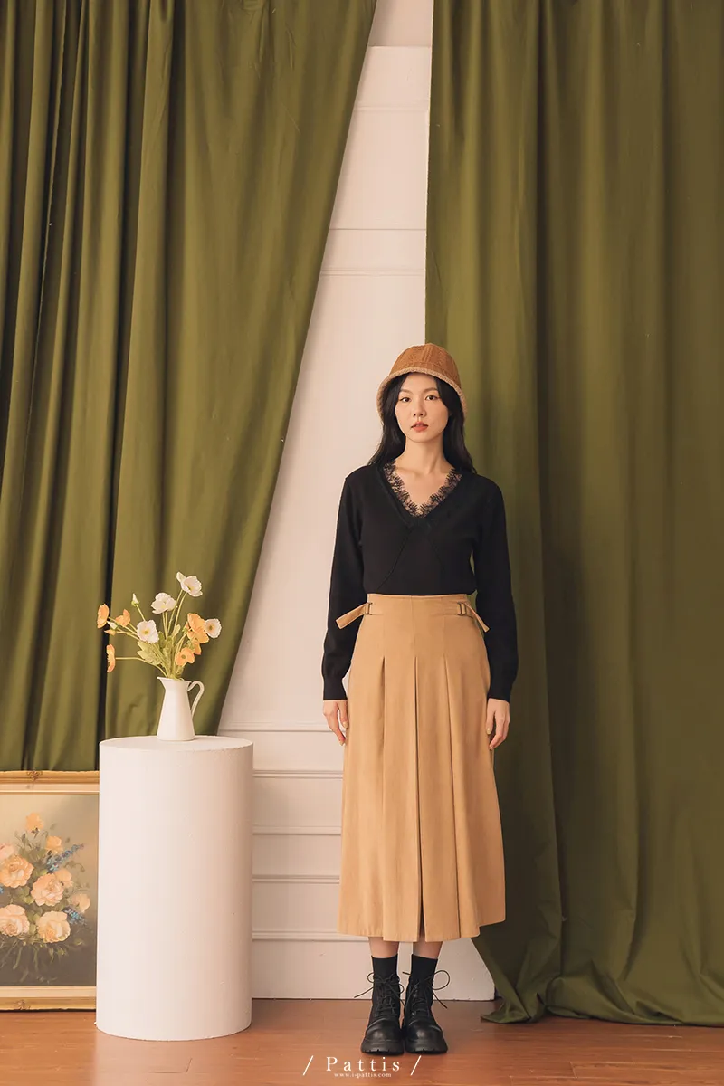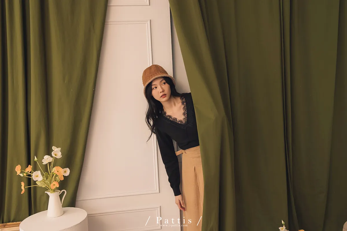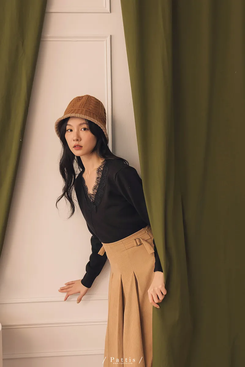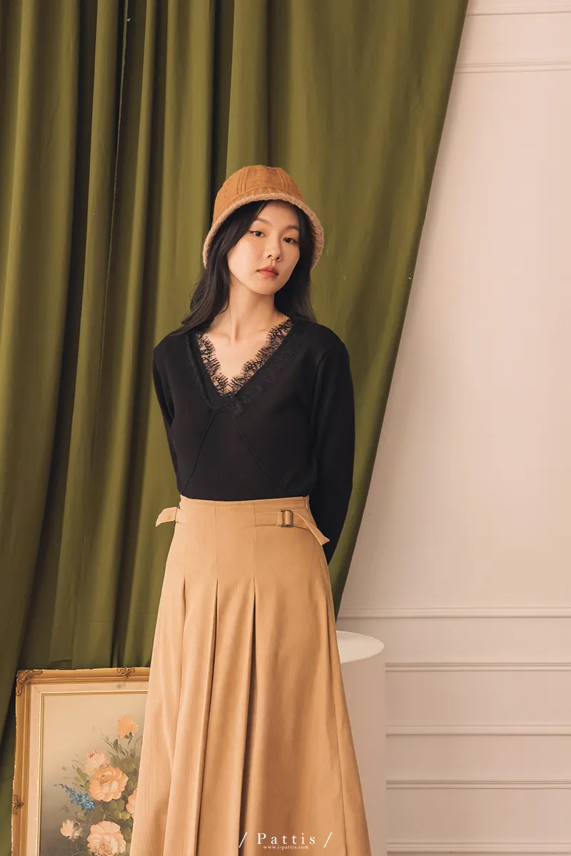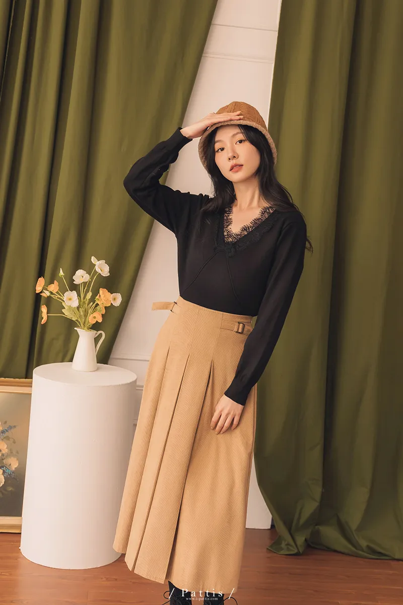 *特*綴蕾絲V領小蓬袖毛衣(黑)