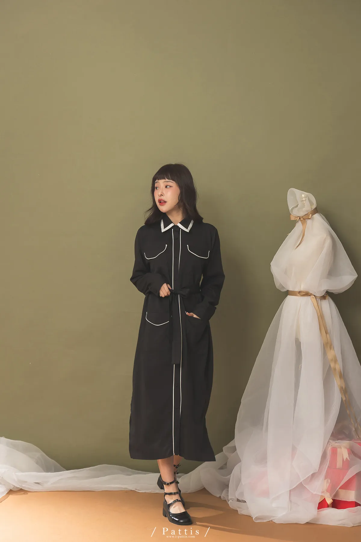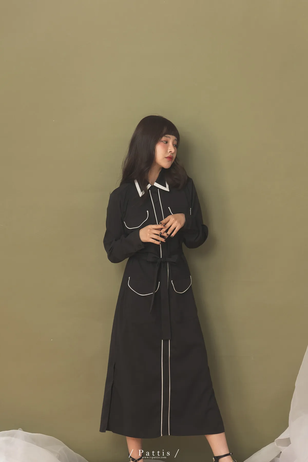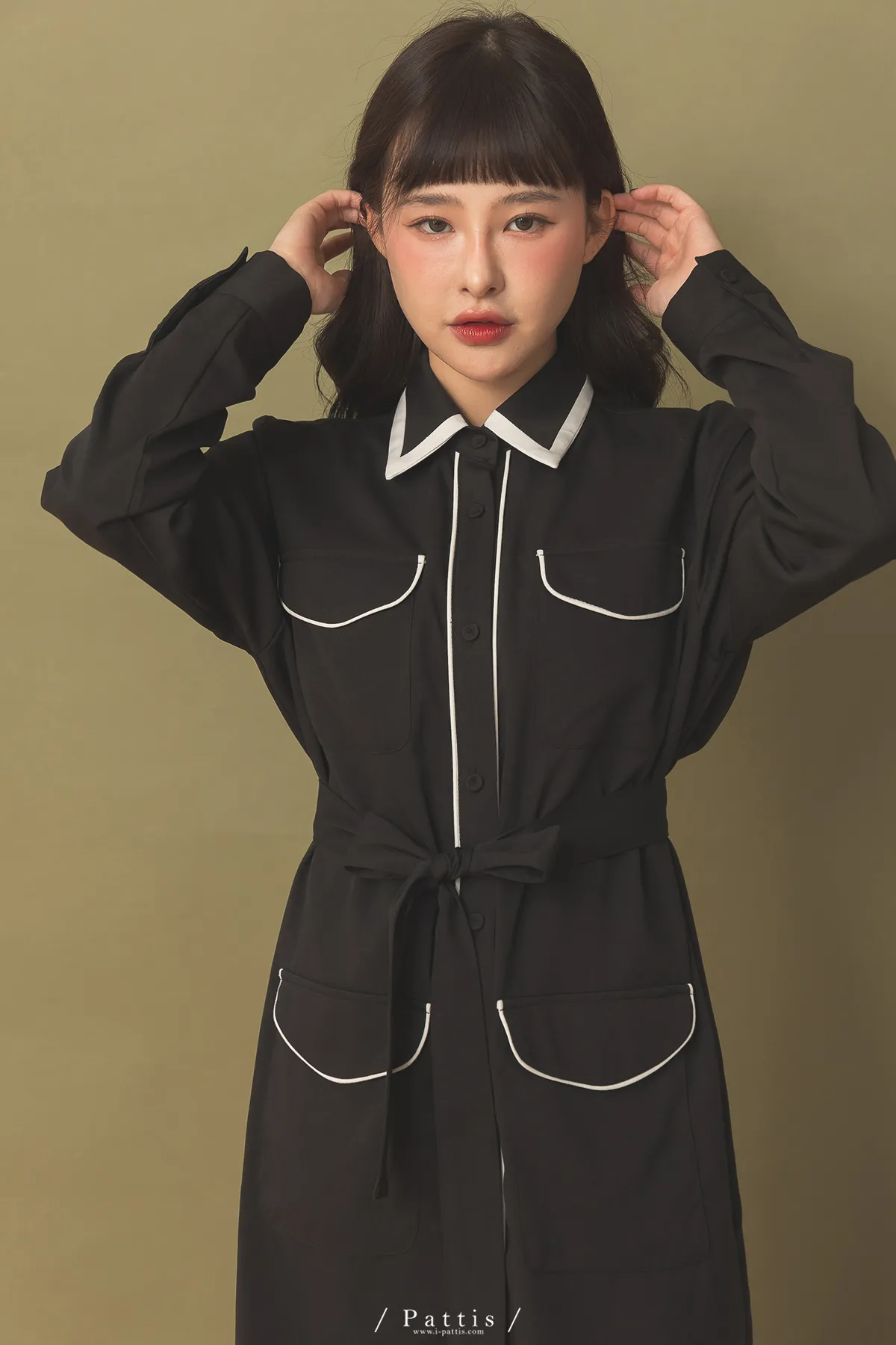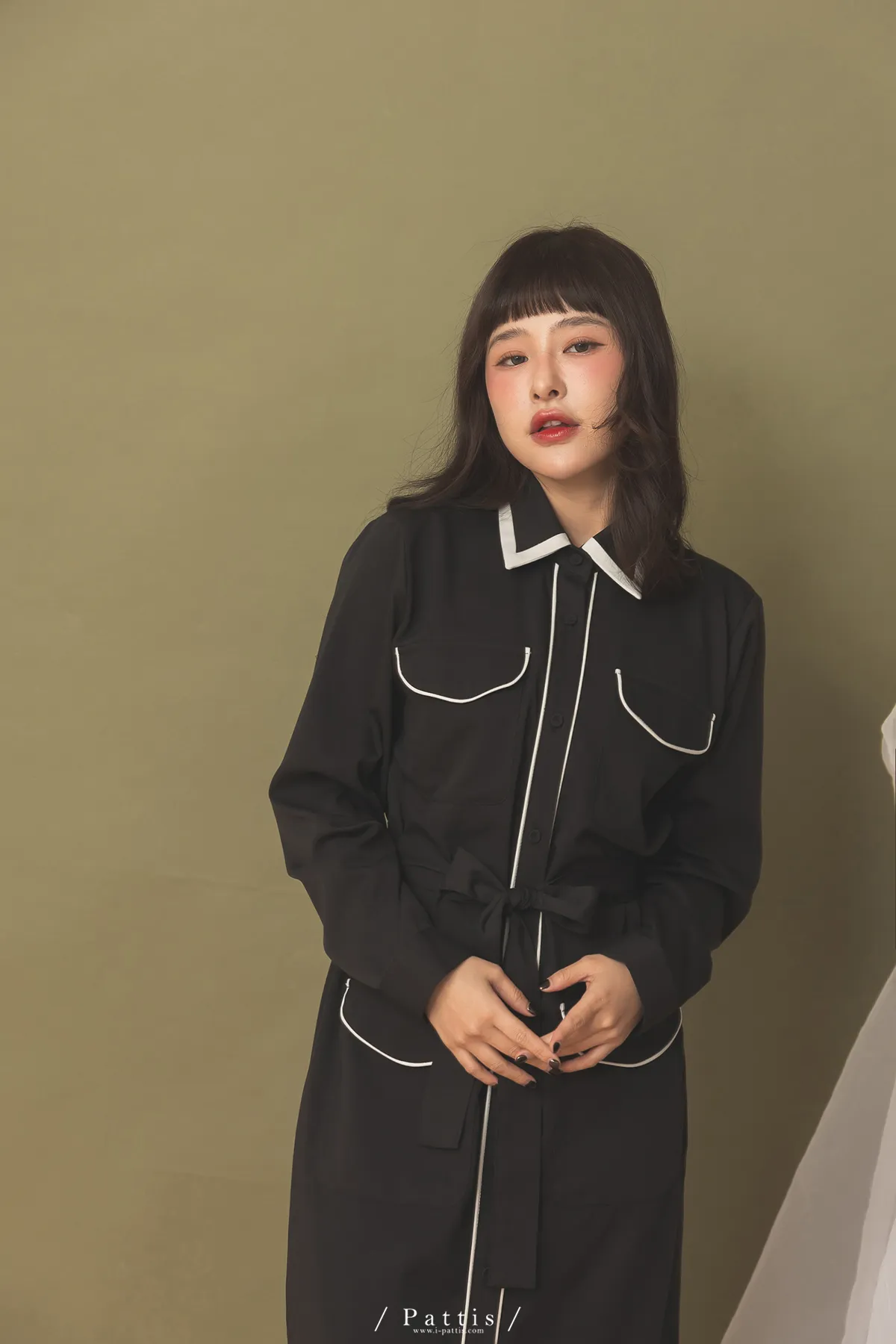 雲夜蒐集家 | 軟料撞色領配四袋造型洋裝(黑)