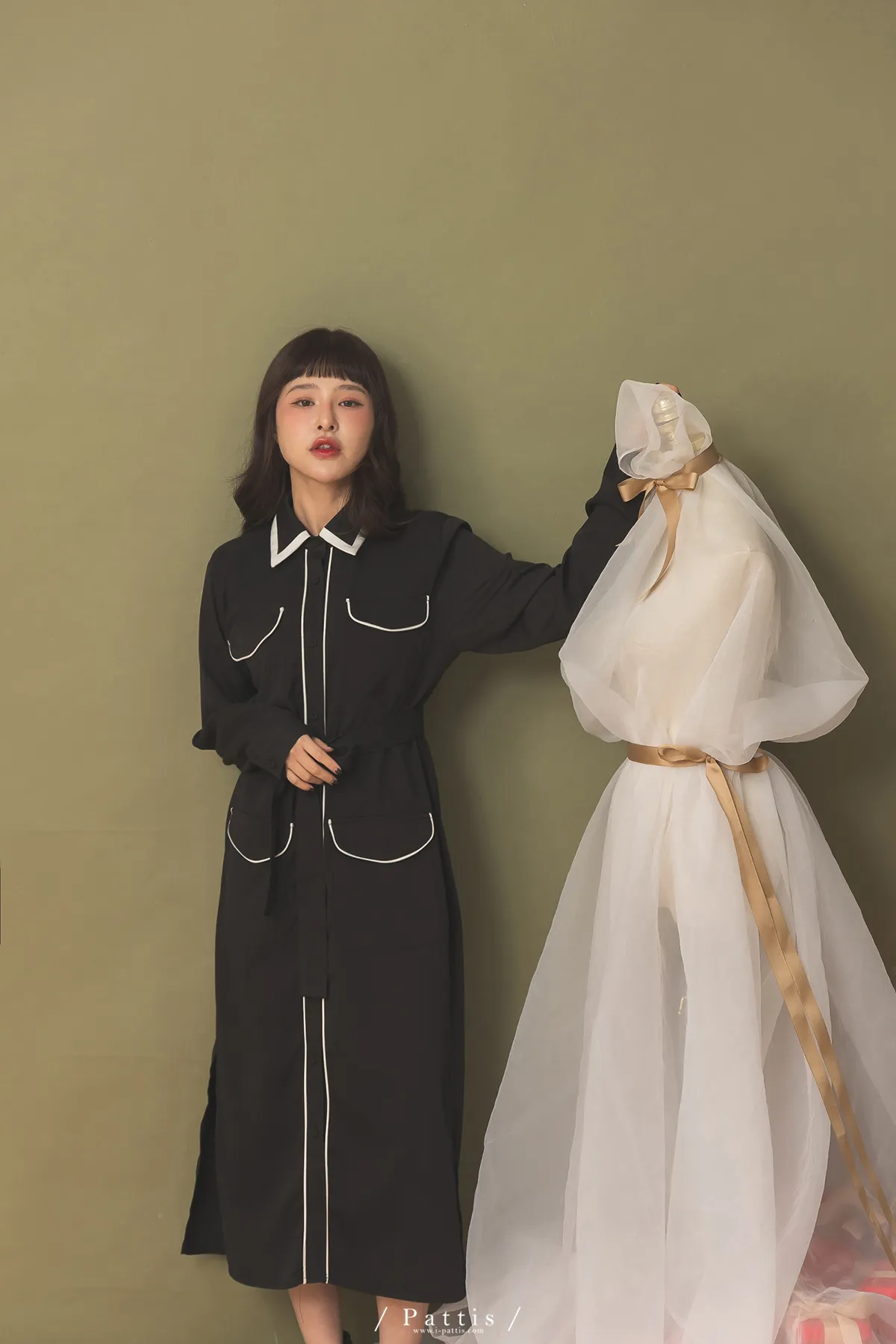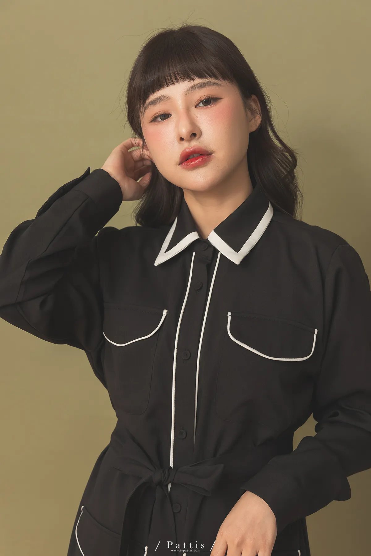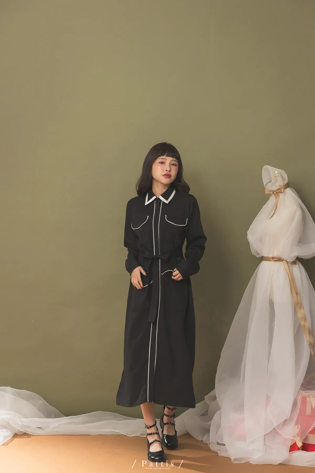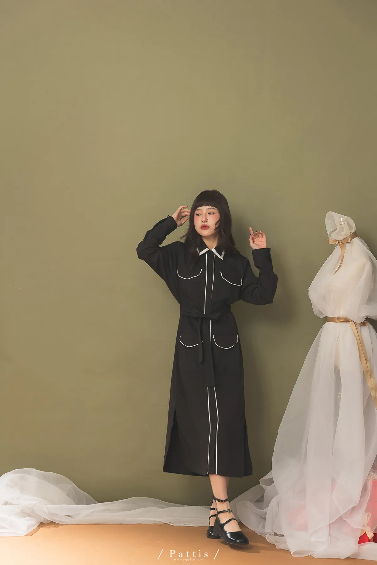 雲夜蒐集家 | 軟料撞色領配四袋造型洋裝(黑)