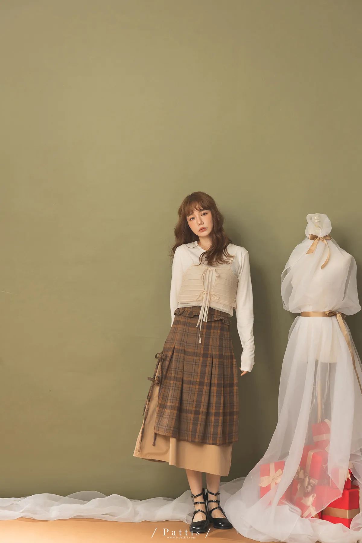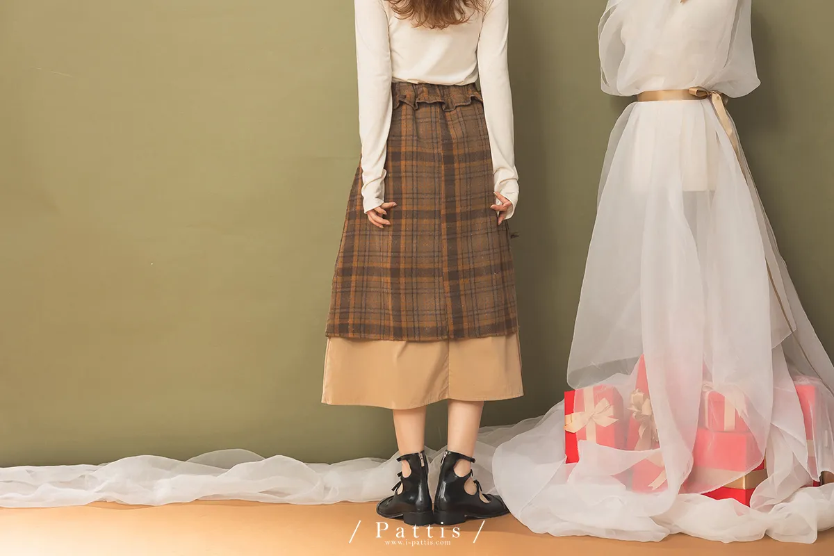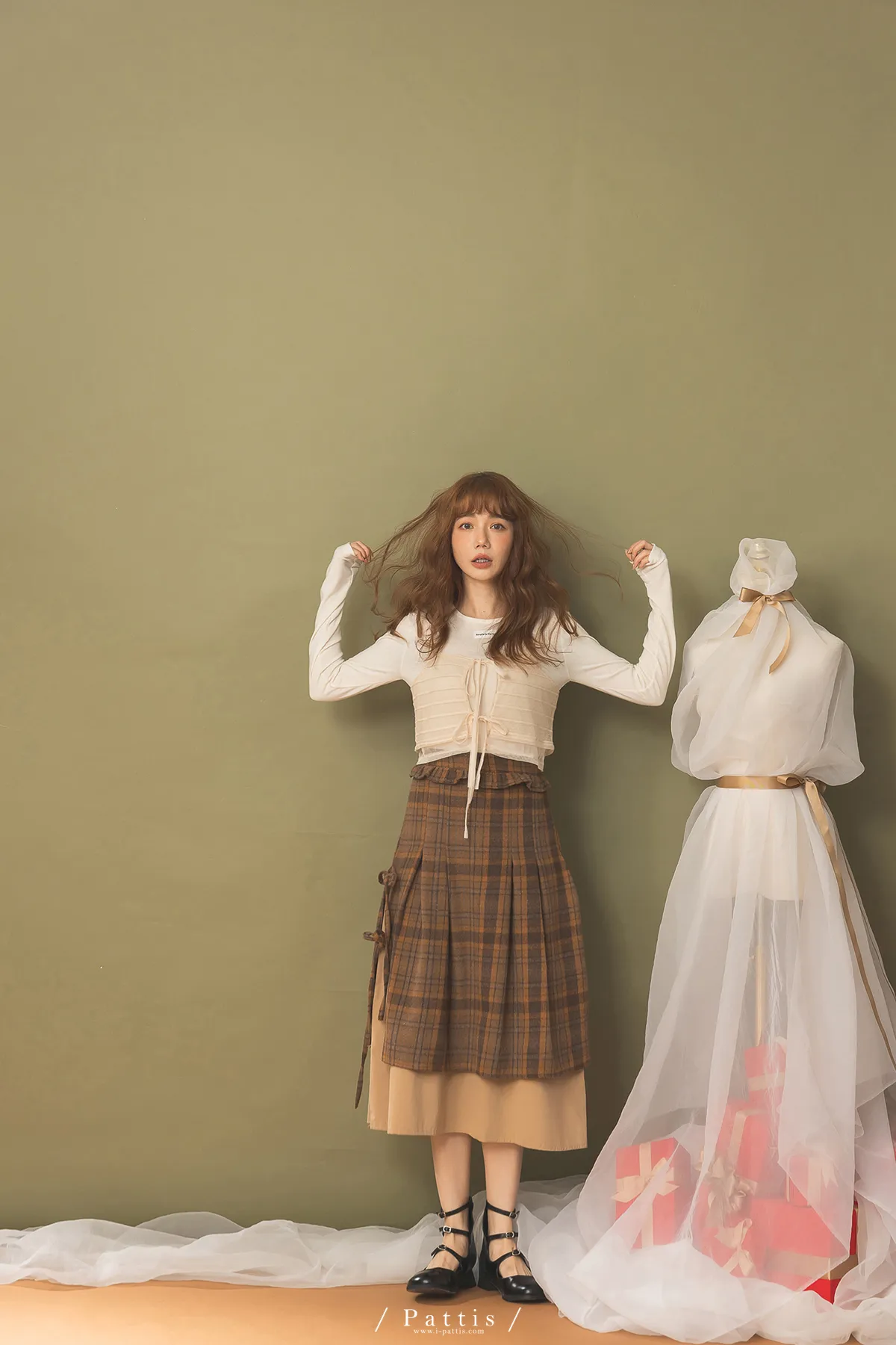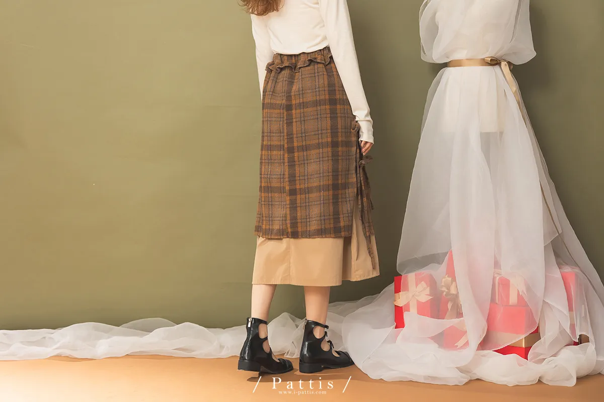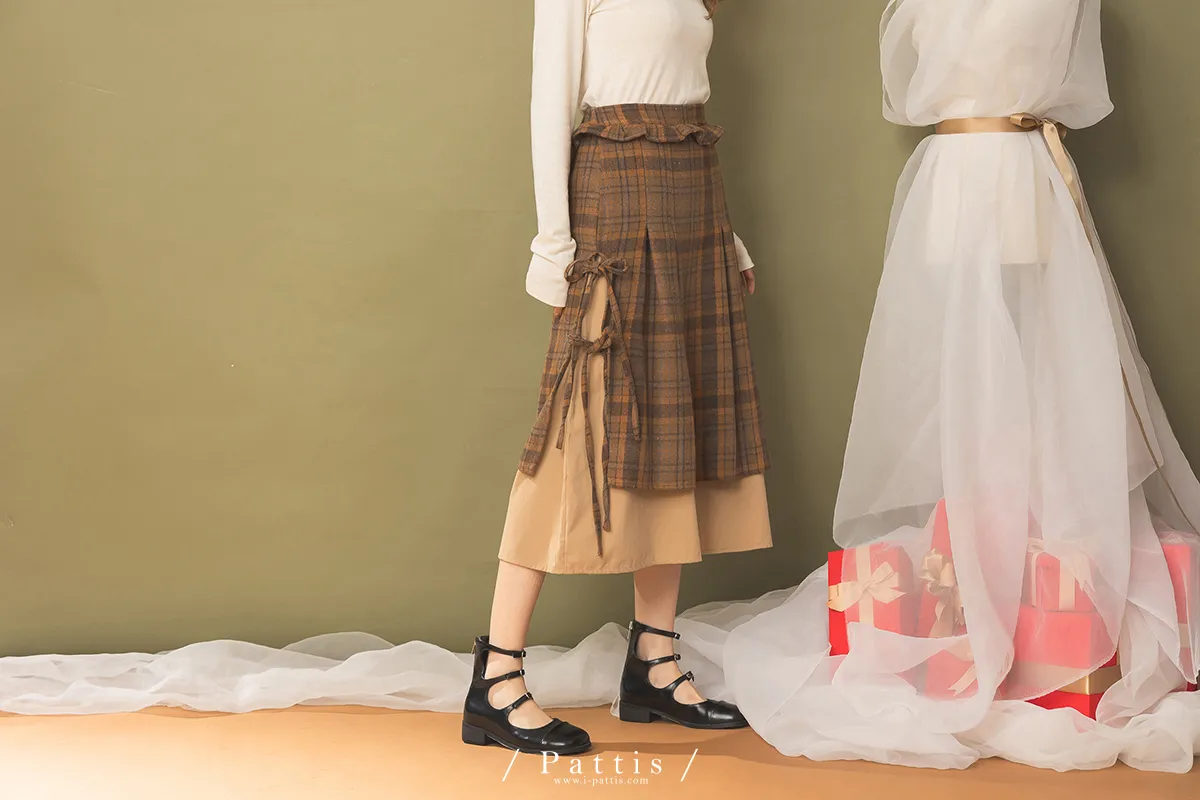太妃糖包裝紙 | 雙層抓皺格紋綁帶傘裙(棕)