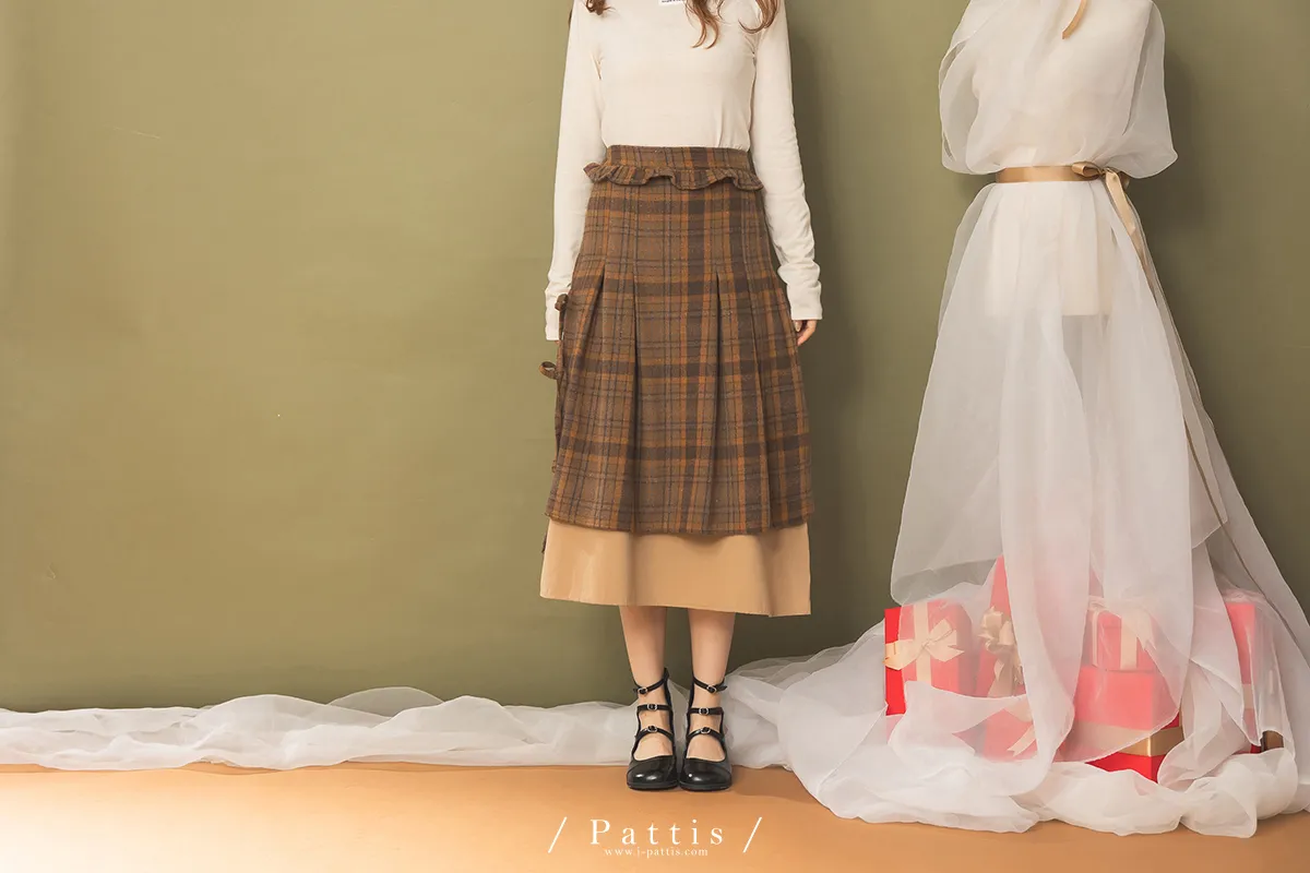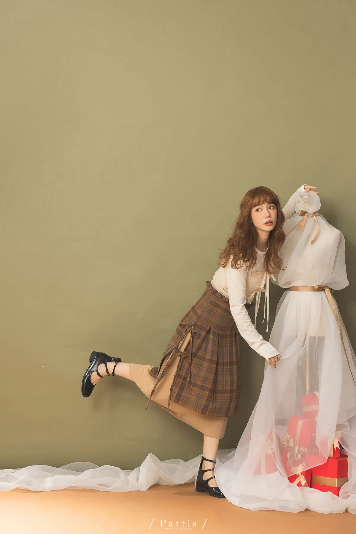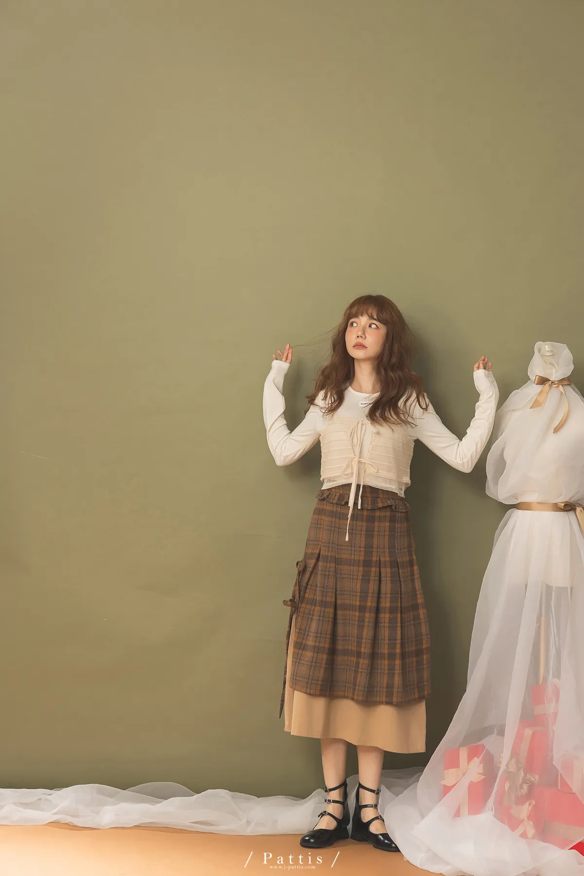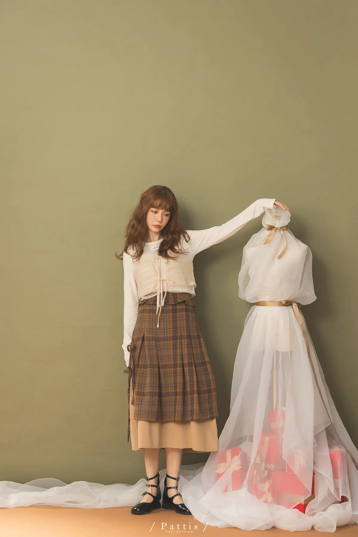太妃糖包裝紙 | 雙層抓皺格紋綁帶傘裙(棕)