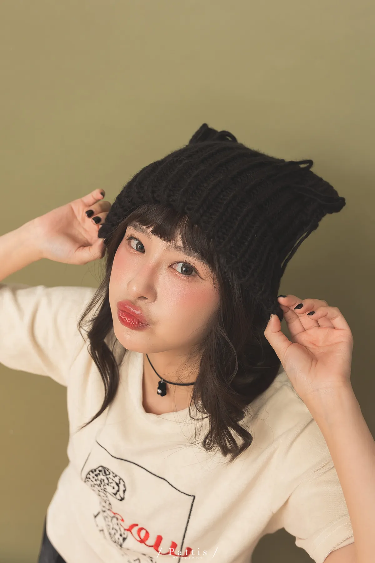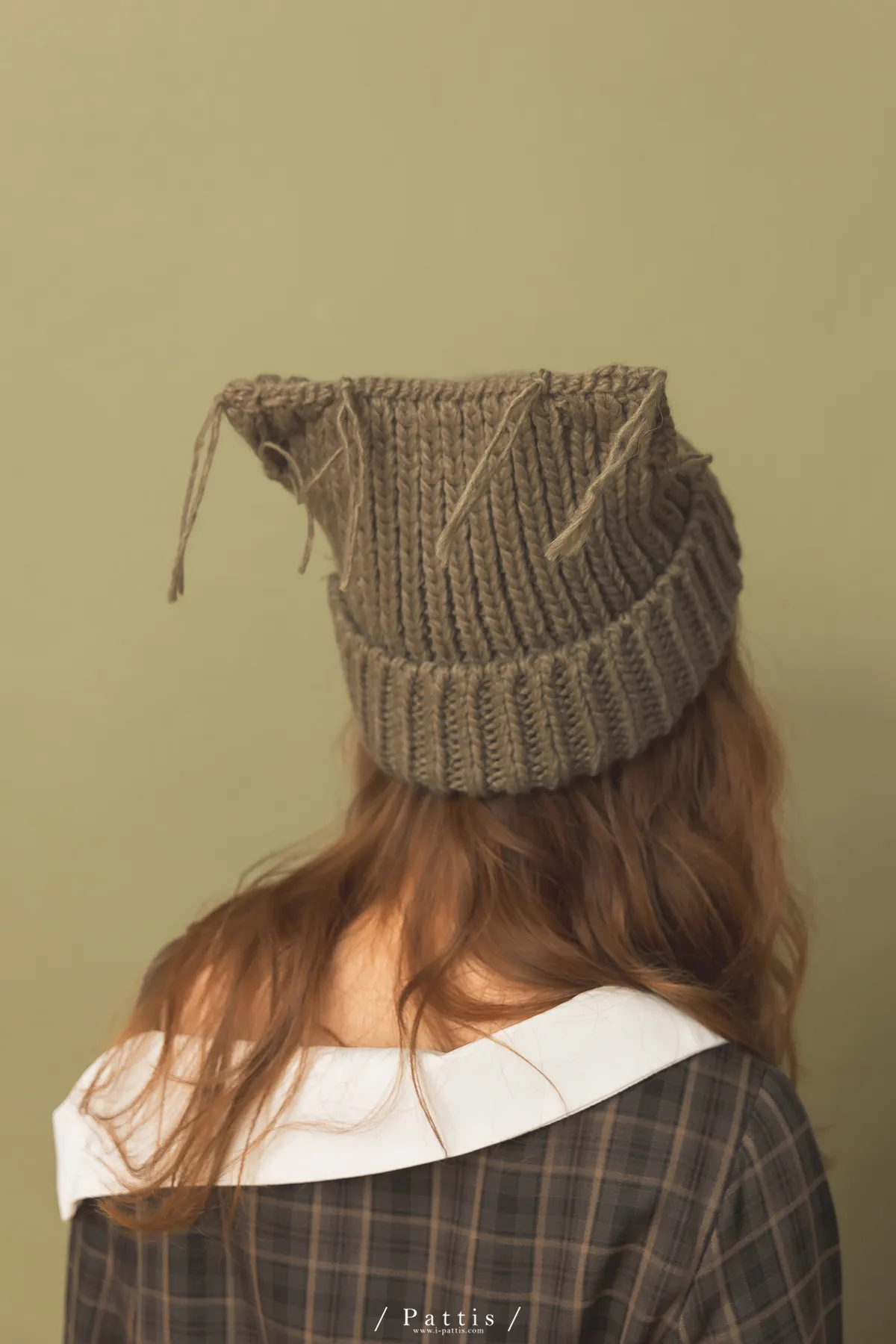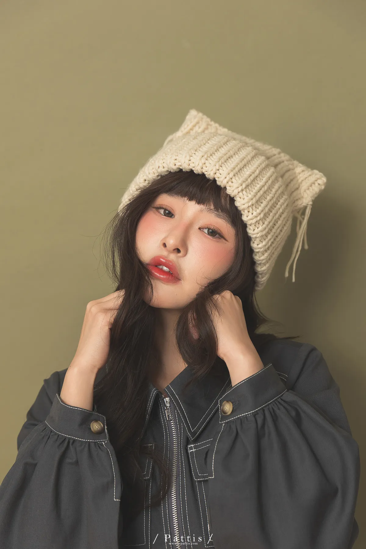 麻花流蘇貓耳毛線帽(米杏/綠/灰黑)