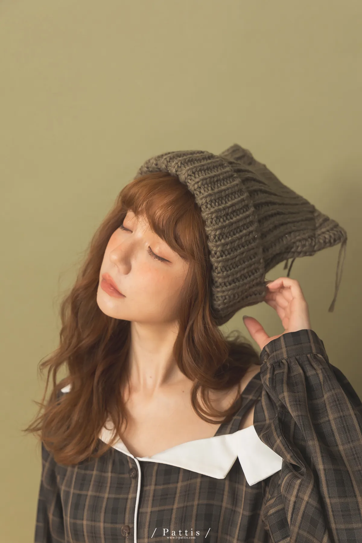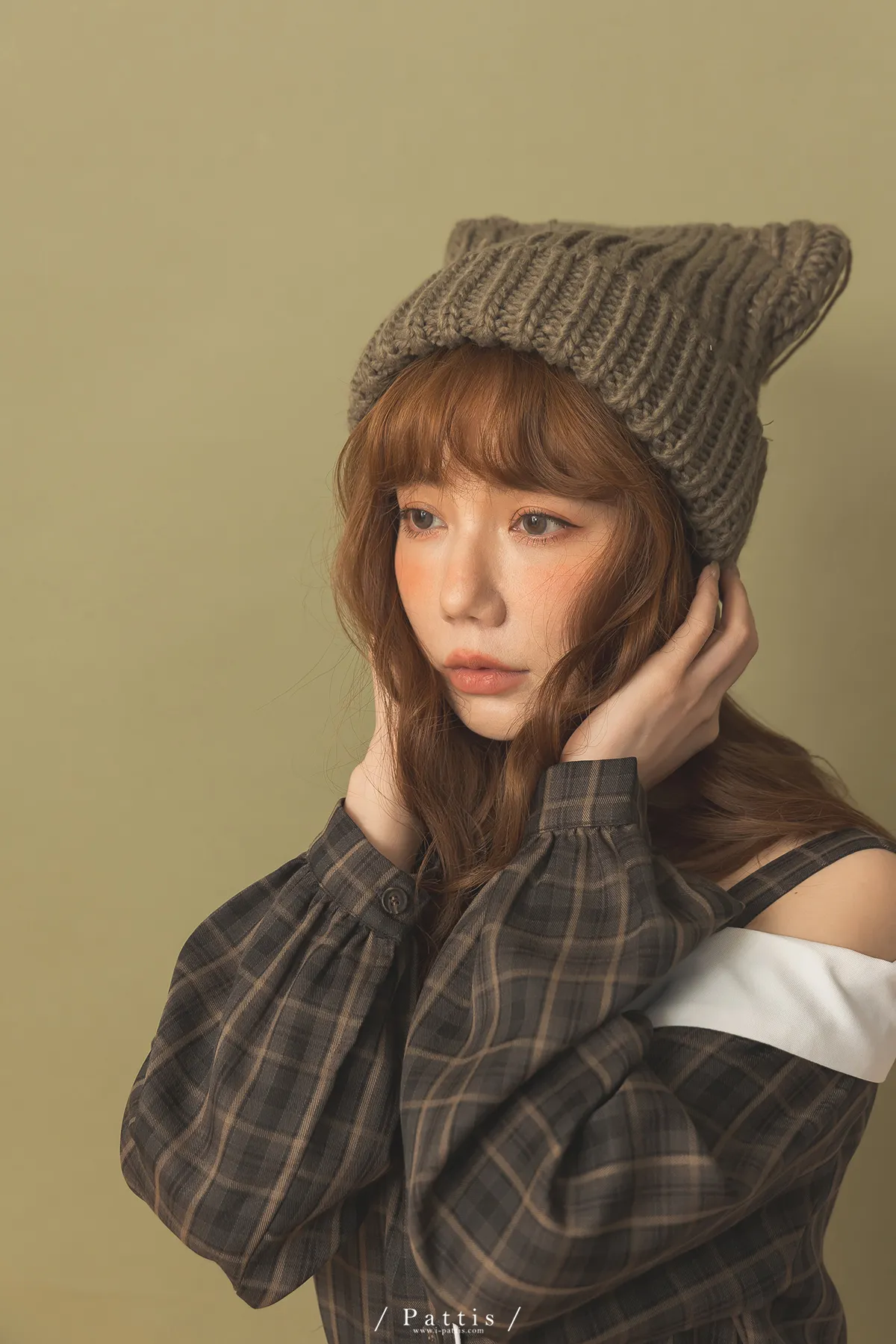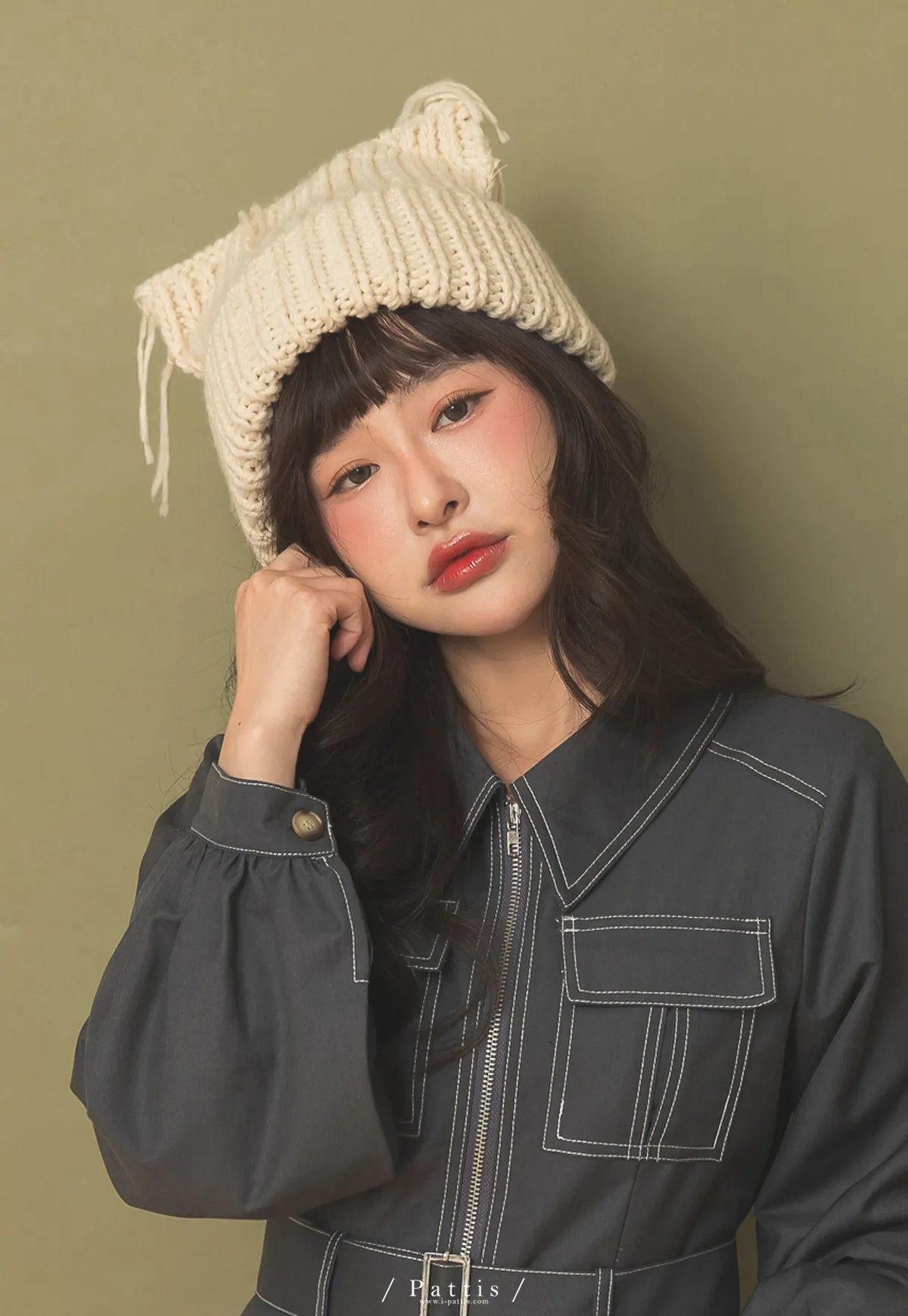 麻花流蘇貓耳毛線帽(米杏/綠/灰黑)