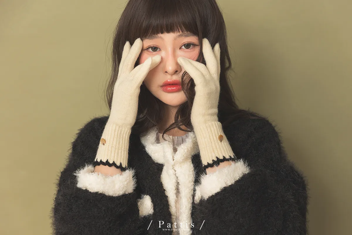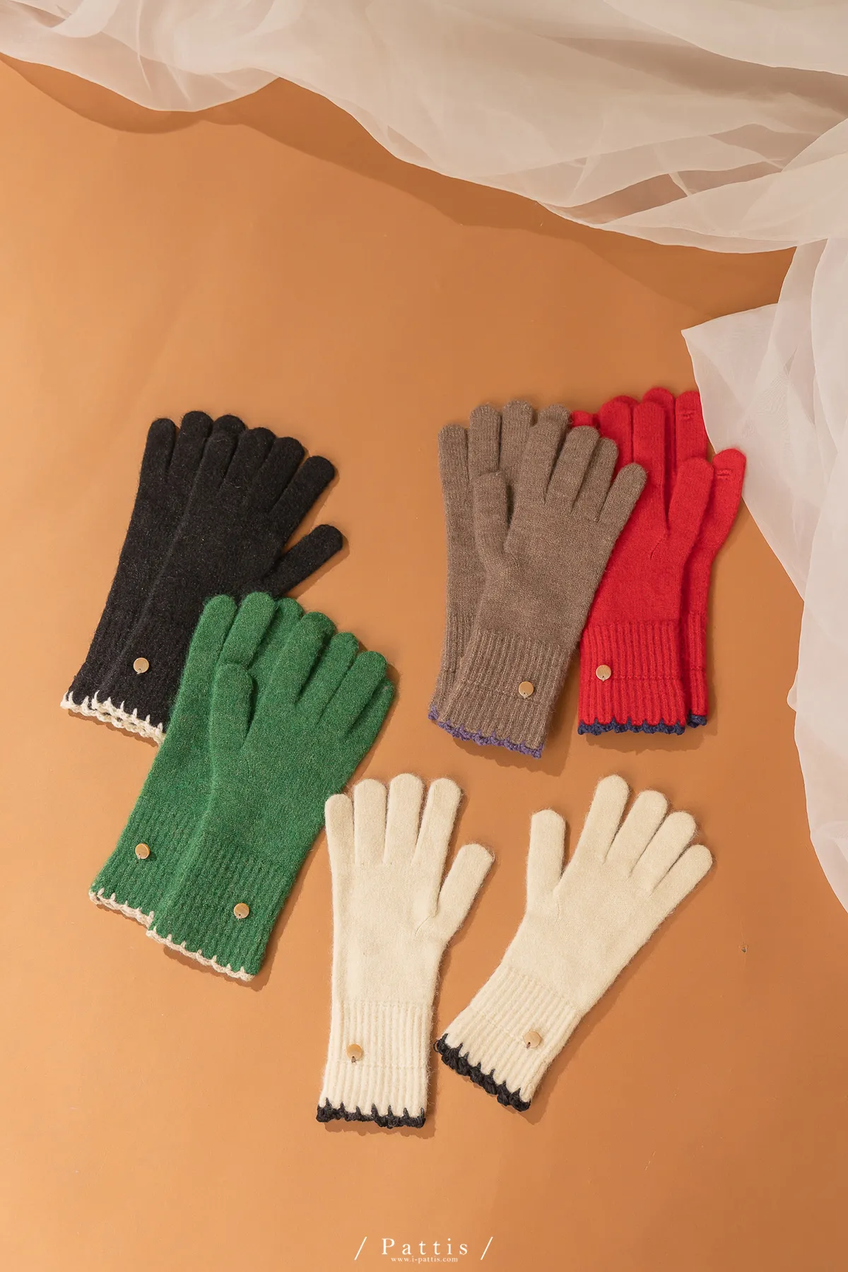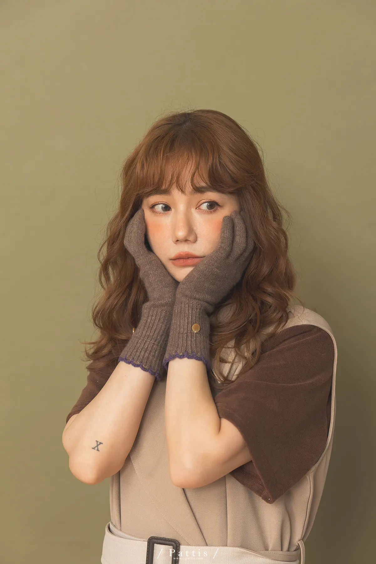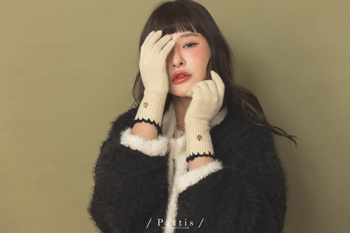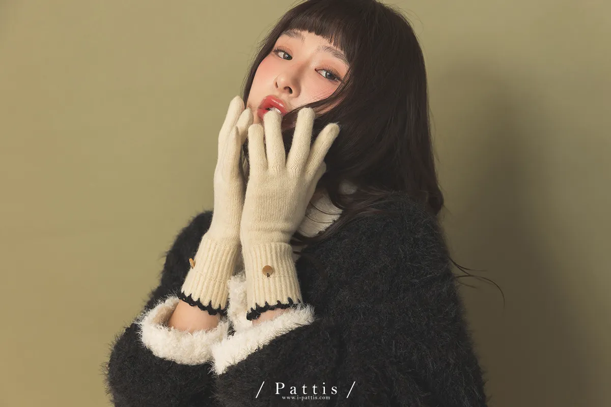 花瓣滾邊雙色羊毛不刺癢手套(奶白/棕/綠/紅/黑)