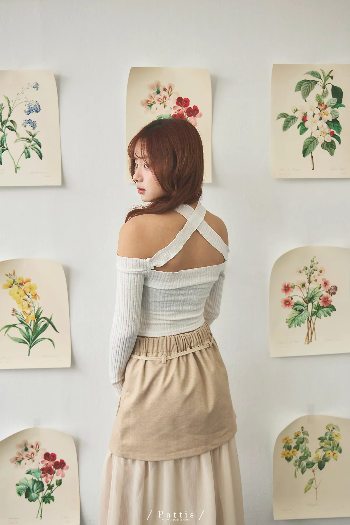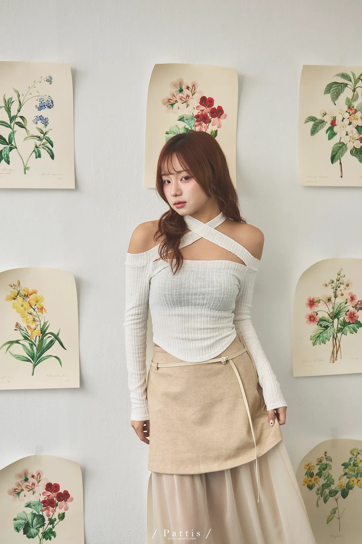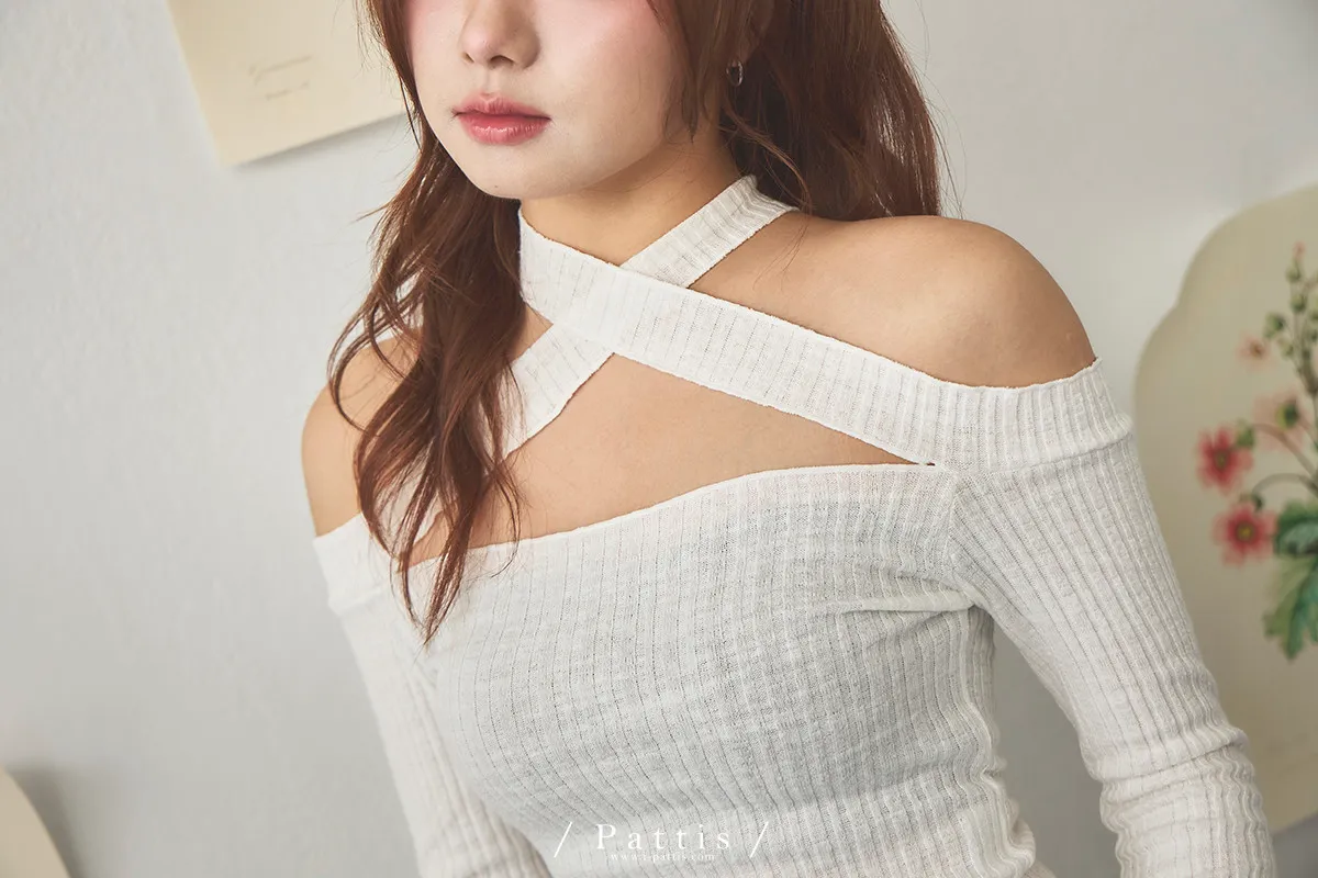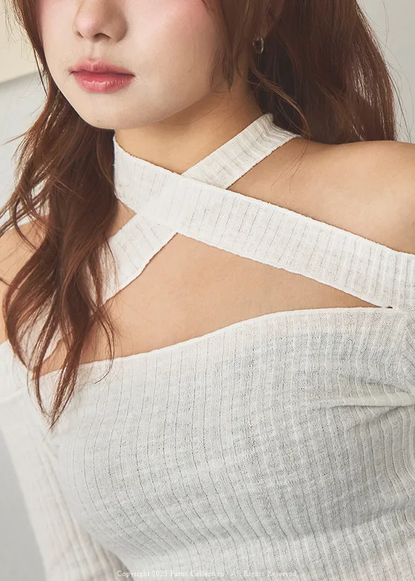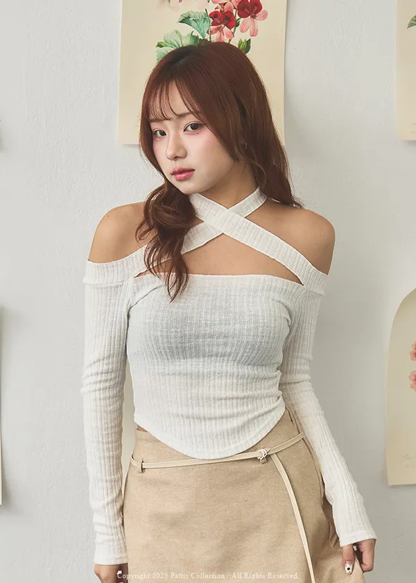 不放手的擁抱 | 交叉造型羅紋一字領長袖上衣(白)