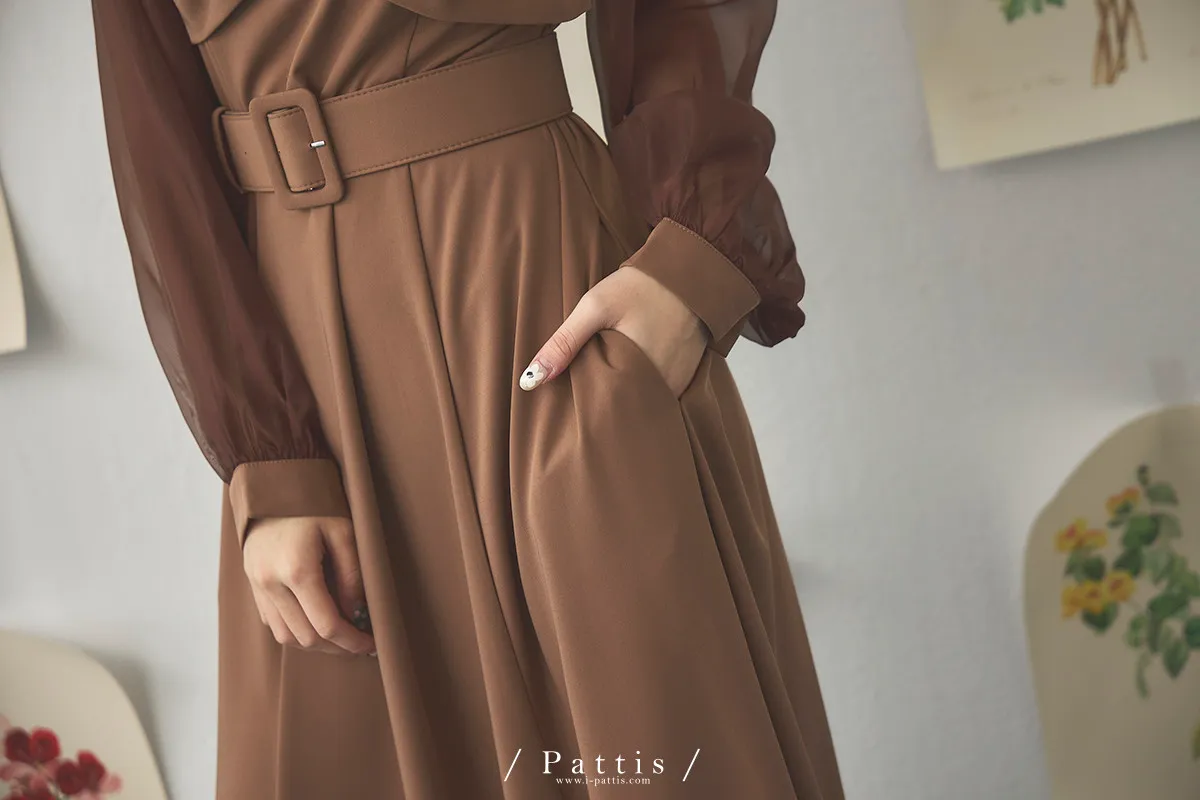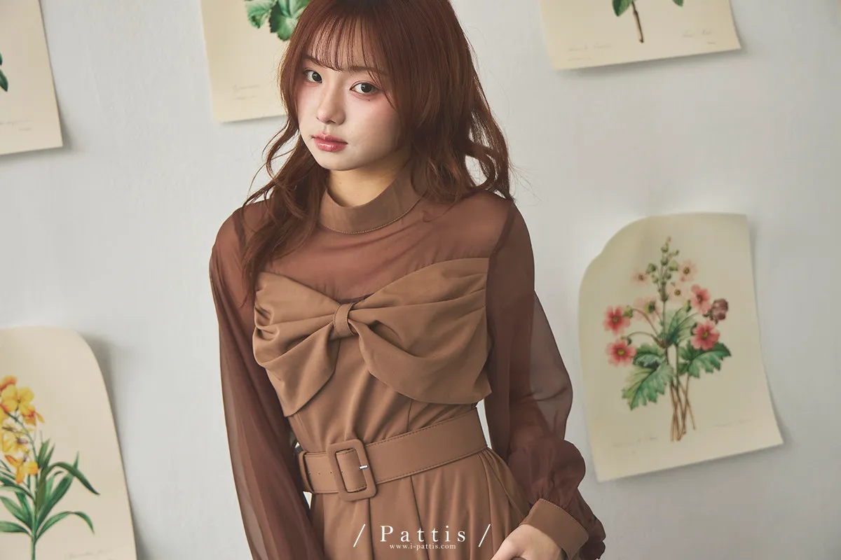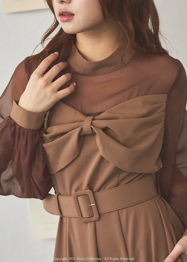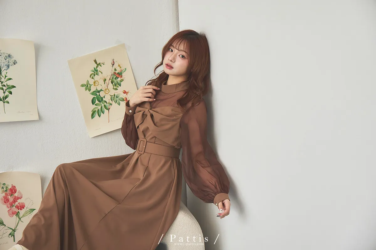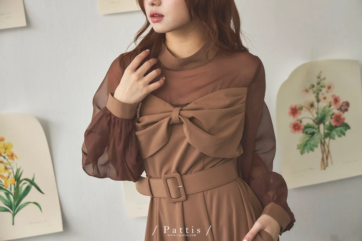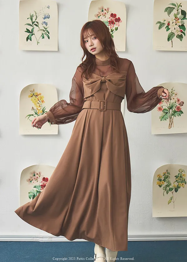 含咖啡因的糖果 | 扭結桃心透肌拼紗洋裝(橘棕)