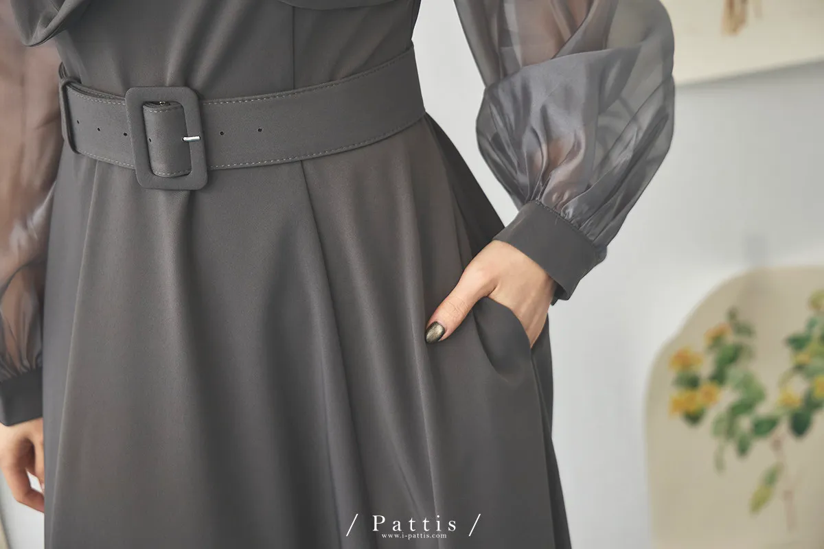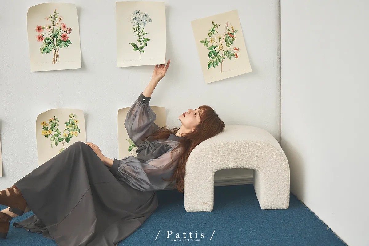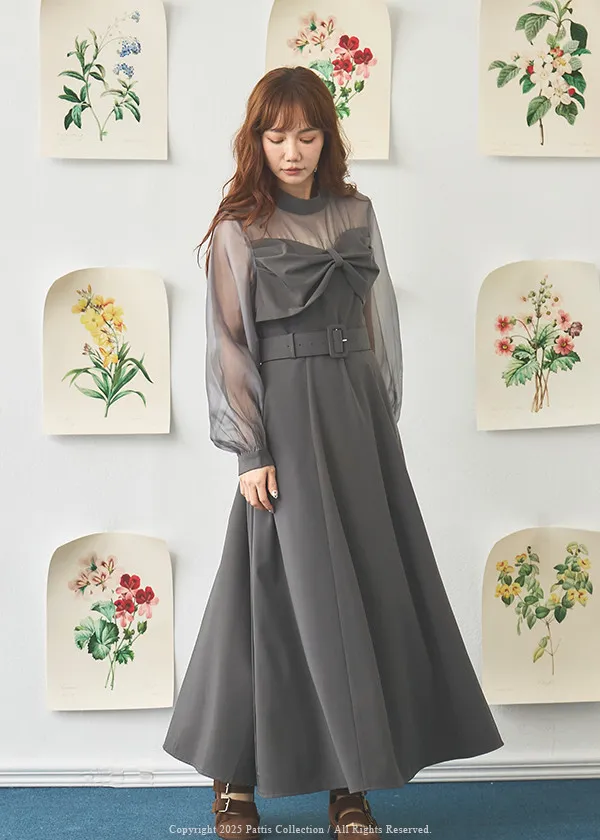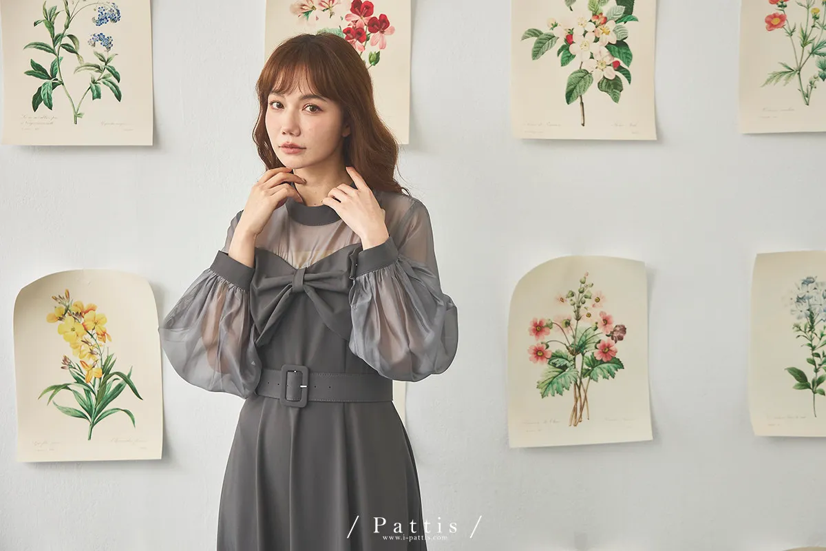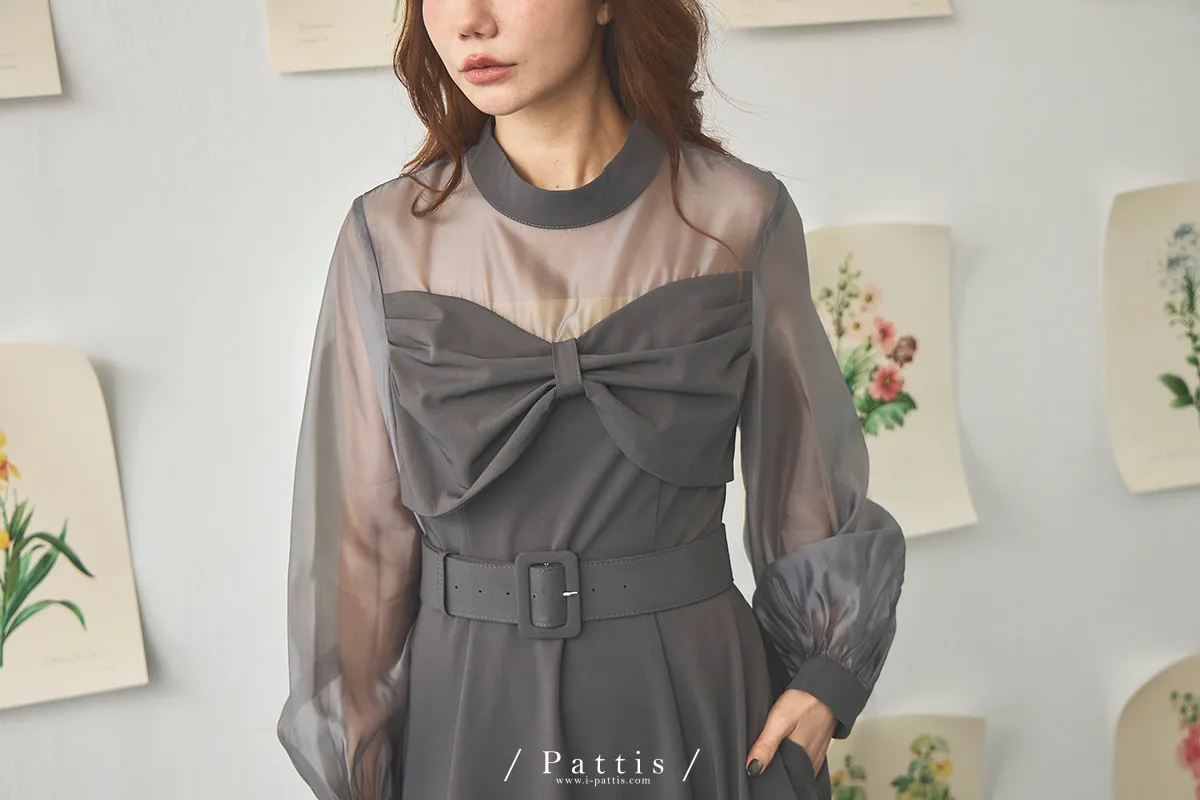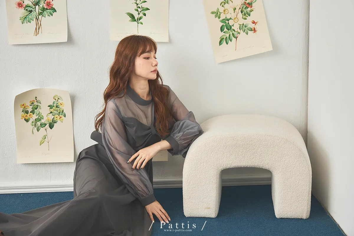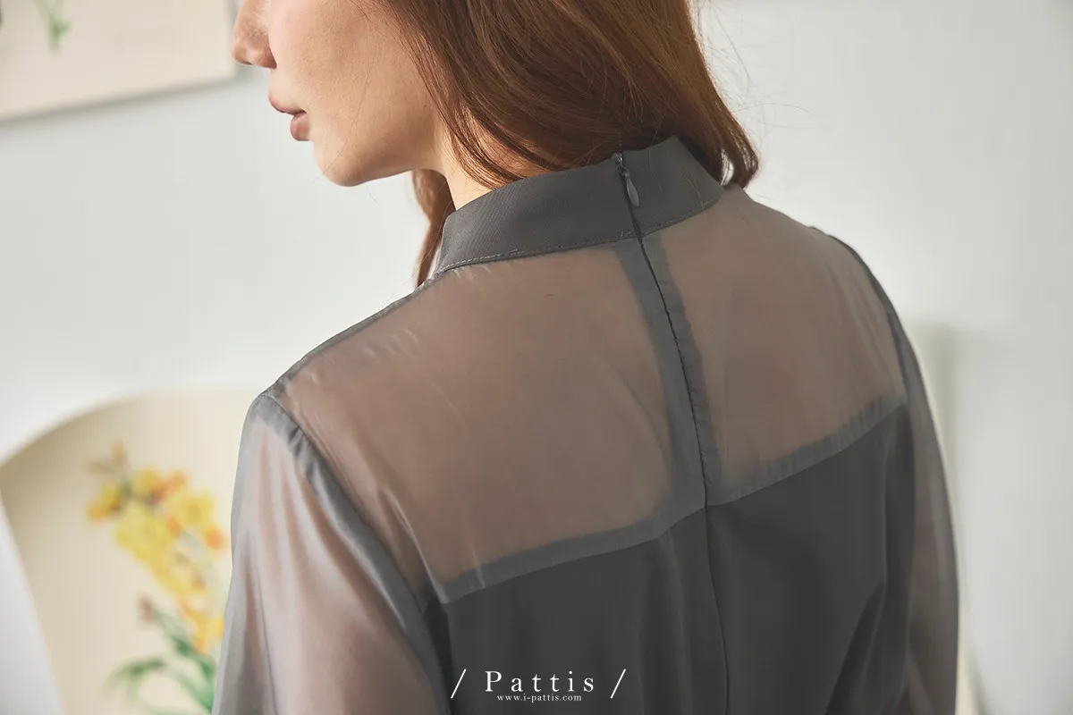 含咖啡因的糖果 | 扭結桃心透肌拼紗洋裝(藍灰)