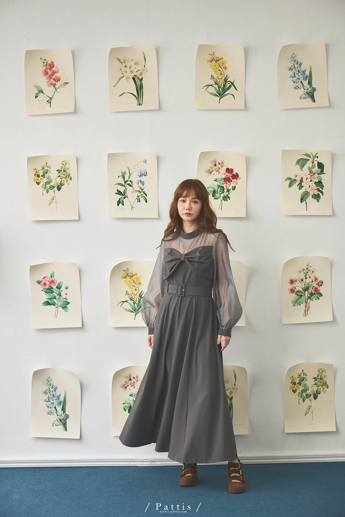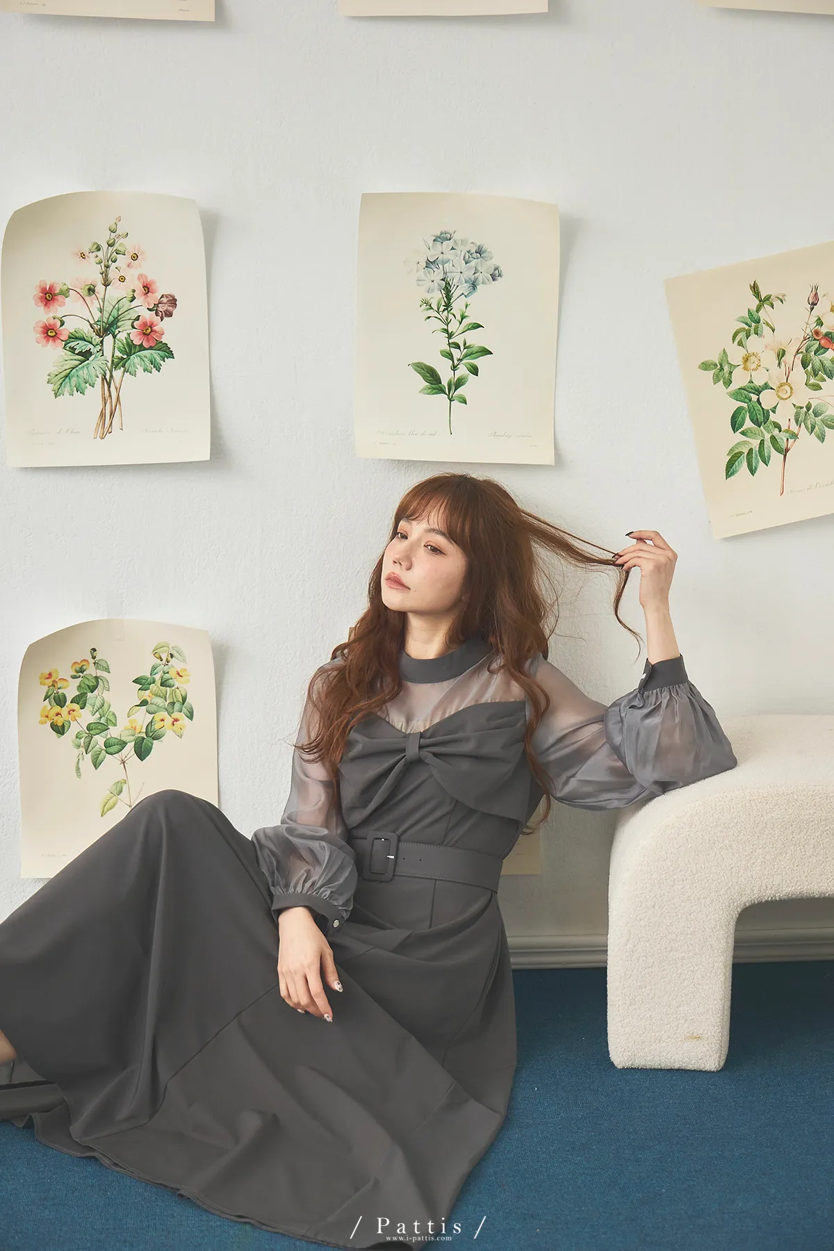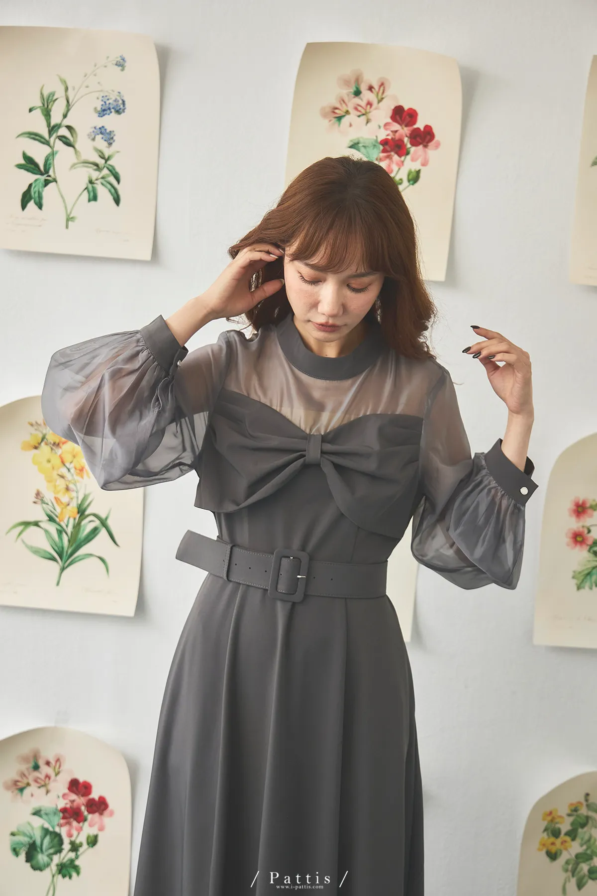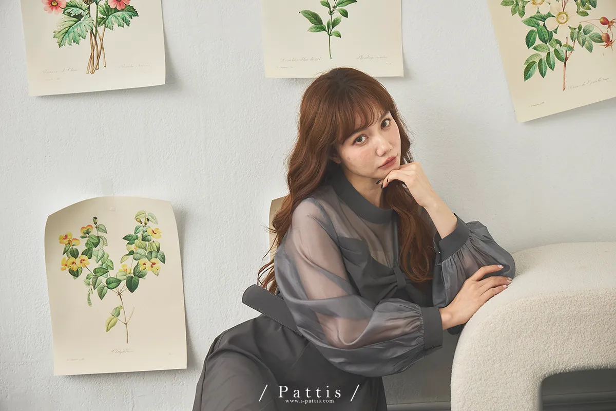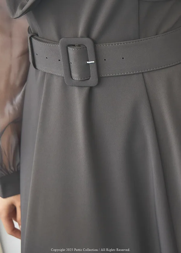 含咖啡因的糖果 | 扭結桃心透肌拼紗洋裝(藍灰)