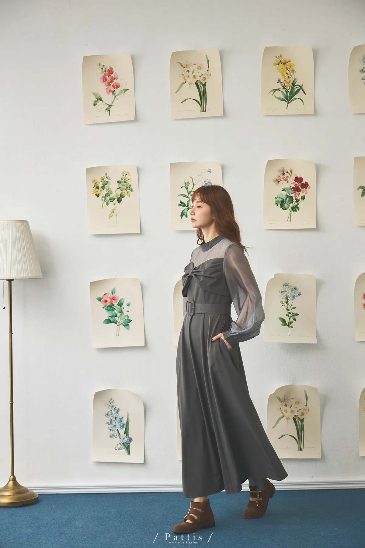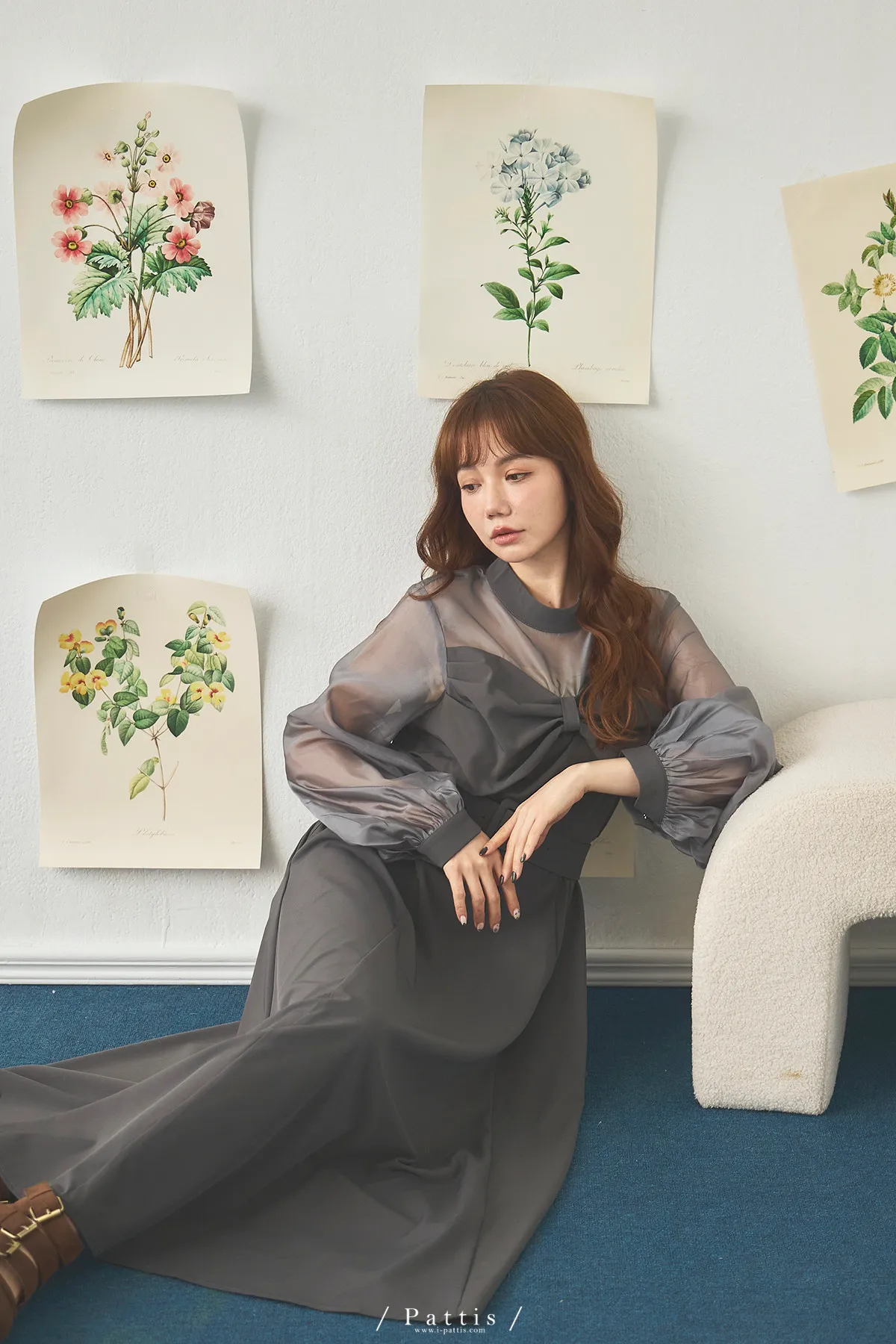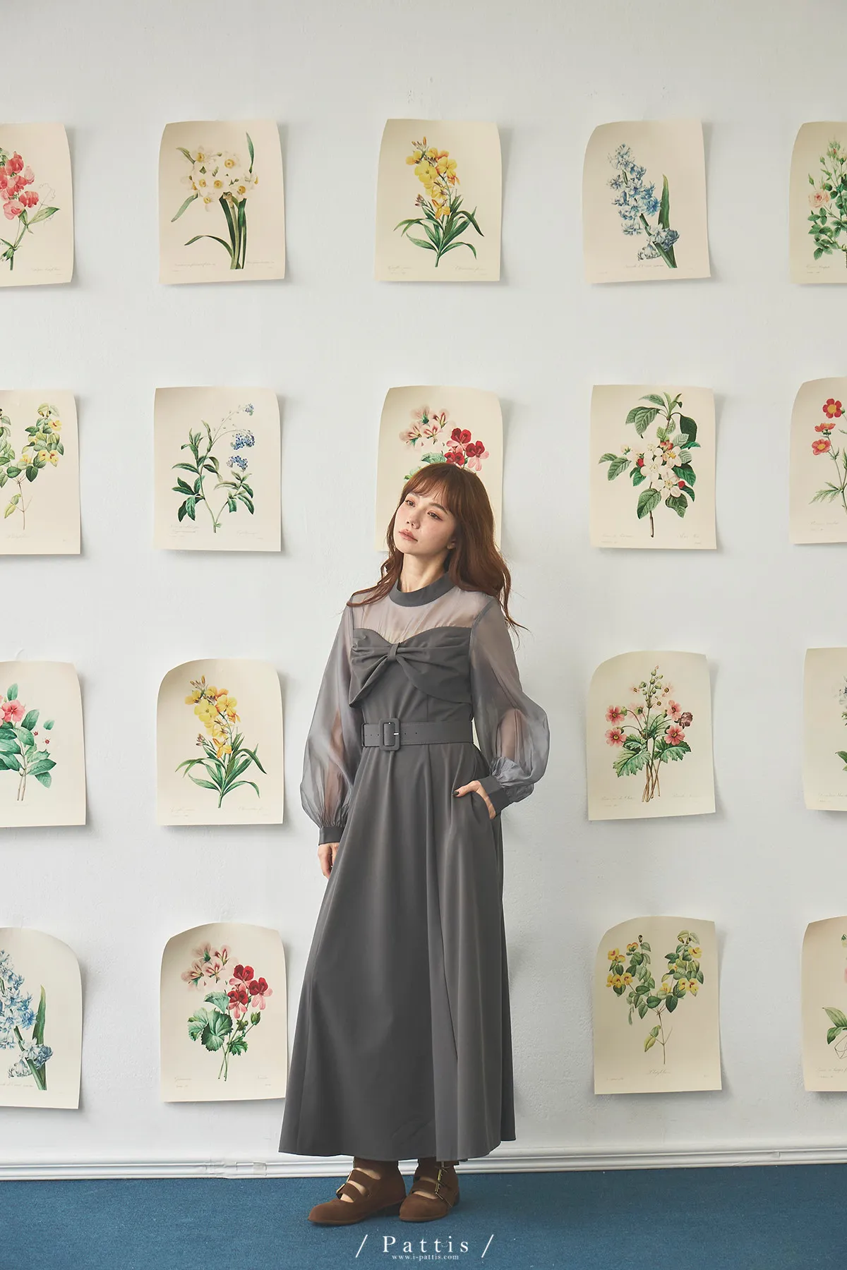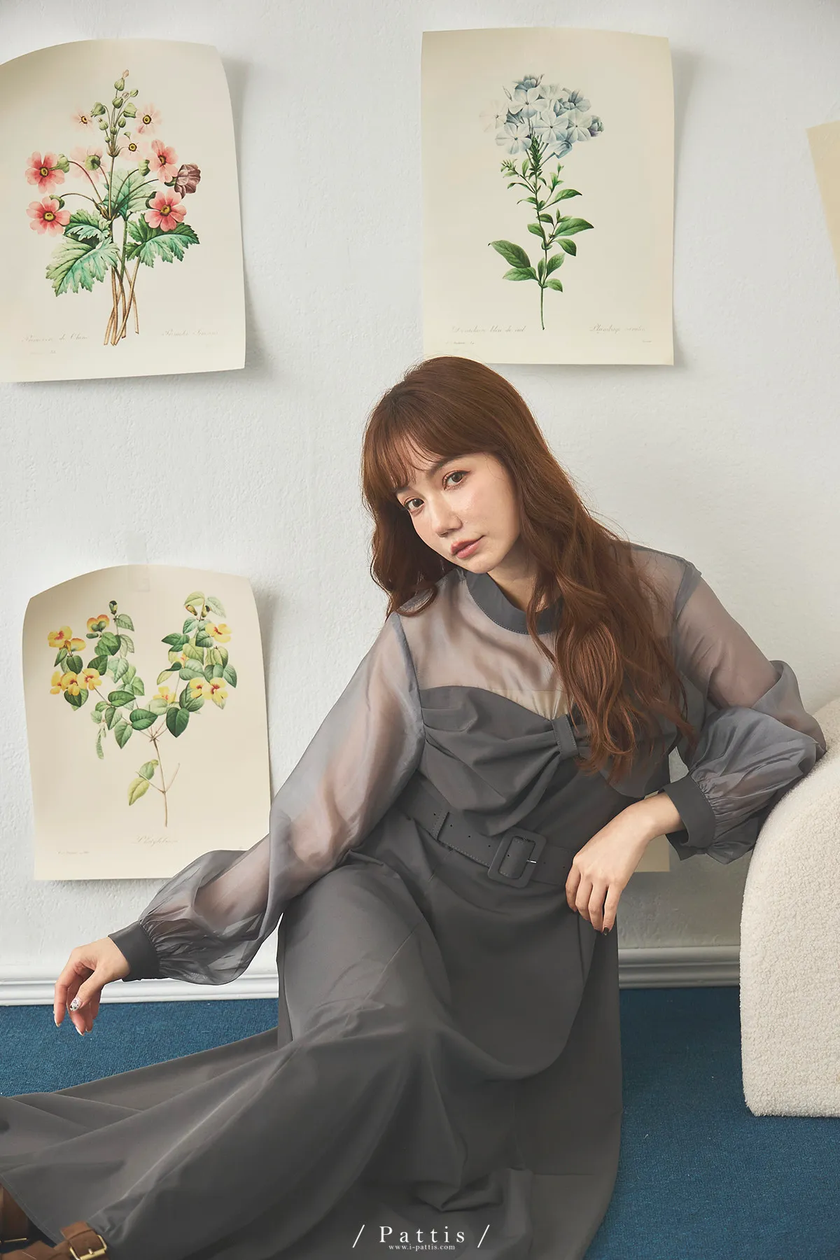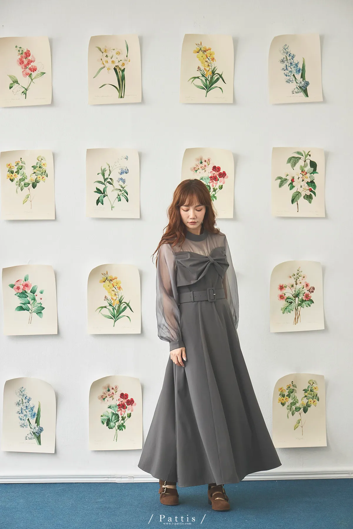 含咖啡因的糖果 | 扭結桃心透肌拼紗洋裝(藍灰)